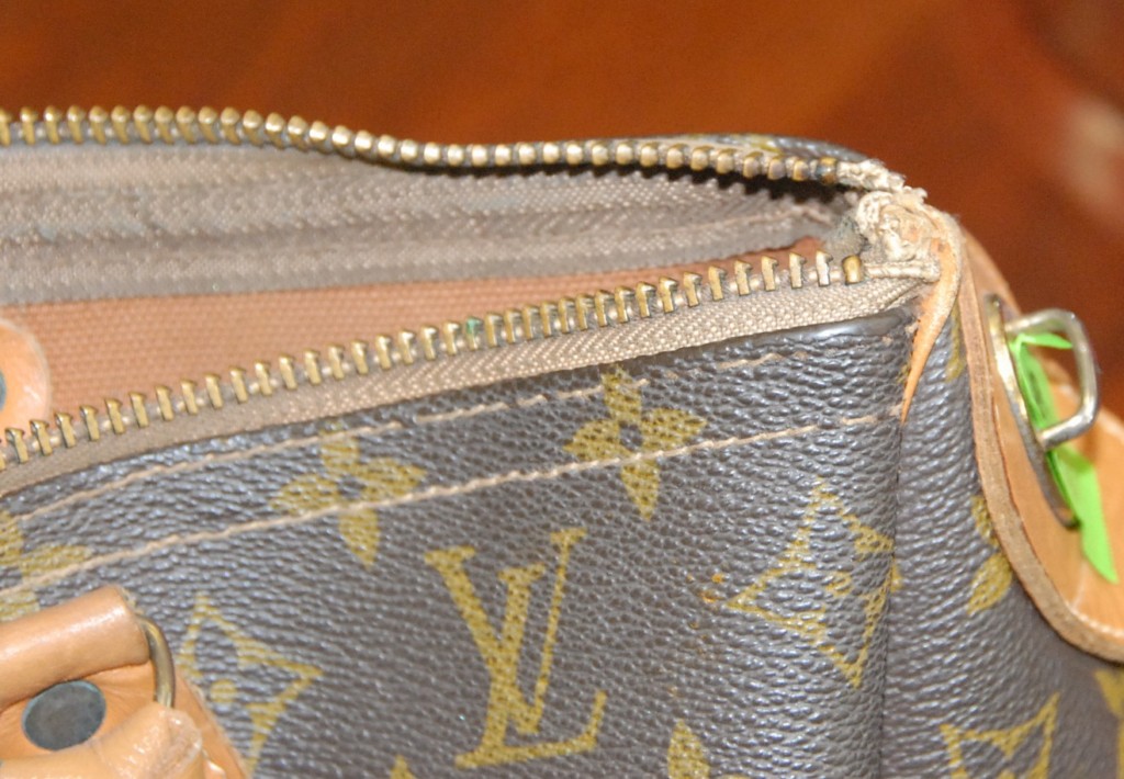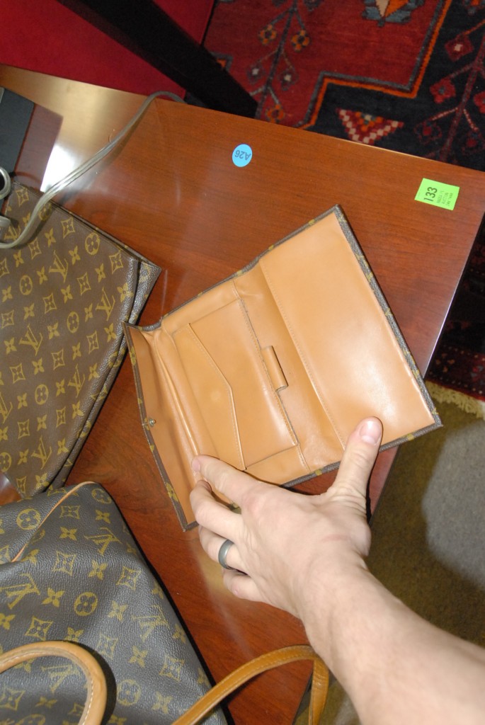Group of three Louis Vuitton pieces to include a vintage handbag, wallet, and cosmetic bag.