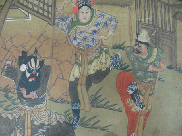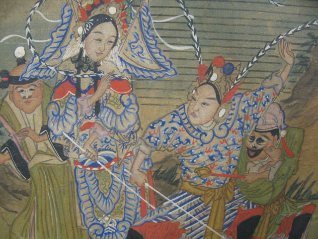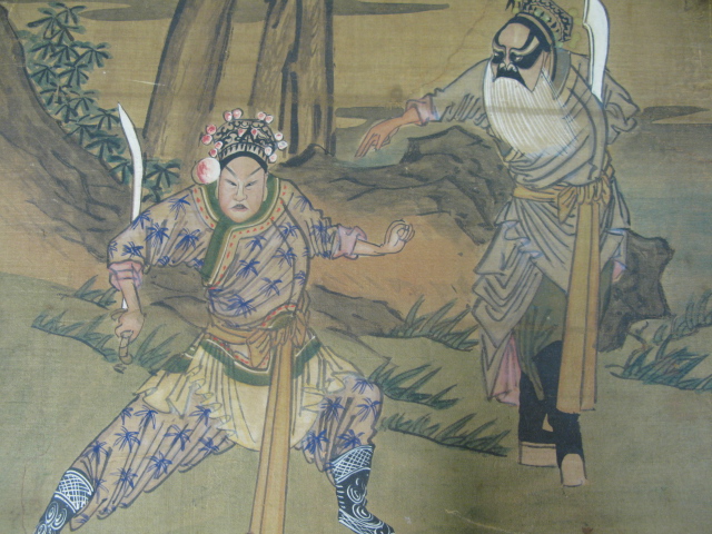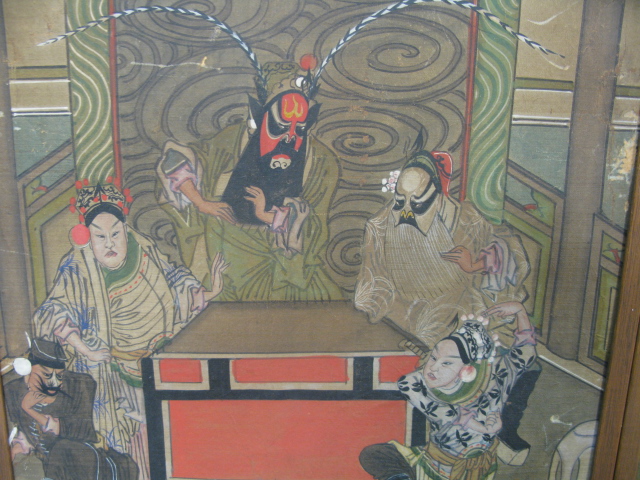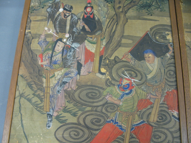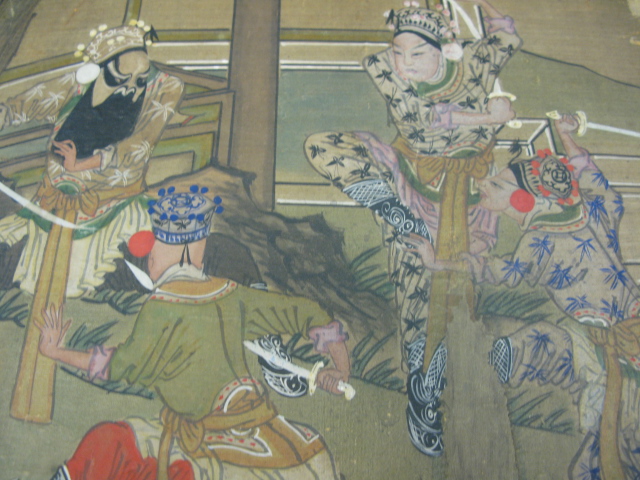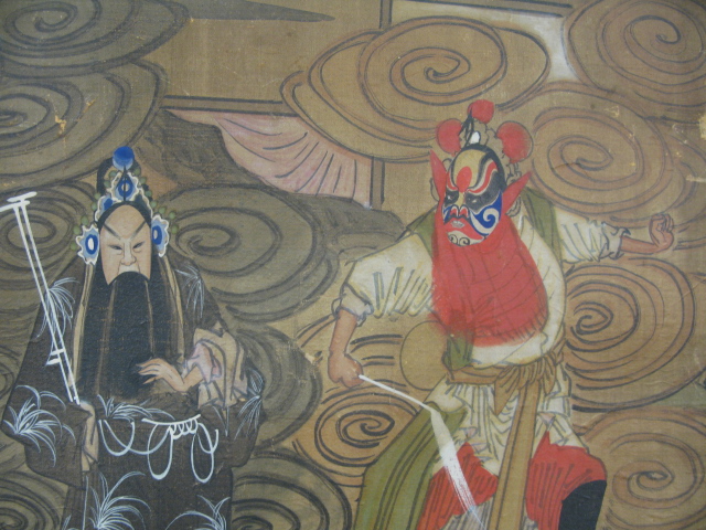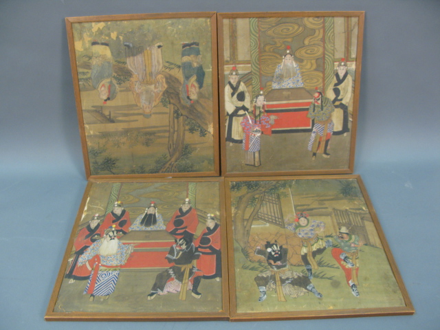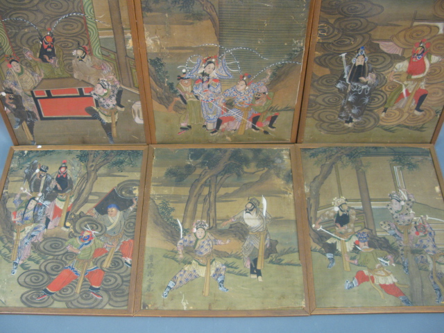 Oriental set of ten small paintings on silk, mounted on cardboard, having different immortal scenes.