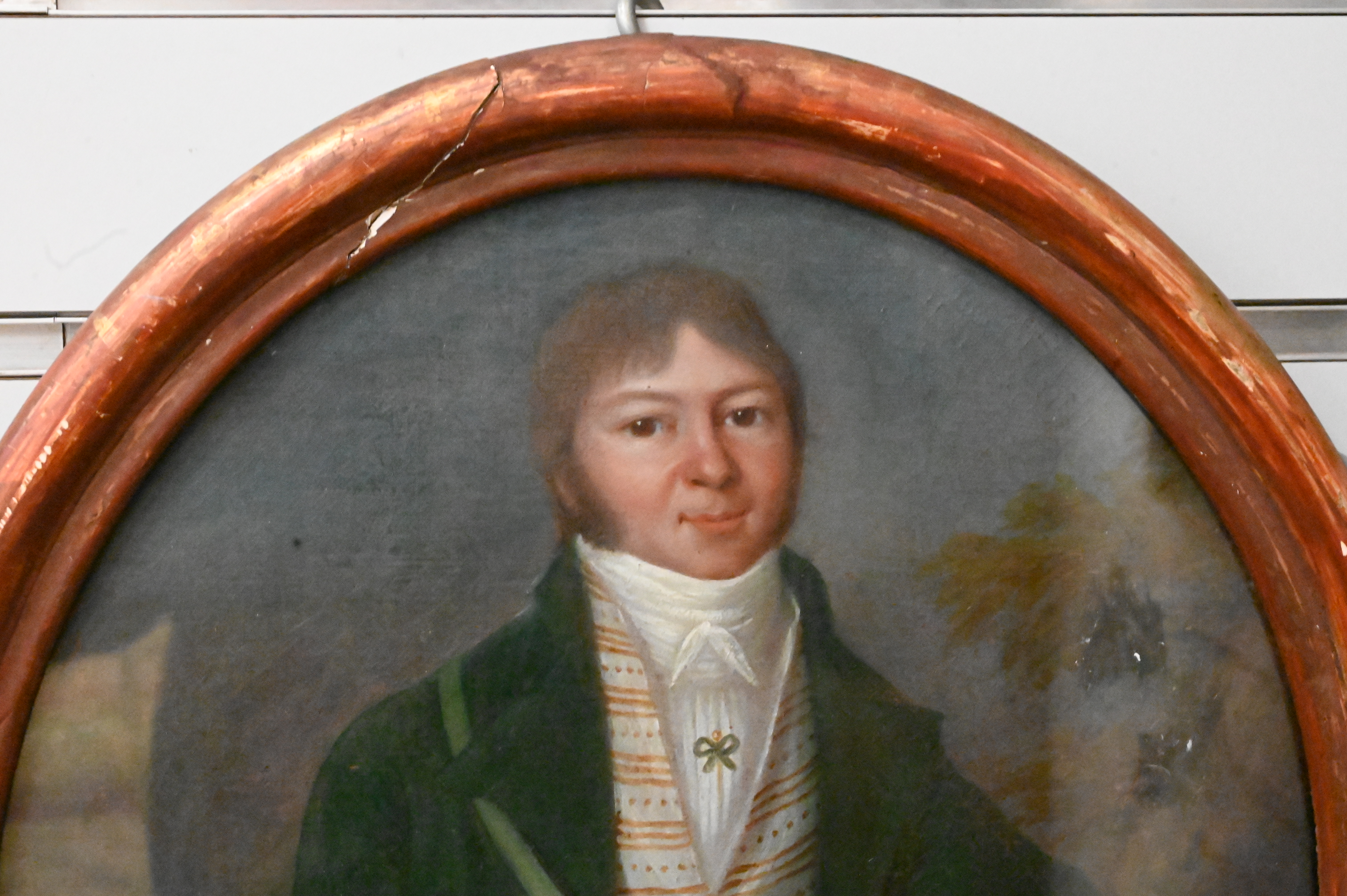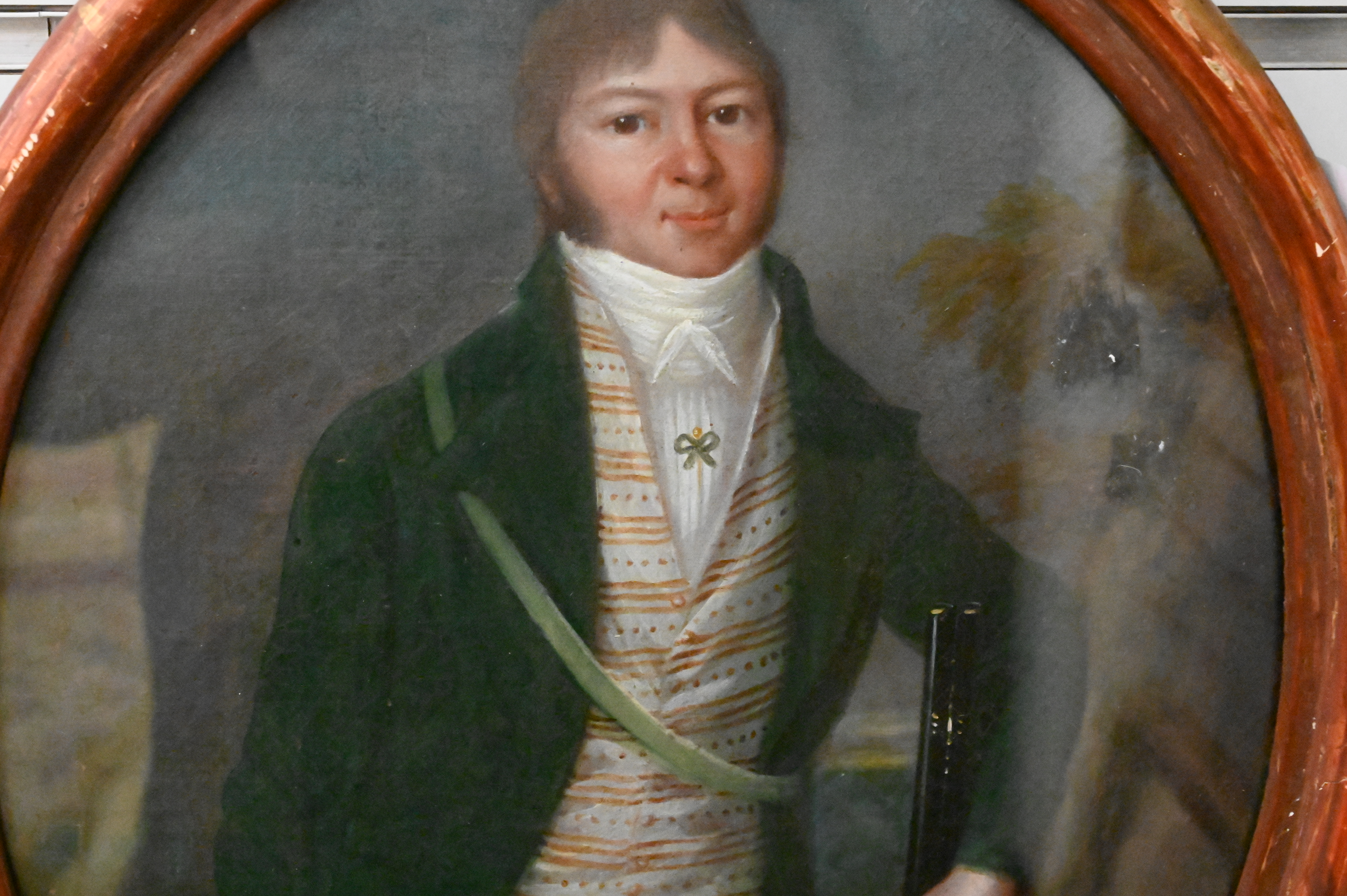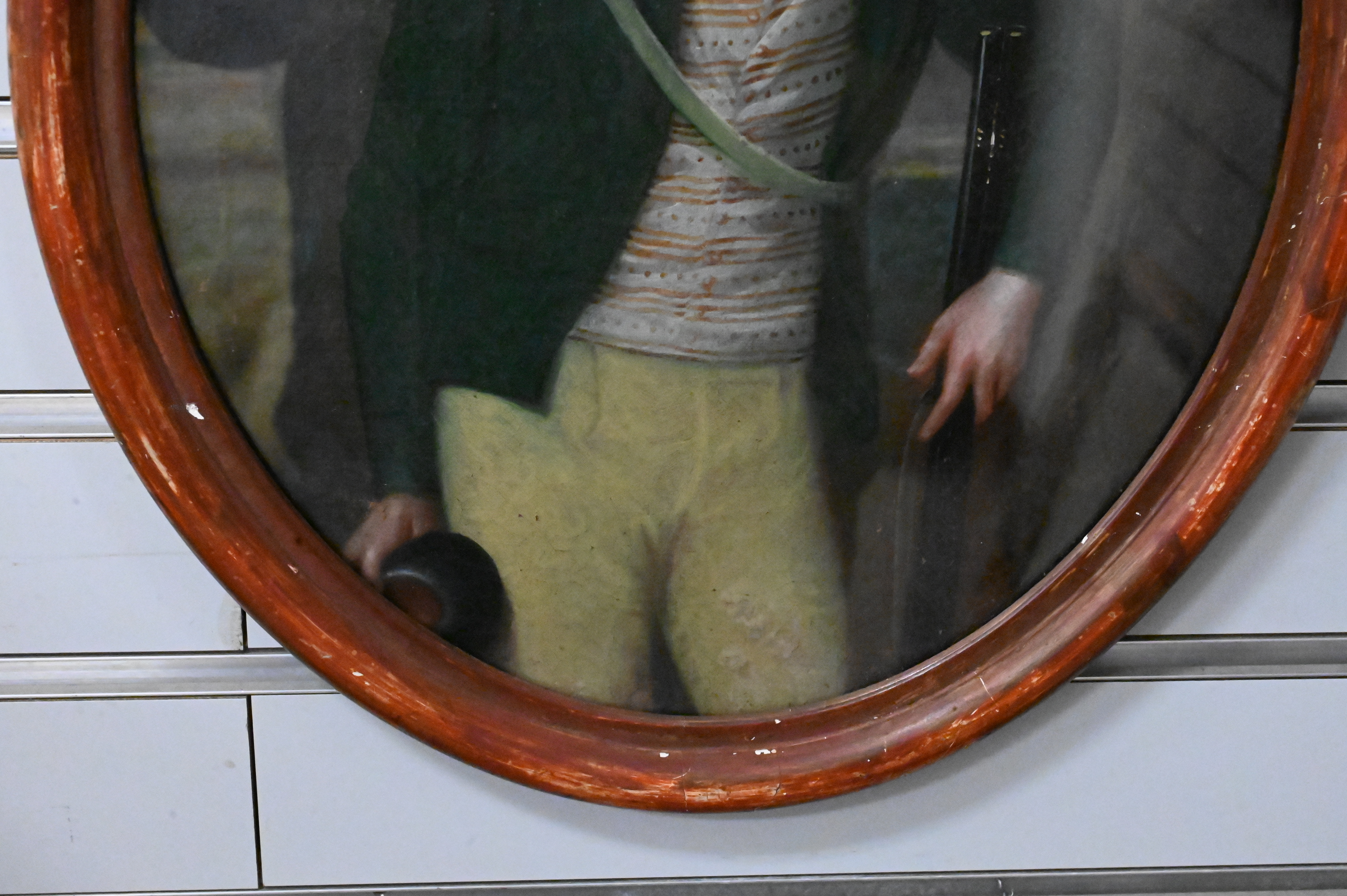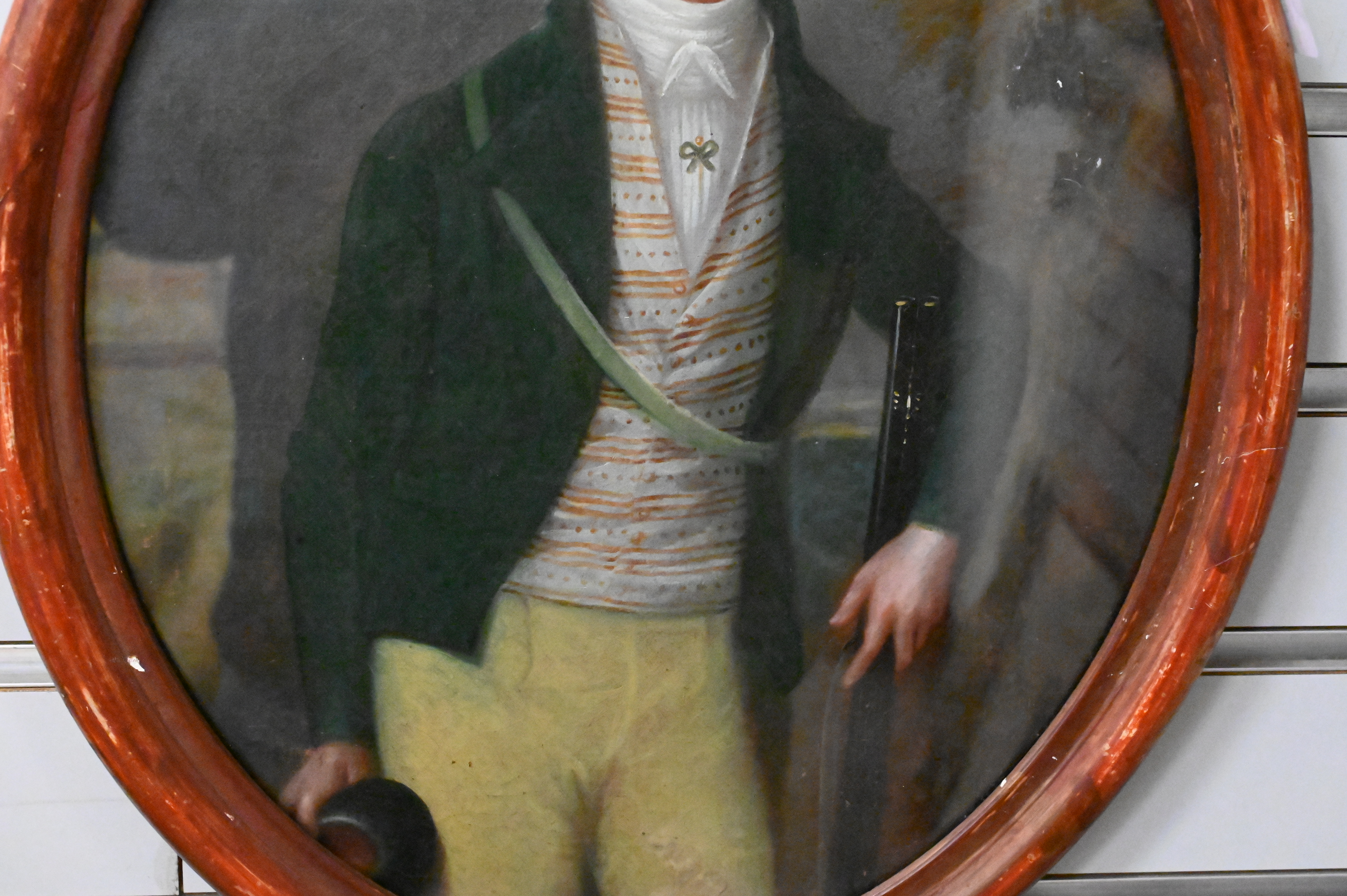 Oval Portrait of a Hunter, 18th/19th century, wearing green and holding a shotgun, unsigned, 14 1/2″ x 12″.
