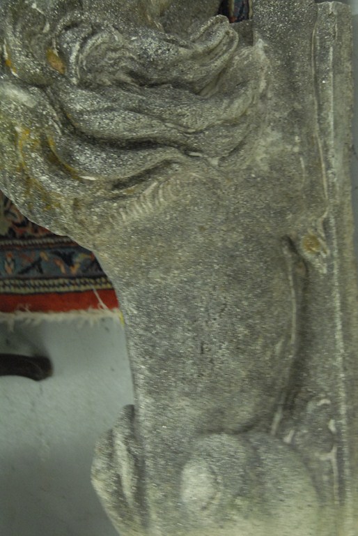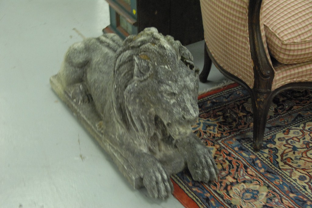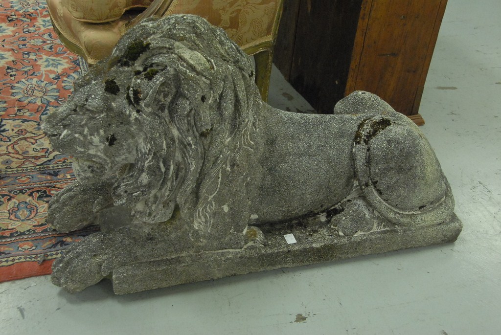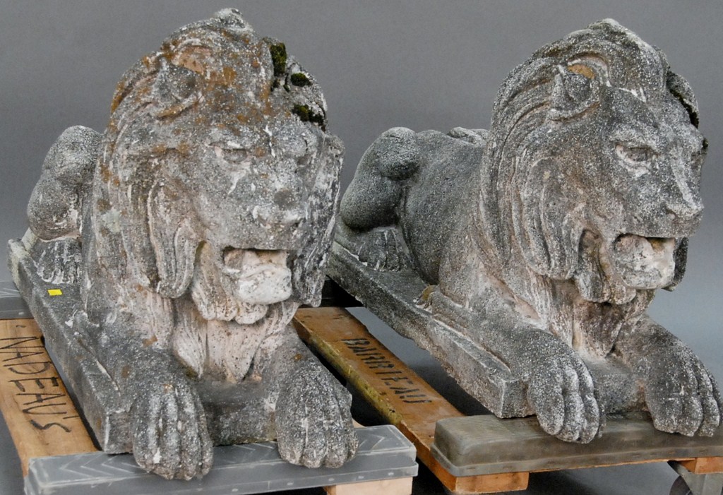 Pair of limestone reclining male lions. ht. 21in. lg. 36in.