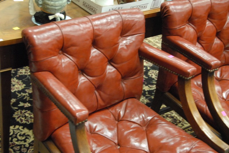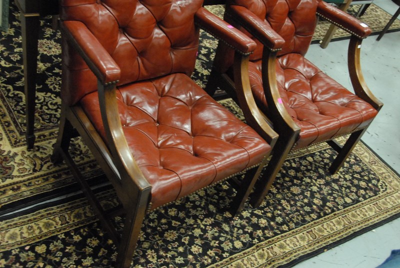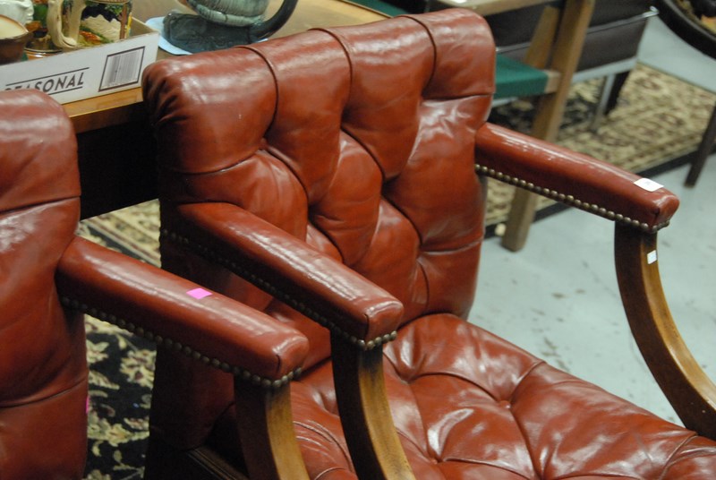 Pair of tufted leather Chippendale style armchairs three buttons are missing leather.