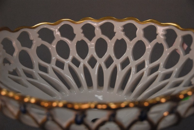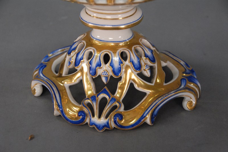 Porcelain reticulated compote with open work, gilt decorated handles, all over highlighted gilt and blue, made in two parts, excellent condition. lg. 14 1/2in.