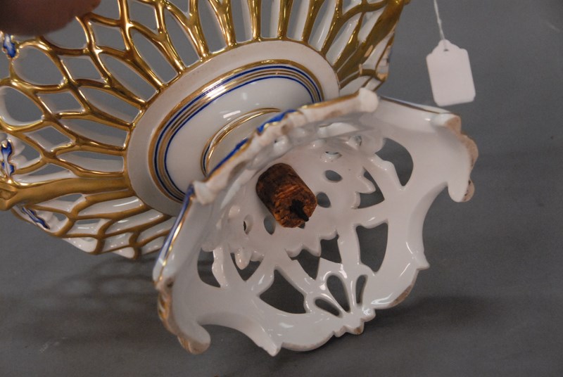 Lot 289: Porcelain reticulated compote with open work, gilt decorated handles, all over highlighted gilt and blue, made in two parts, excellent condition. lg. 14 1/2in.
