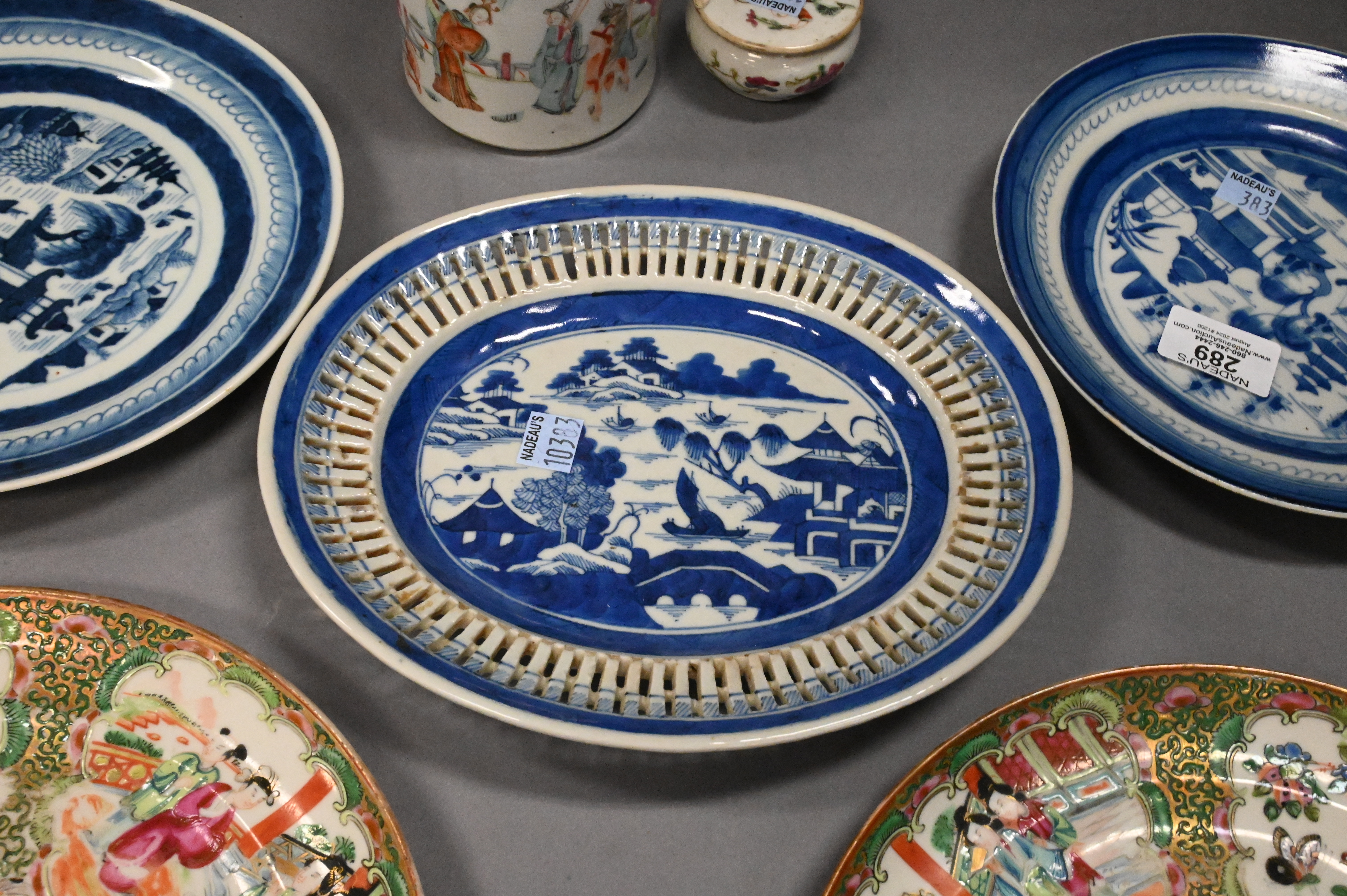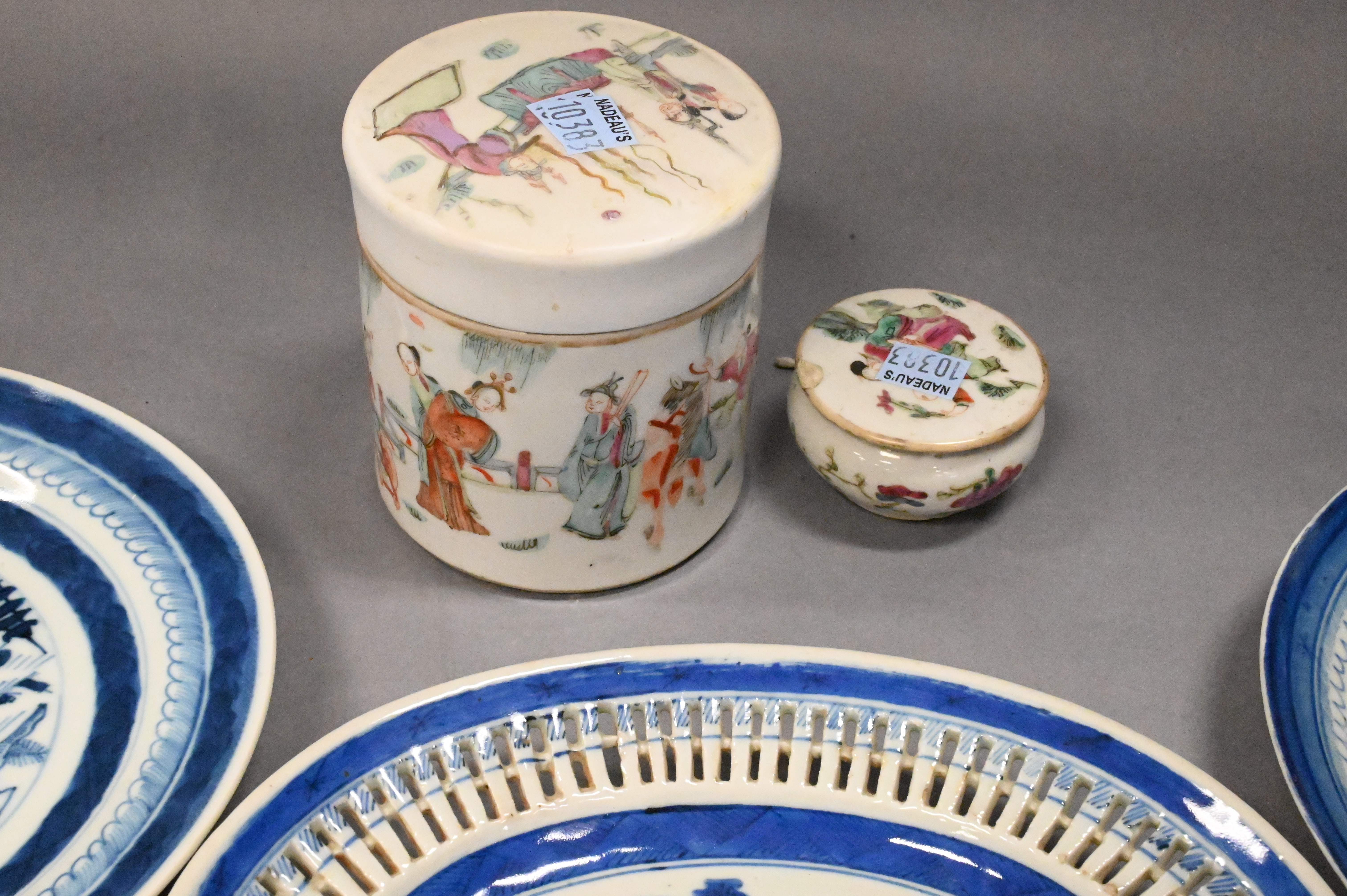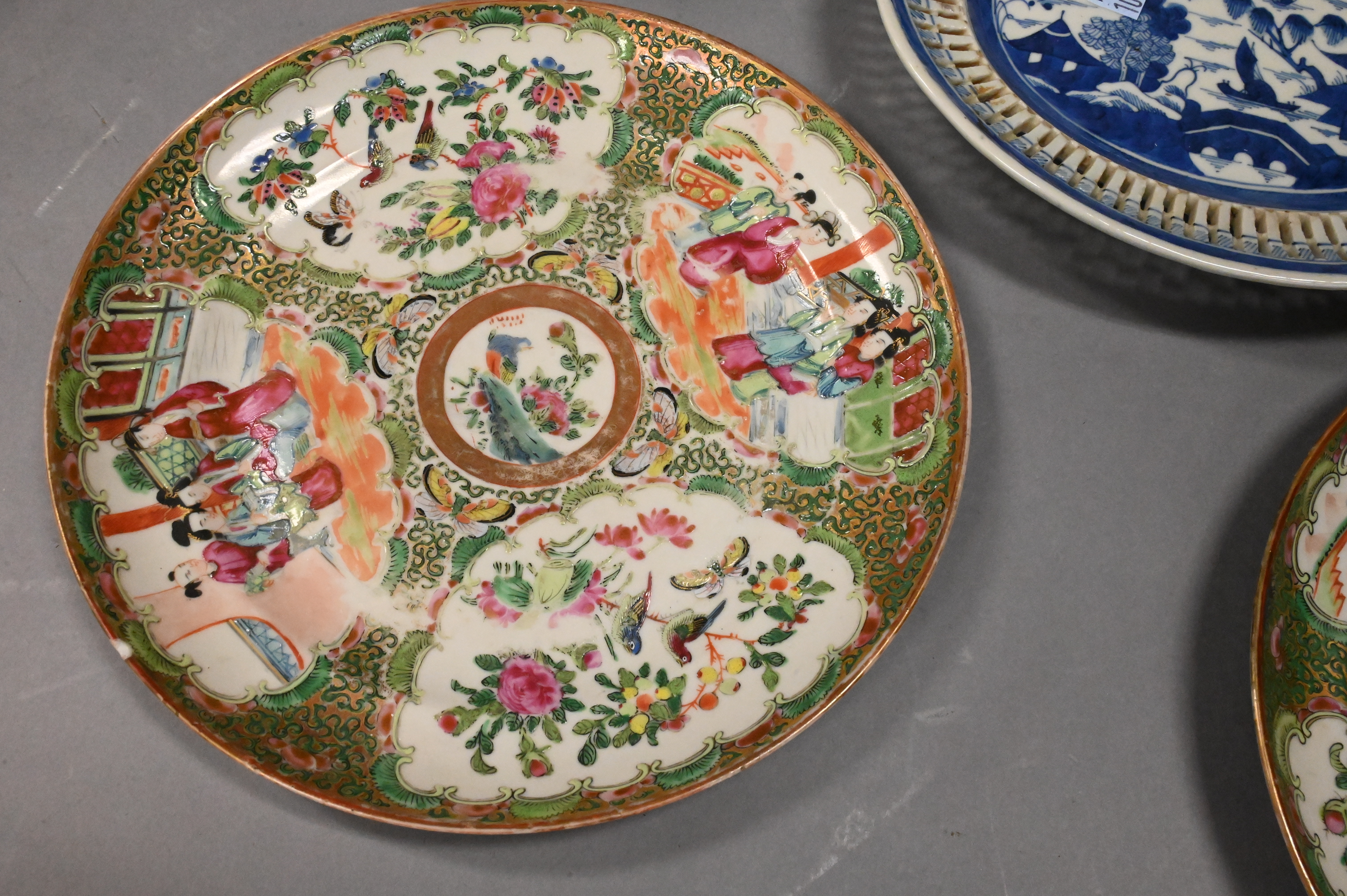Canton reticulated plate, two Canton plates, two rose medallion plates (chipped), two rose famille covered containers