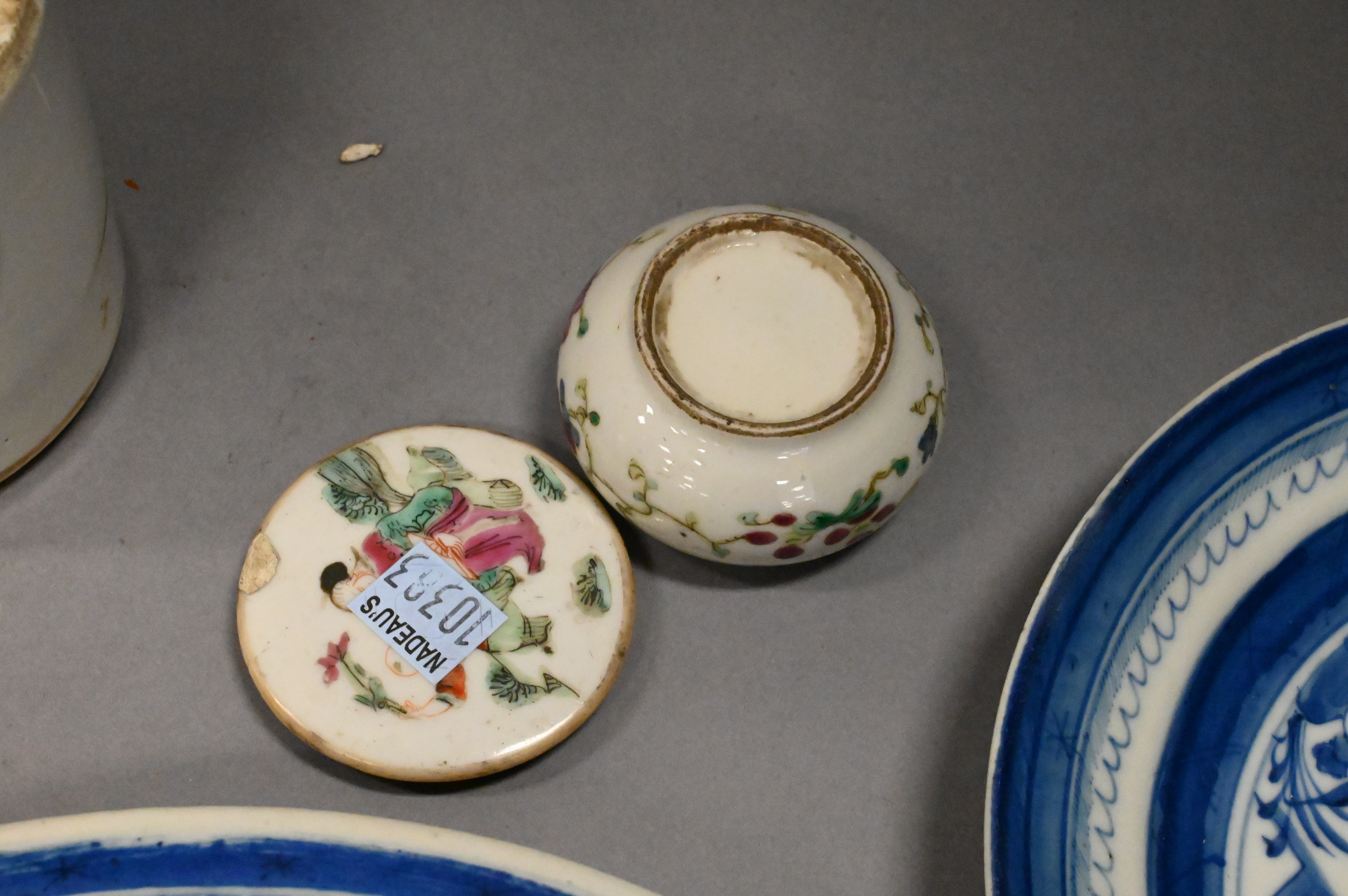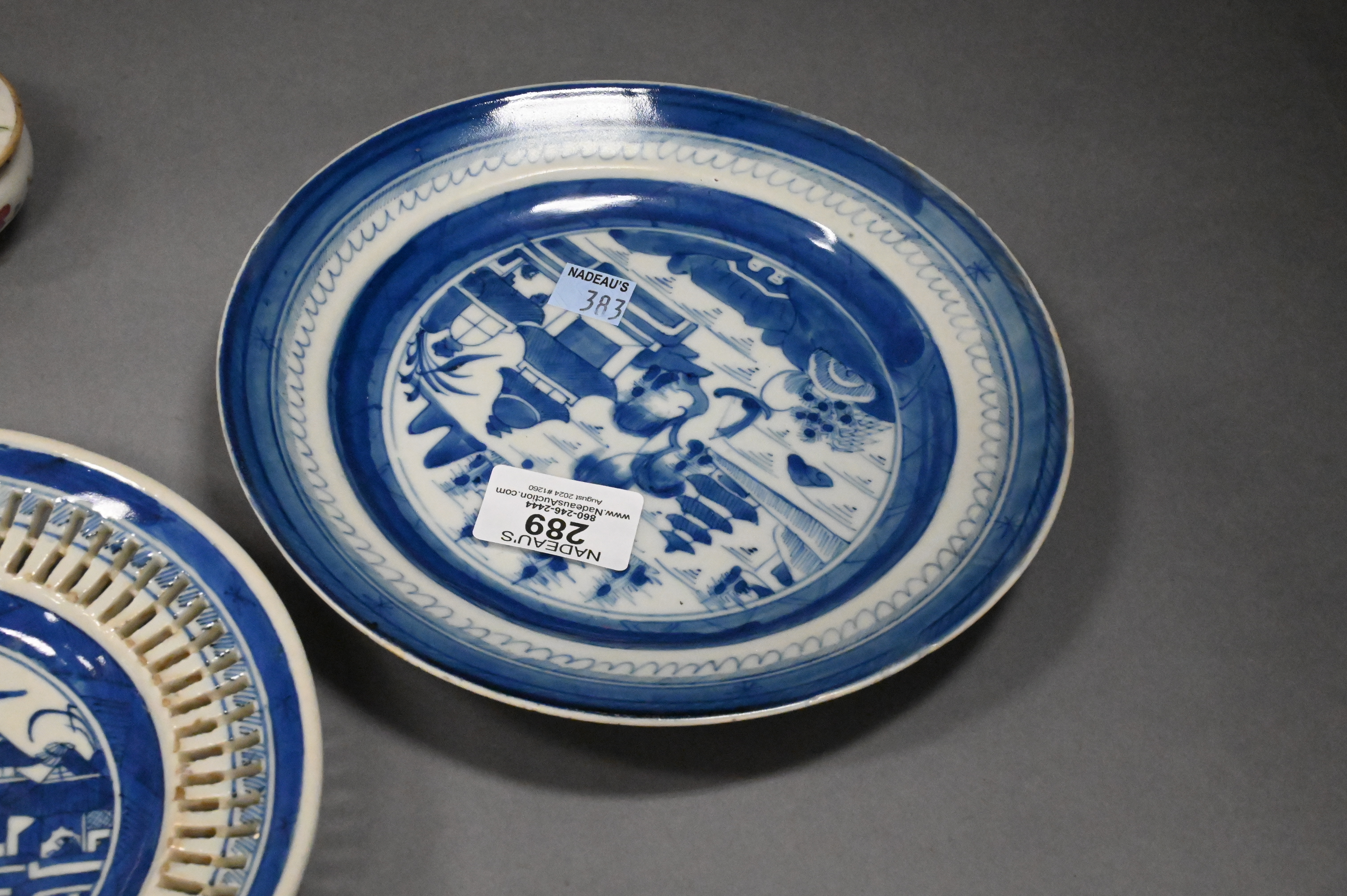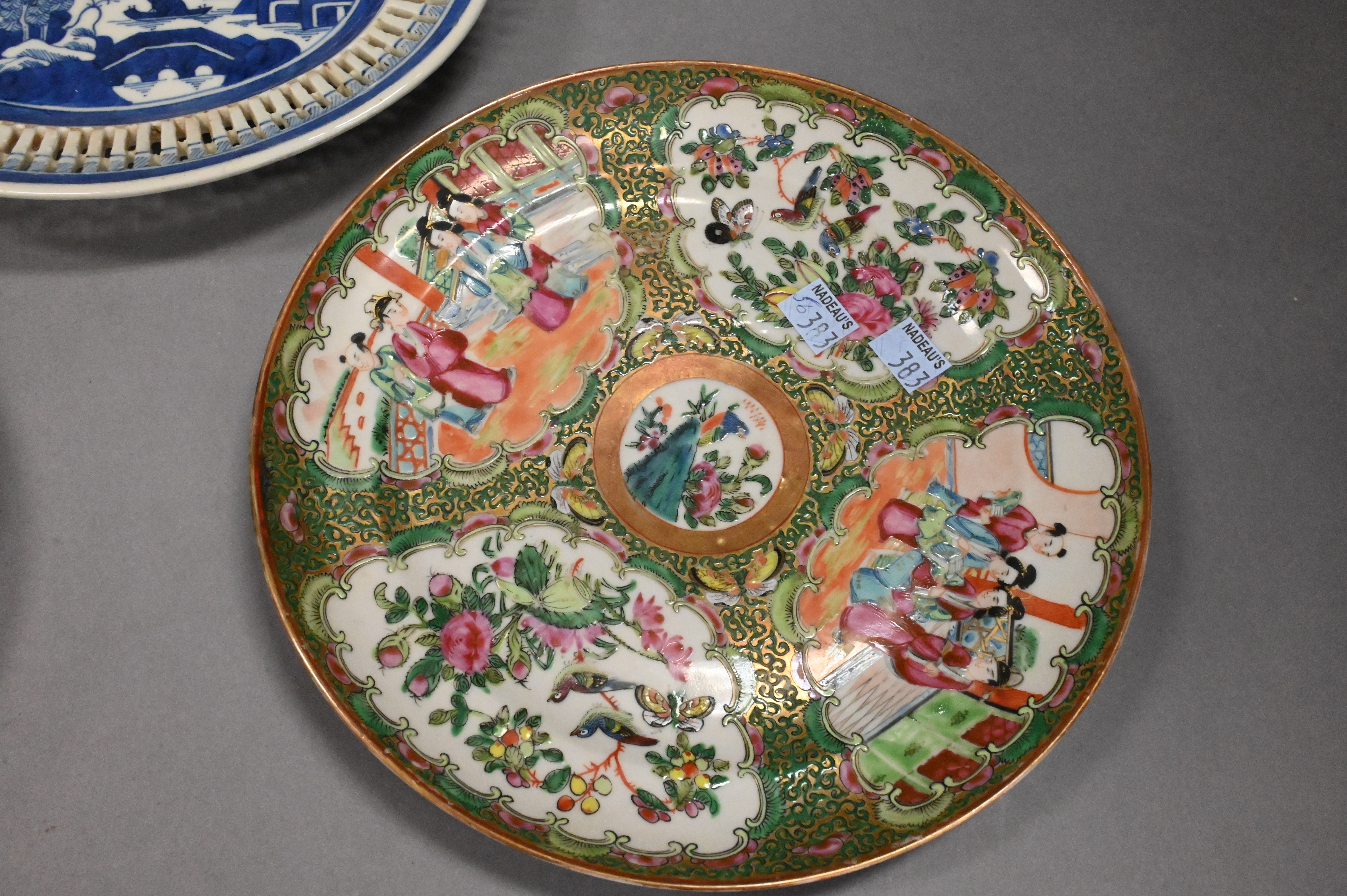 Canton reticulated plate, two Canton plates, two rose medallion plates (chipped), two rose famille covered containers
