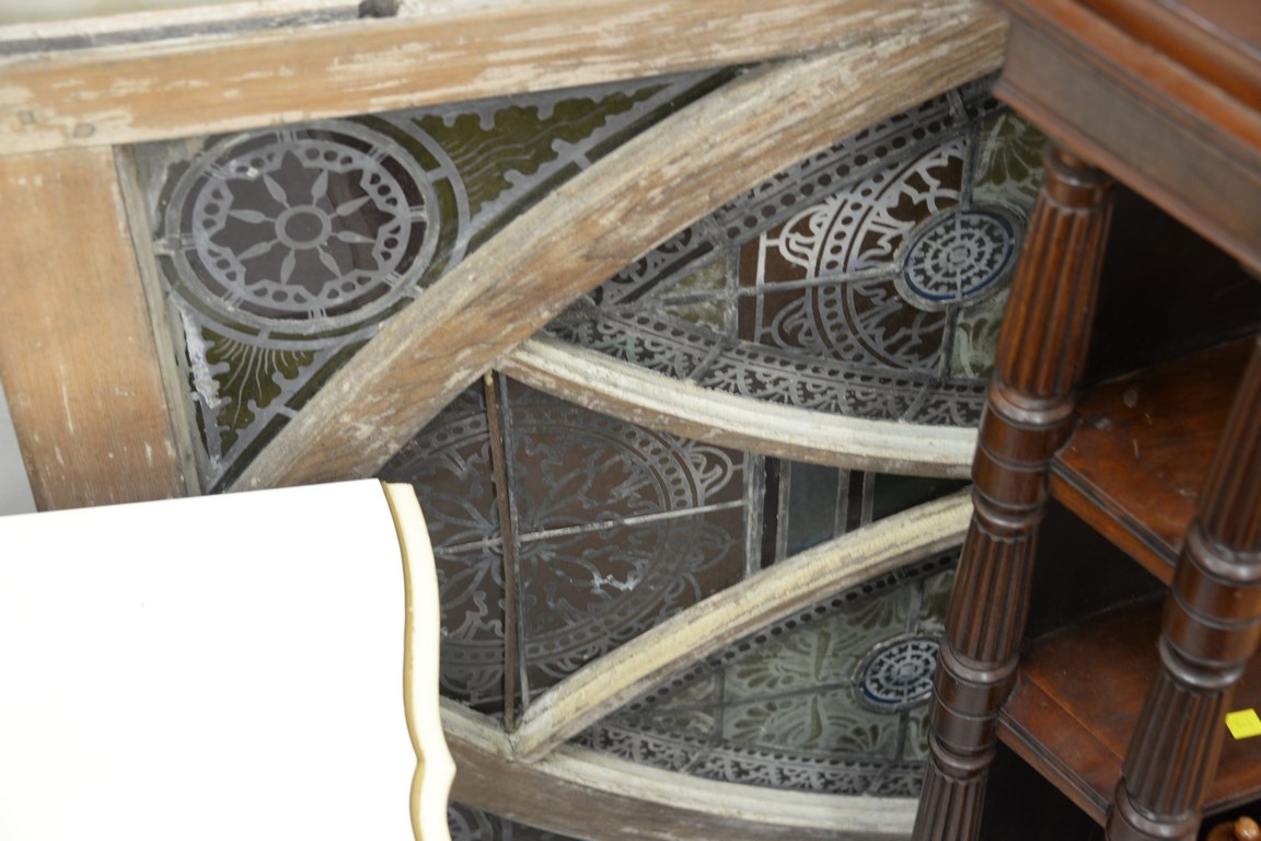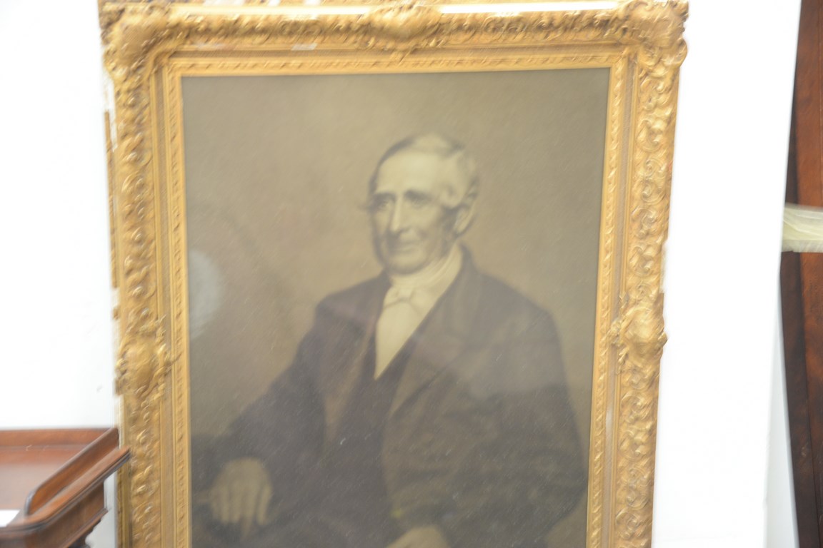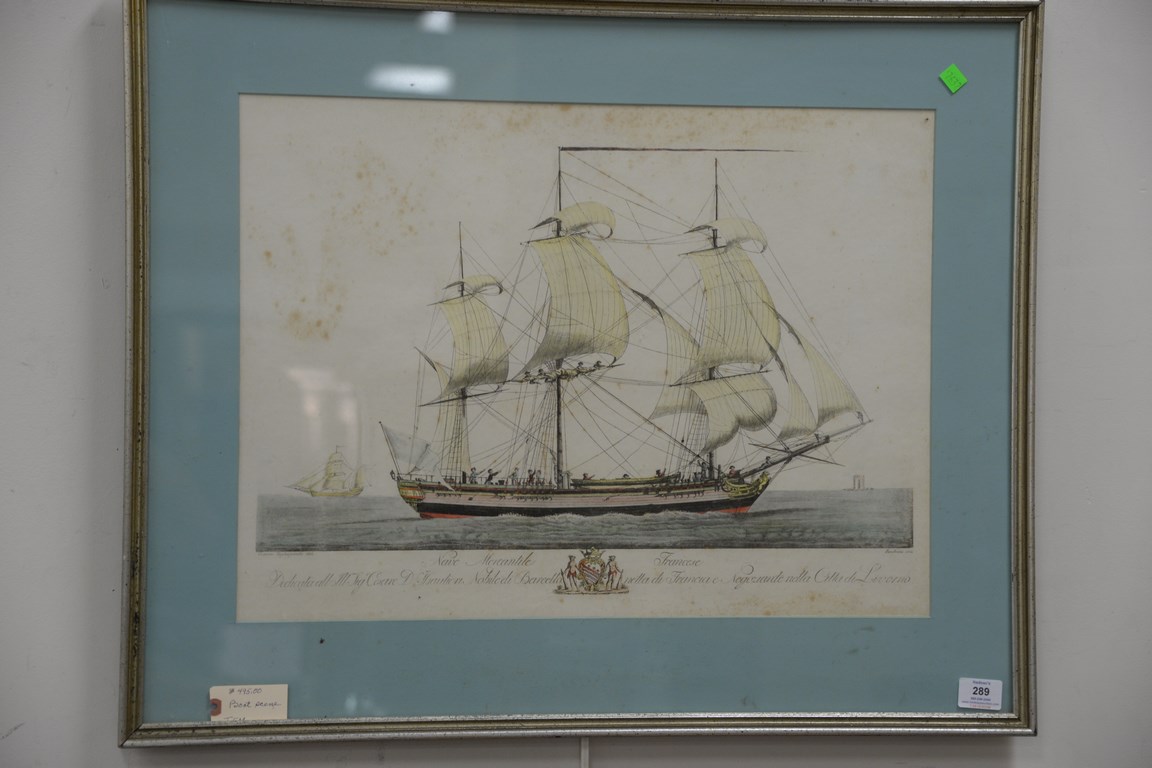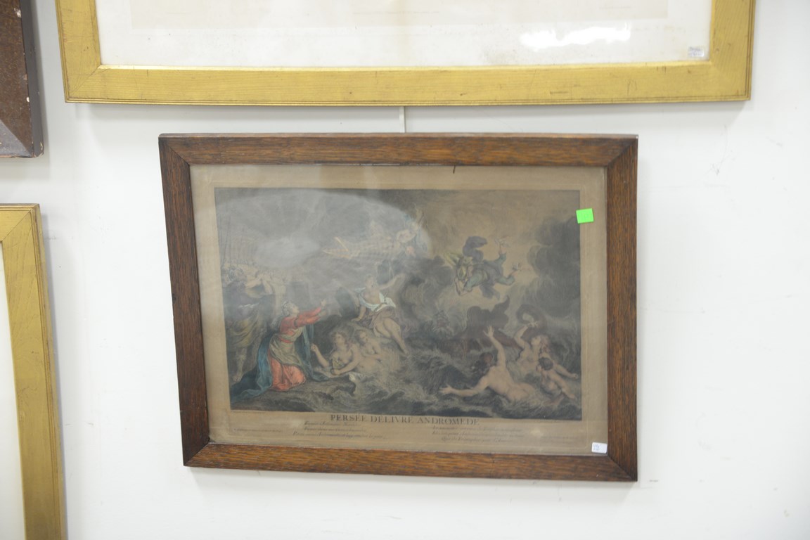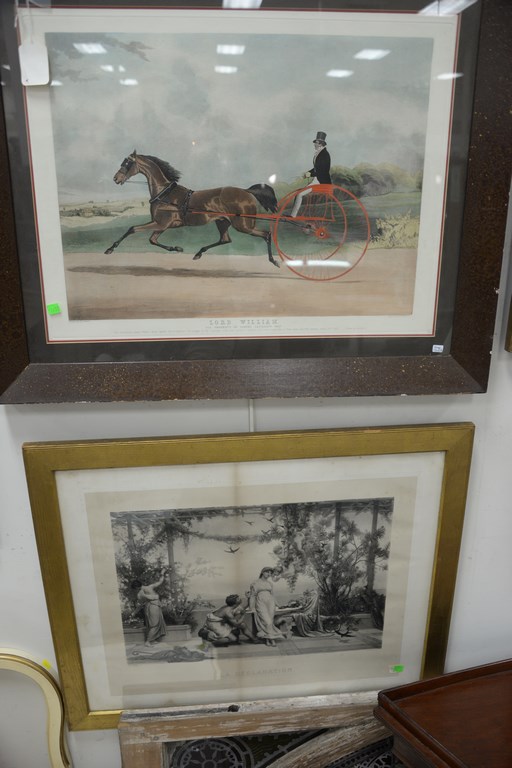 Seven piece lot: group of prints and engravings to include a pair of black and white engravings Une Ame Au Ciel and La Declaration, Lord William after Shayer, colored engraving Persee Delivre Andromede, ship print Nave Mercantile Francese, and print of a man, along with a stain glass window as is.