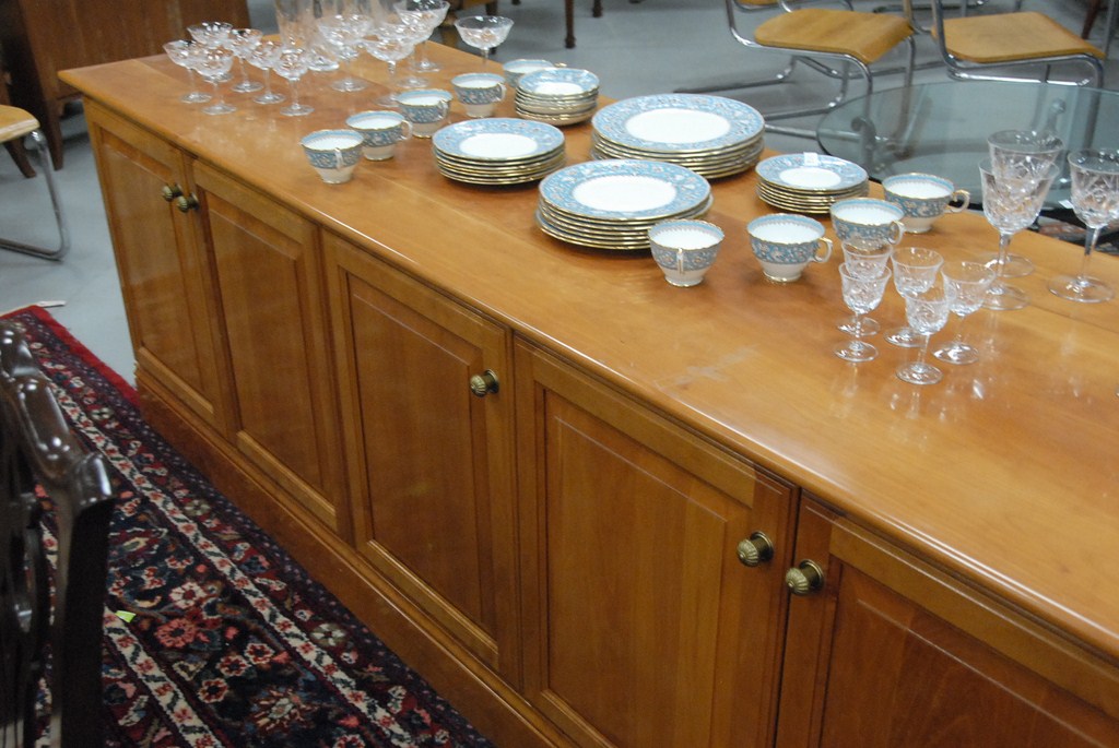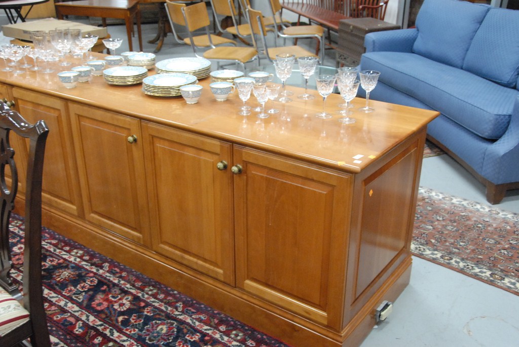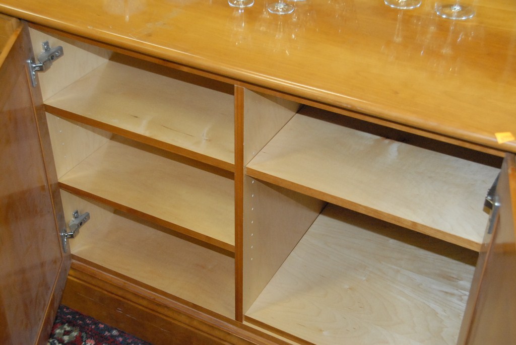 Lot 289: Solid cherry custom cabinet with five doors on either side and various adjustable shelves, ht. 31, top: 27 x 92.
