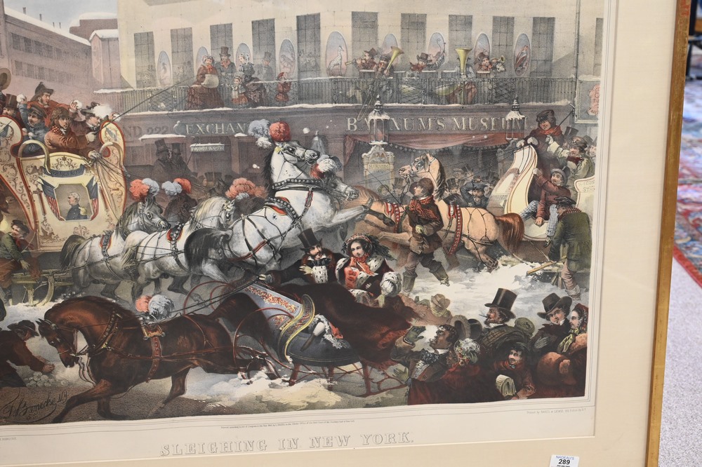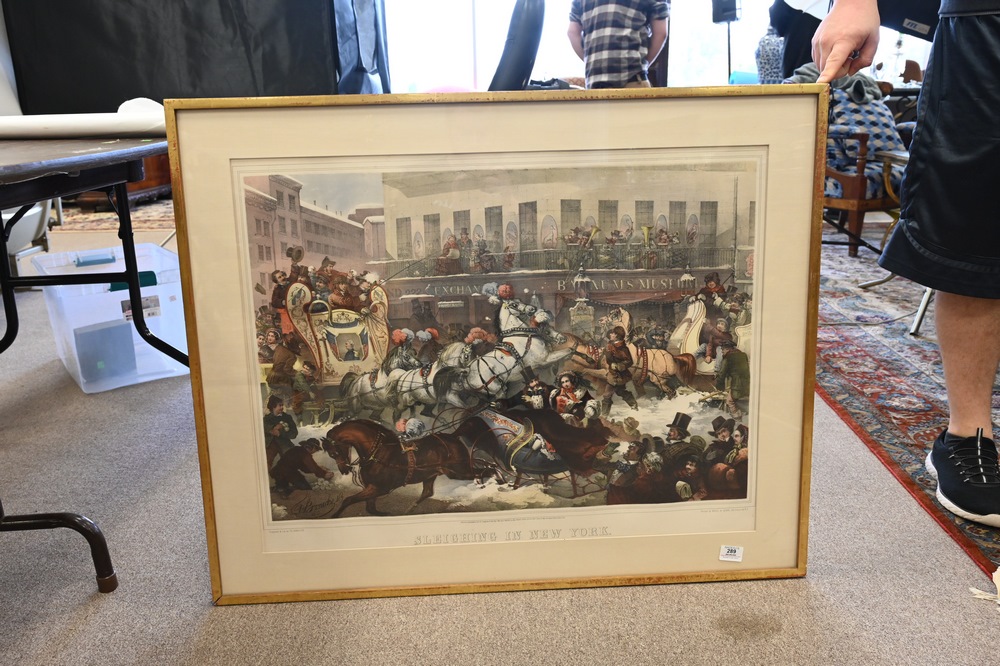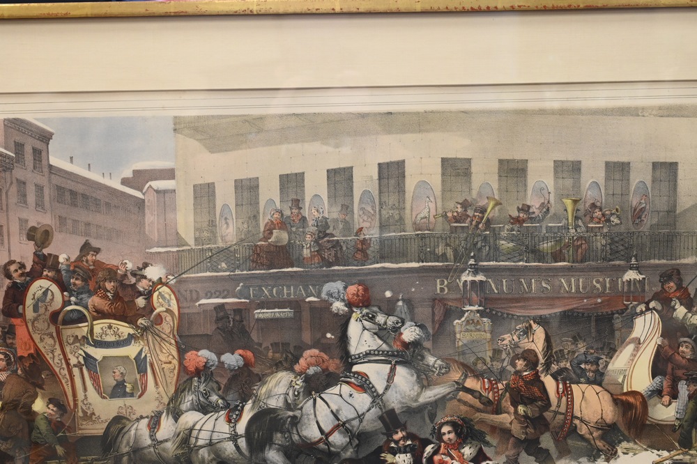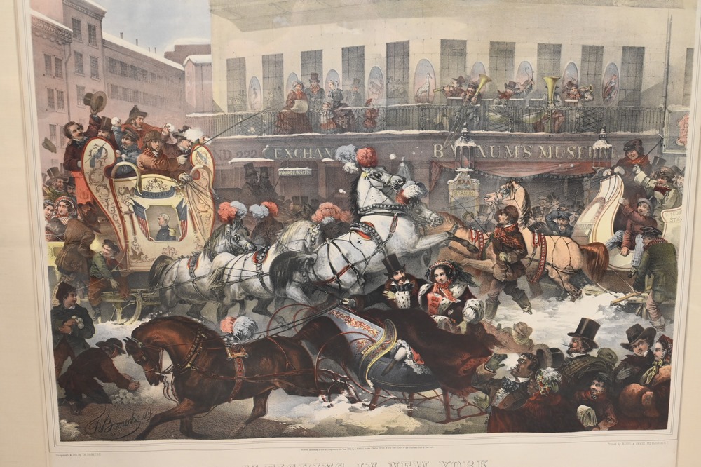 Lot 289: Thomas Benecke (1850 – 1860), Sleighing in New York, original hand colored lithograph, winter scene on Broadway in front of Barnum’s Museum, depicting a snowball fight, paper size 28 x 37 inches, frame size 34 x 43 inches.
