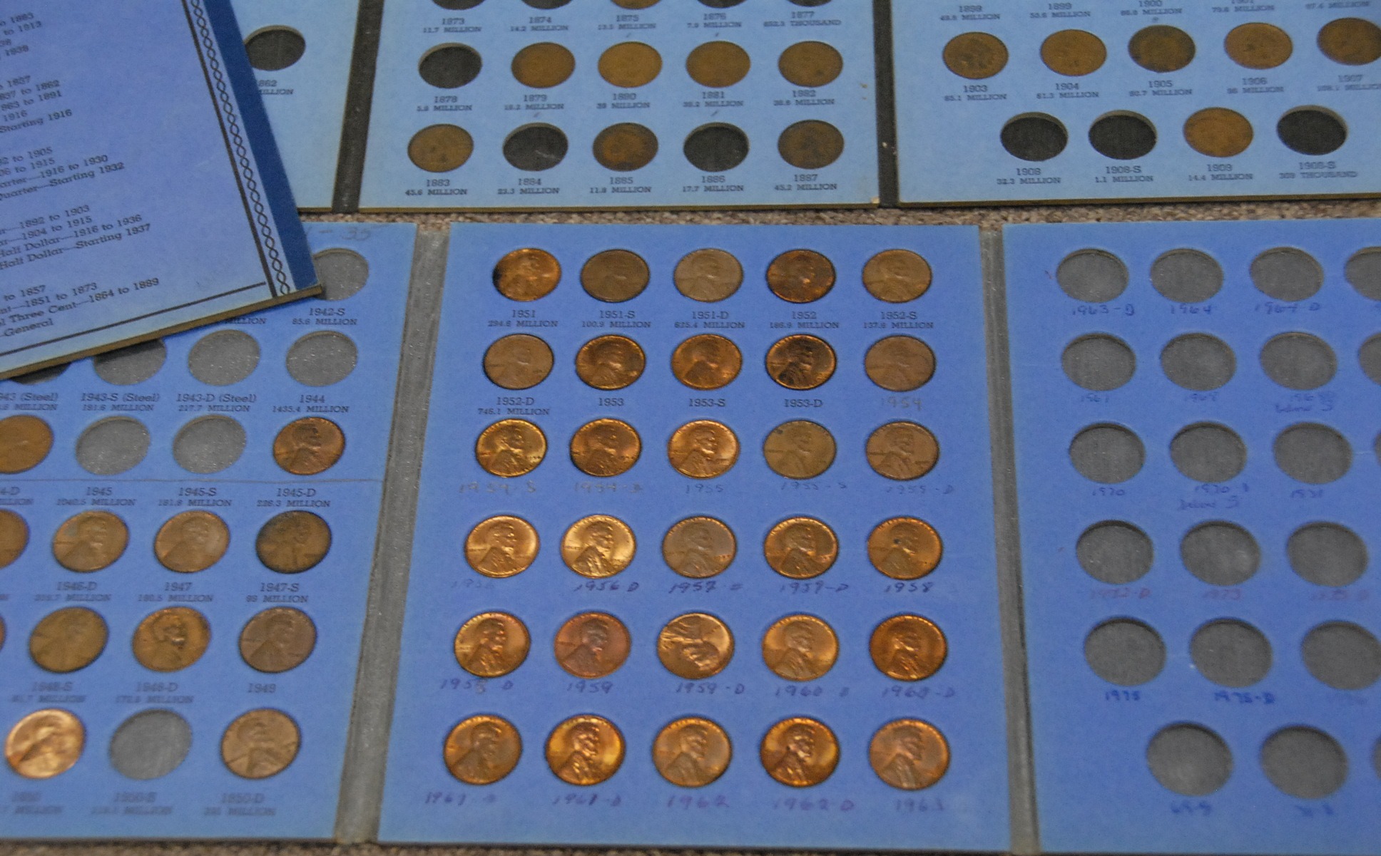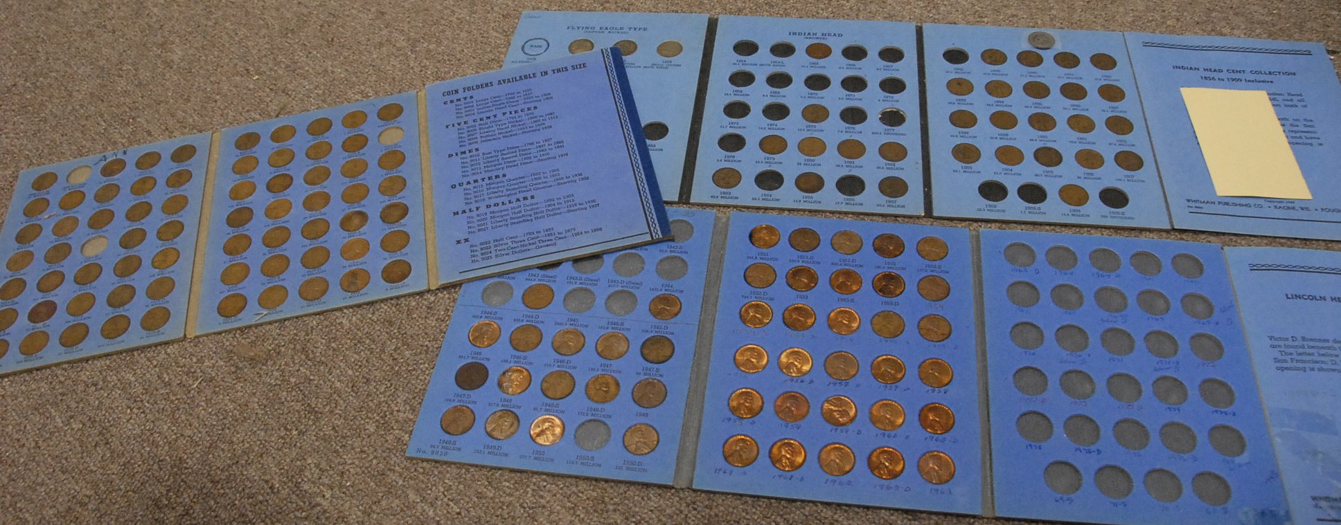 Three books of pennies, two Lincoln cents and one Indian head.