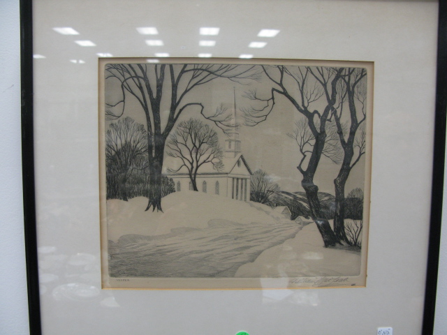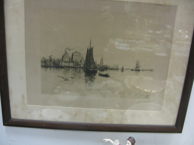 Three etchings, Australian Wheat Rose, Three Master Sailing Ship, Frederick Owen, J.C. Nicoll, Sailing Boat with a town in the background and sailboats in the harbor, signed A. Farrer.