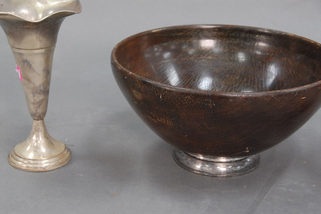 Three piece lot: sterling silver compote, vase, and wooden bowl with silver base.