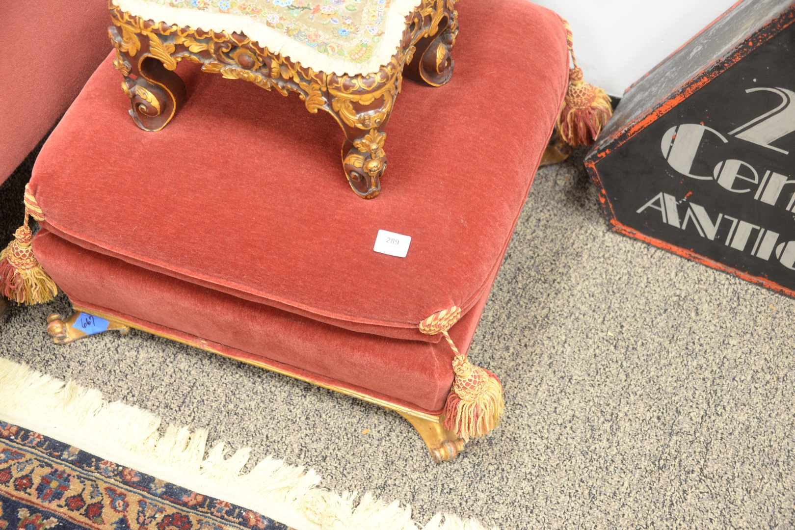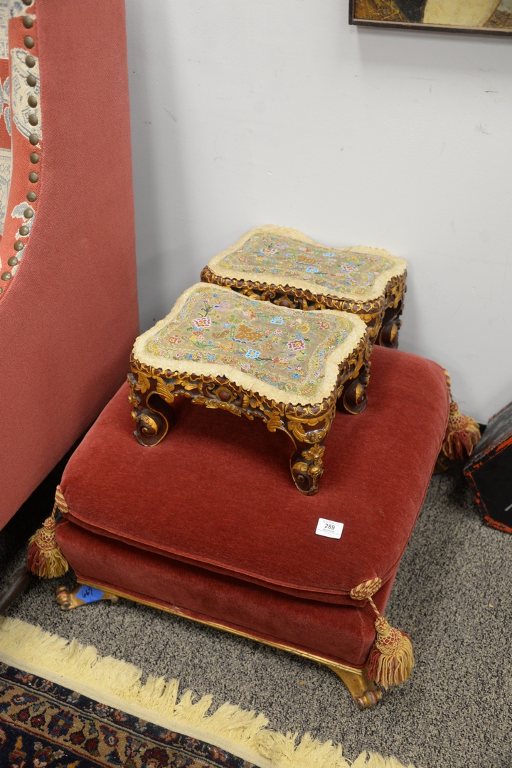Lot 289: Three Piece Lot to include pair of gilt decorated and carved far eastern stools having beadwork covered tops, height 7 1/2 inches, top 9 1/2 x 13, along with red upholstered stool.