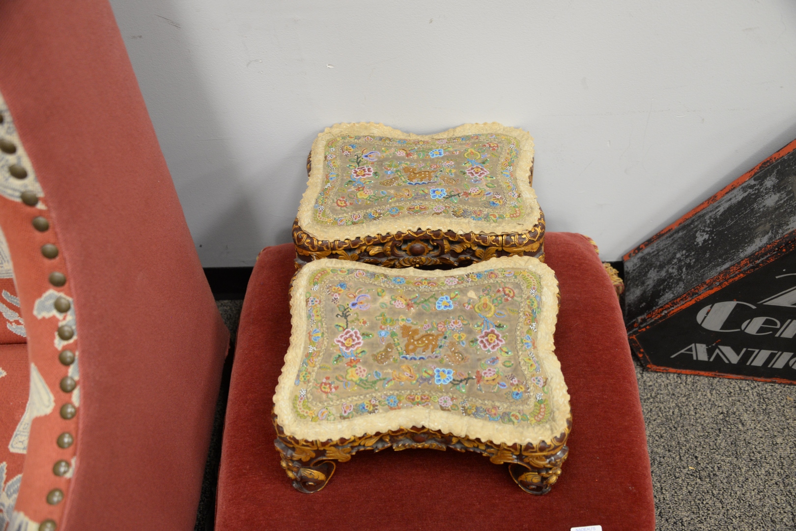 Three Piece Lot to include pair of gilt decorated and carved far eastern stools having beadwork covered tops, height 7 1/2 inches, top 9 1/2 x 13, along with red upholstered stool.
