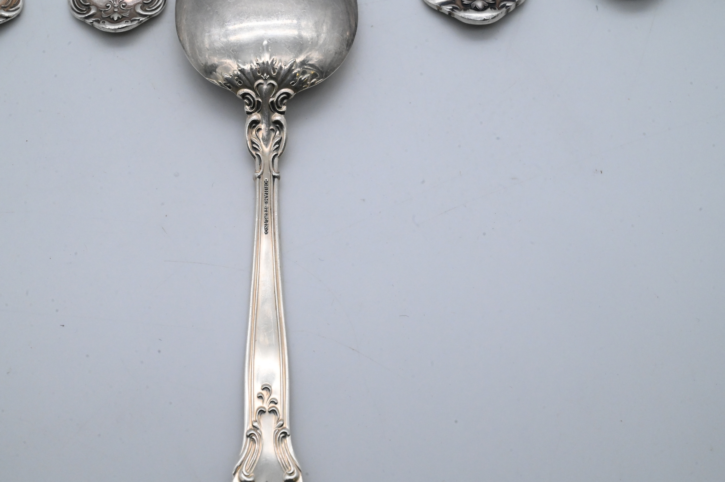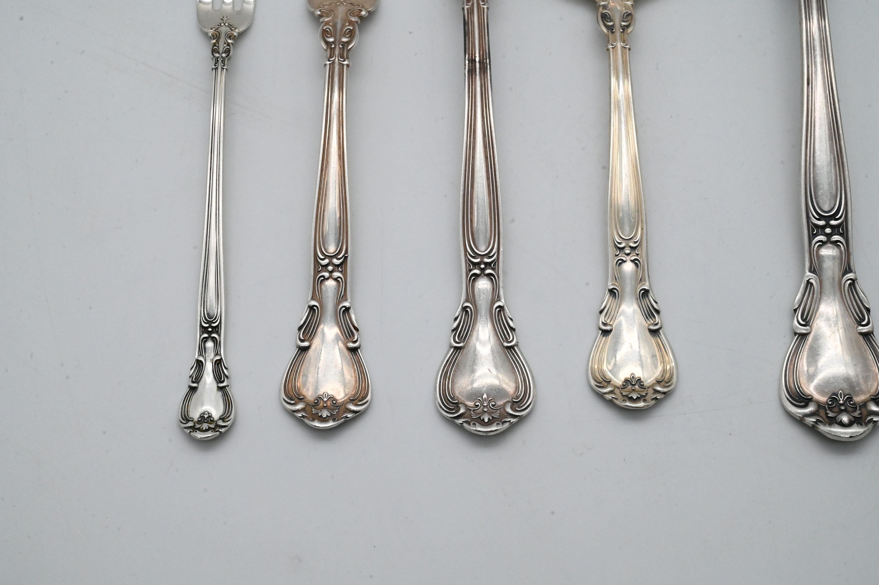 to include 4 dinner forks, 8 luncheon forks, 12 salad forks, 12 cocktail forks, 3 place spoons, 12 soup spoons, 24 teaspoons, 4 dinner knives, 8 luncheon knives, 12 butter knives, and 1 sugar spoon