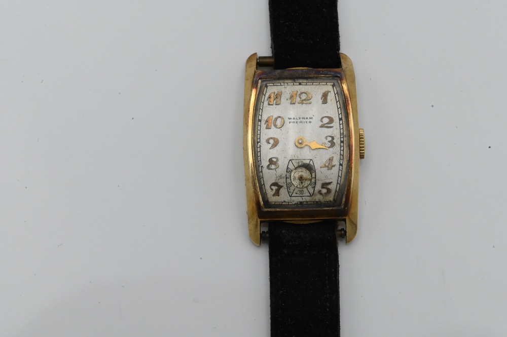 14 Karat Waltham Premier Vintage Rectangular Wristwatch, (hour hand missing), 21.5 x 28.6 millimeters.