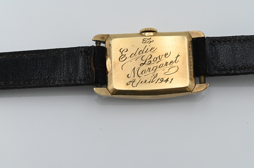 Lot 29: 14 Karat Waltham Premier Vintage Rectangular Wristwatch, (hour hand missing), 21.5 x 28.6 millimeters.