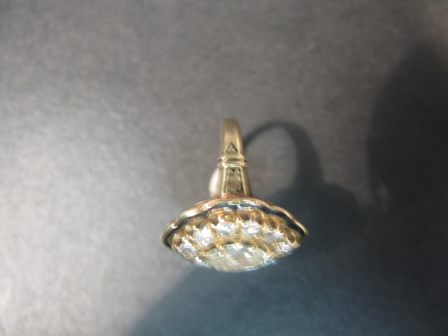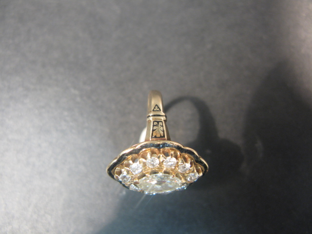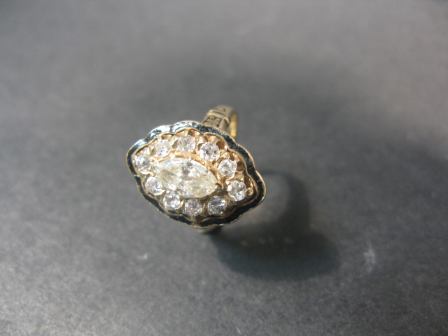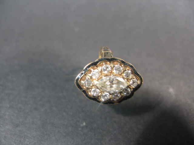 14K gold and diamond ring set with a marquise diamond approximately .75 carats surrounded by ten small diamonds and enameling.
