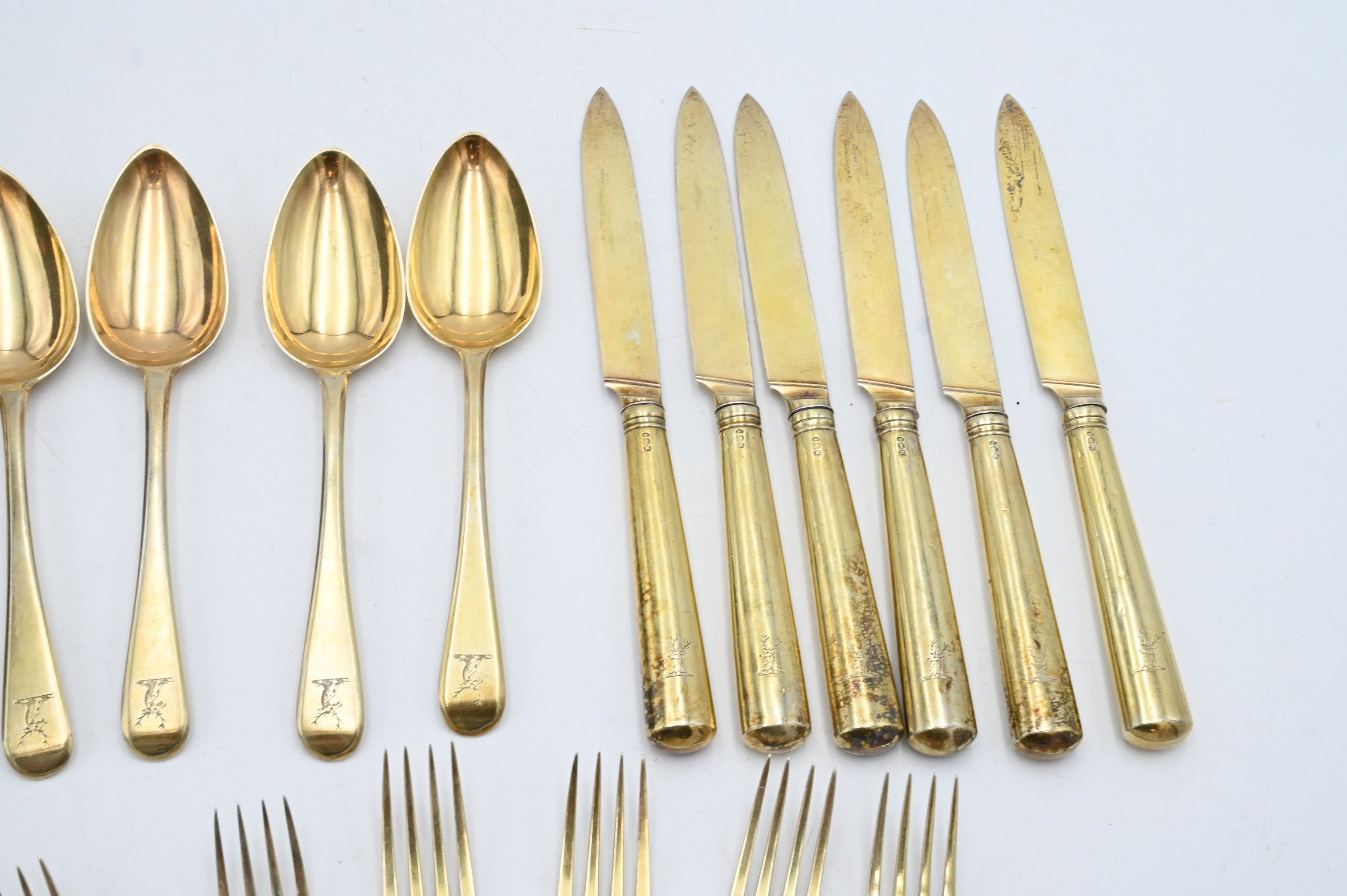 18 Piece English Sterling and Vermeil Flatware, set for 6, to include 6 lunch forks, 6 tablespoons, 6 knives having sterling knife blades, 15.7 t.oz. plus 6 weighted handles.