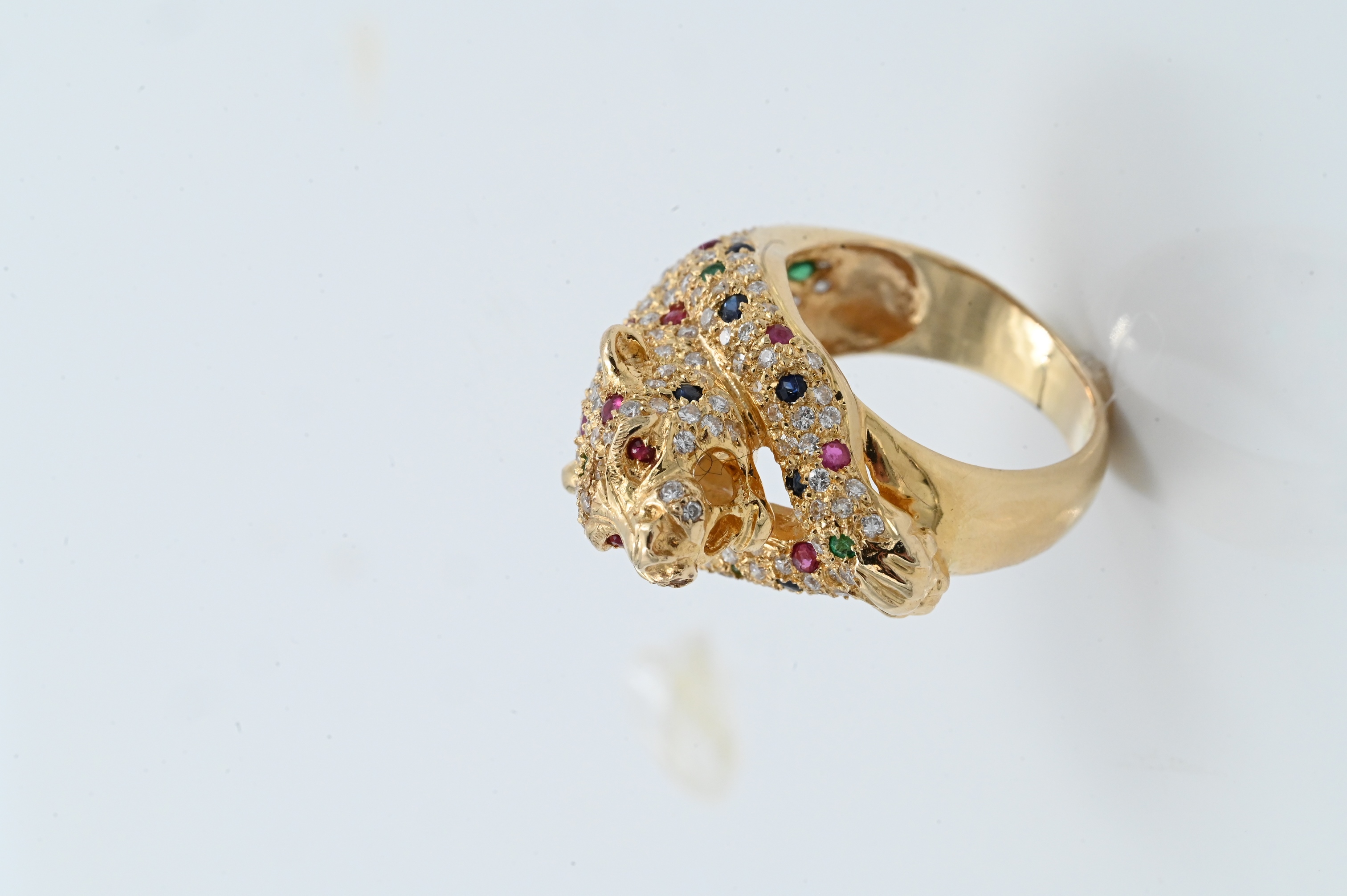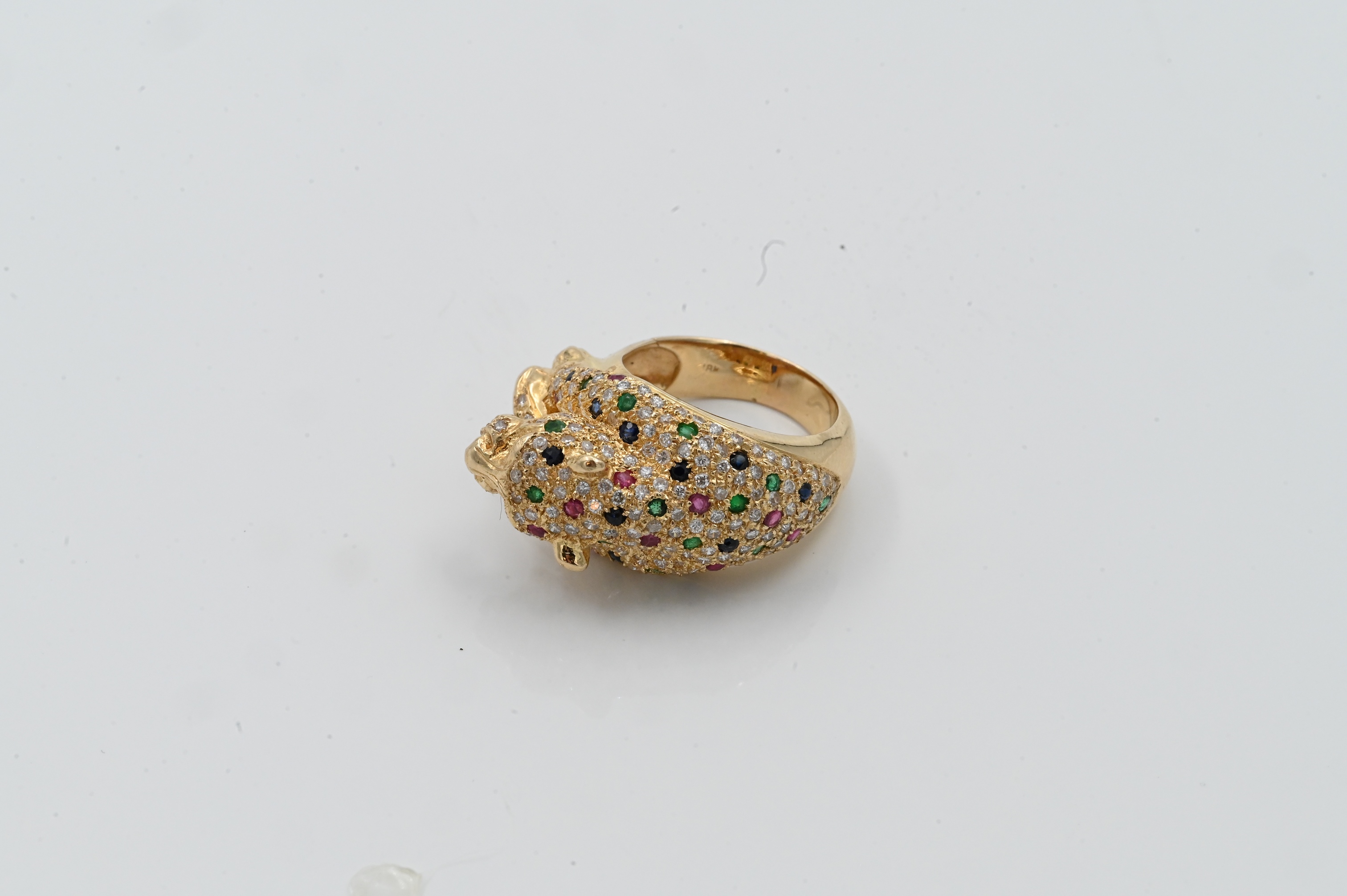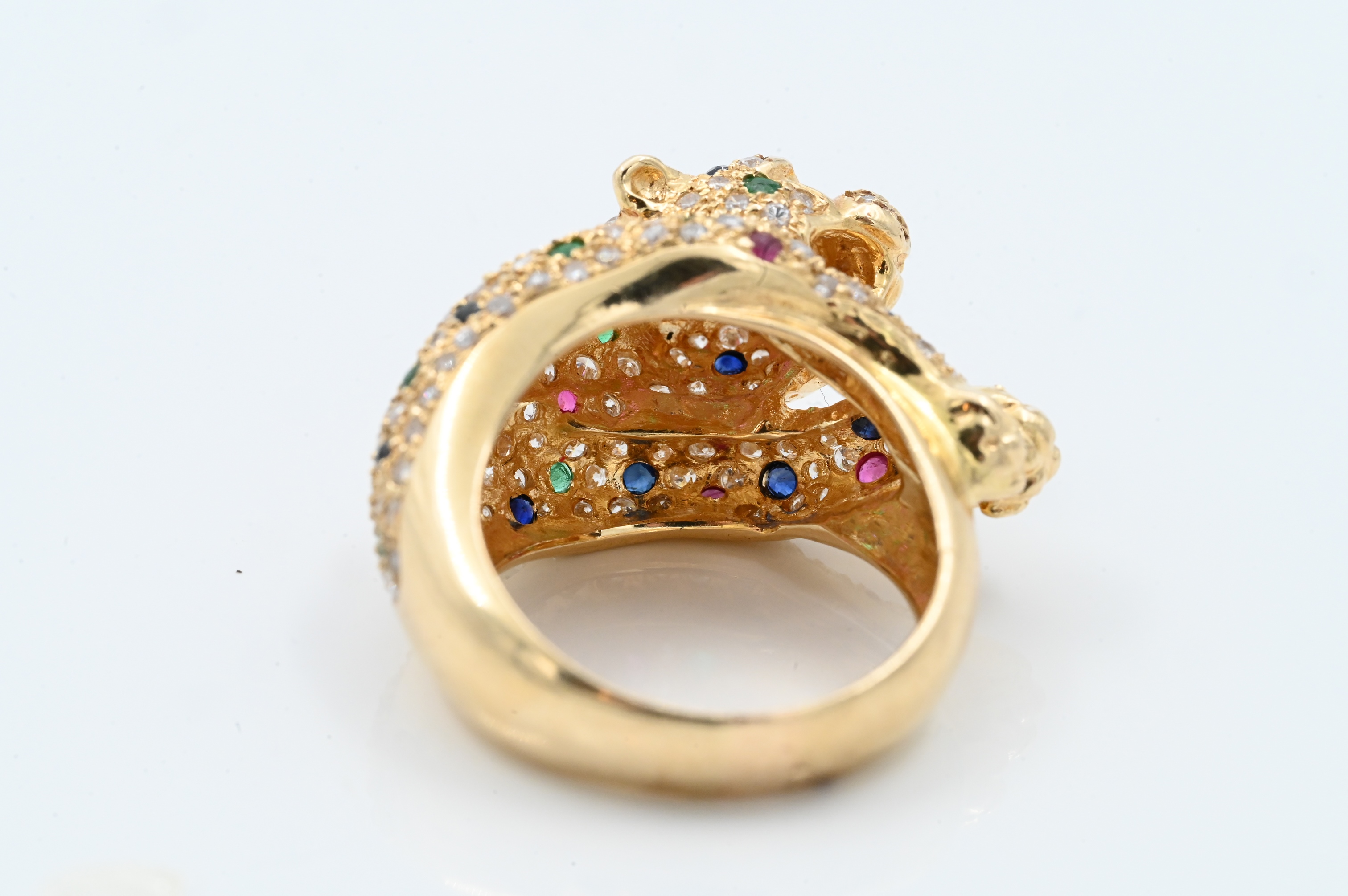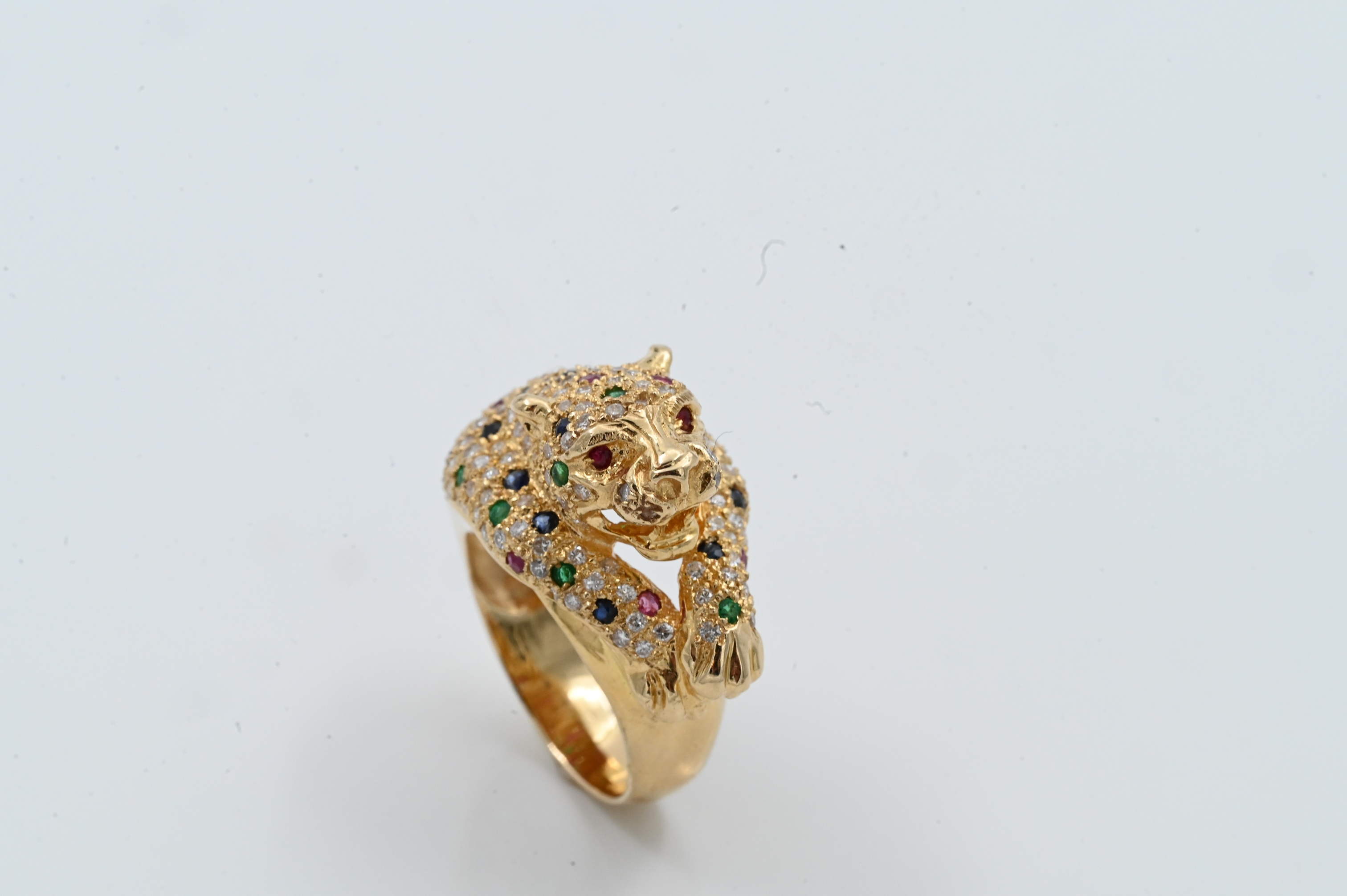 having leopard encrusted with diamonds, emeralds, and sapphires