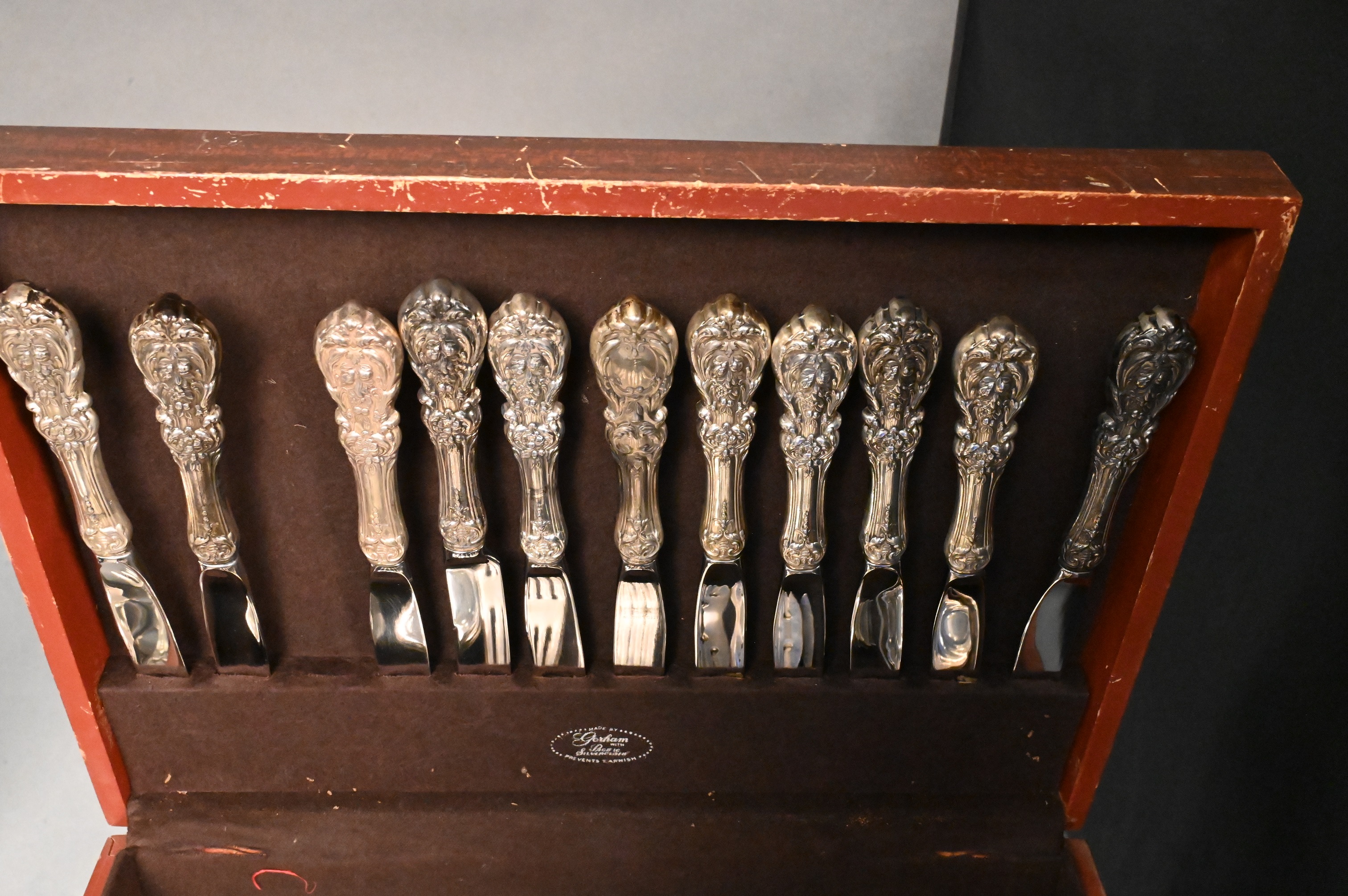 to include eight dinner forks, eight salad forks, six cocktail forks, seven soup spoons, nine teaspoons, 16 dinner knives, 12 butter knives, one cake knife, seven serving pieces