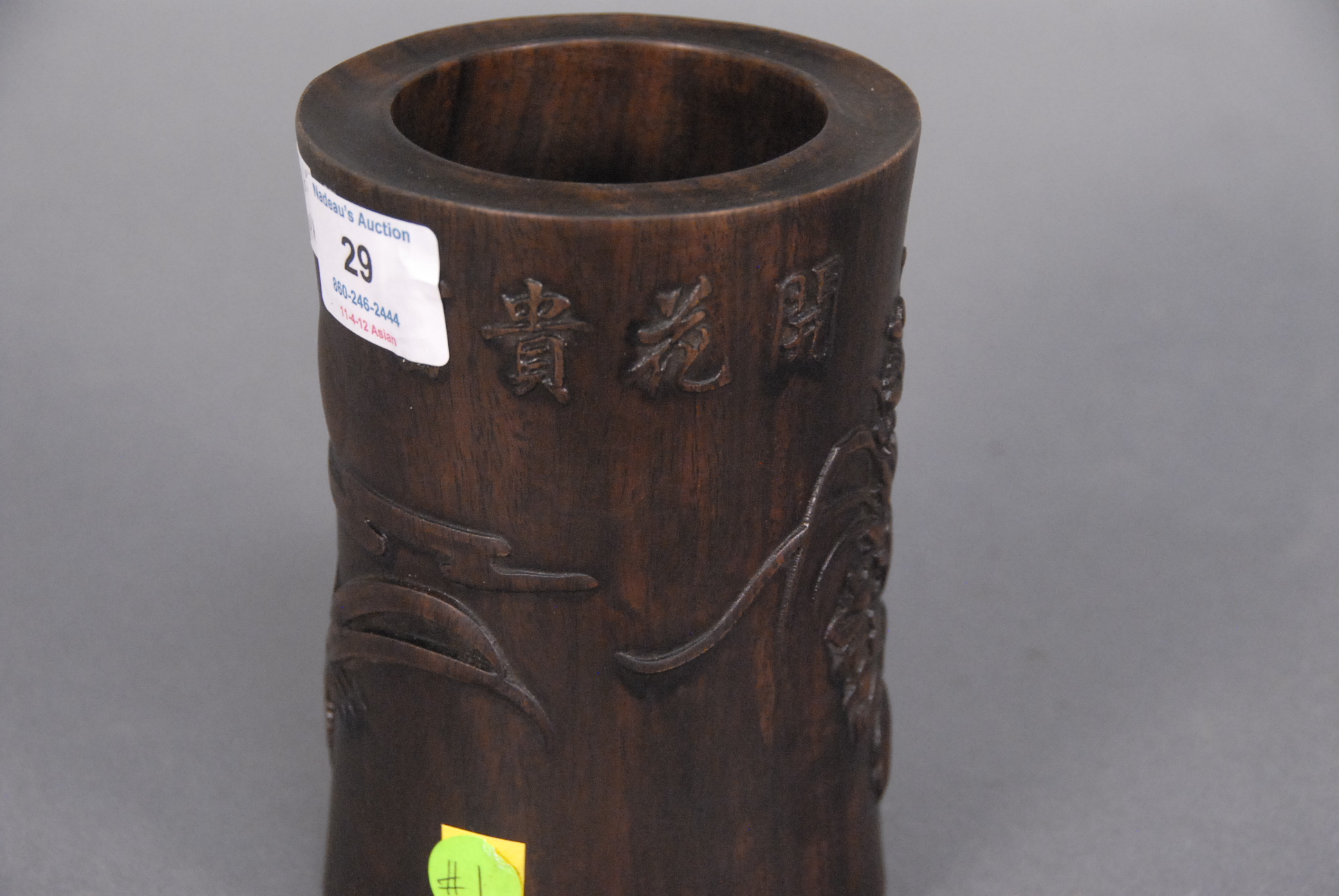 Carved hardwood brush pot with carved birds and flowers, ht. 6in. dia. 4in.