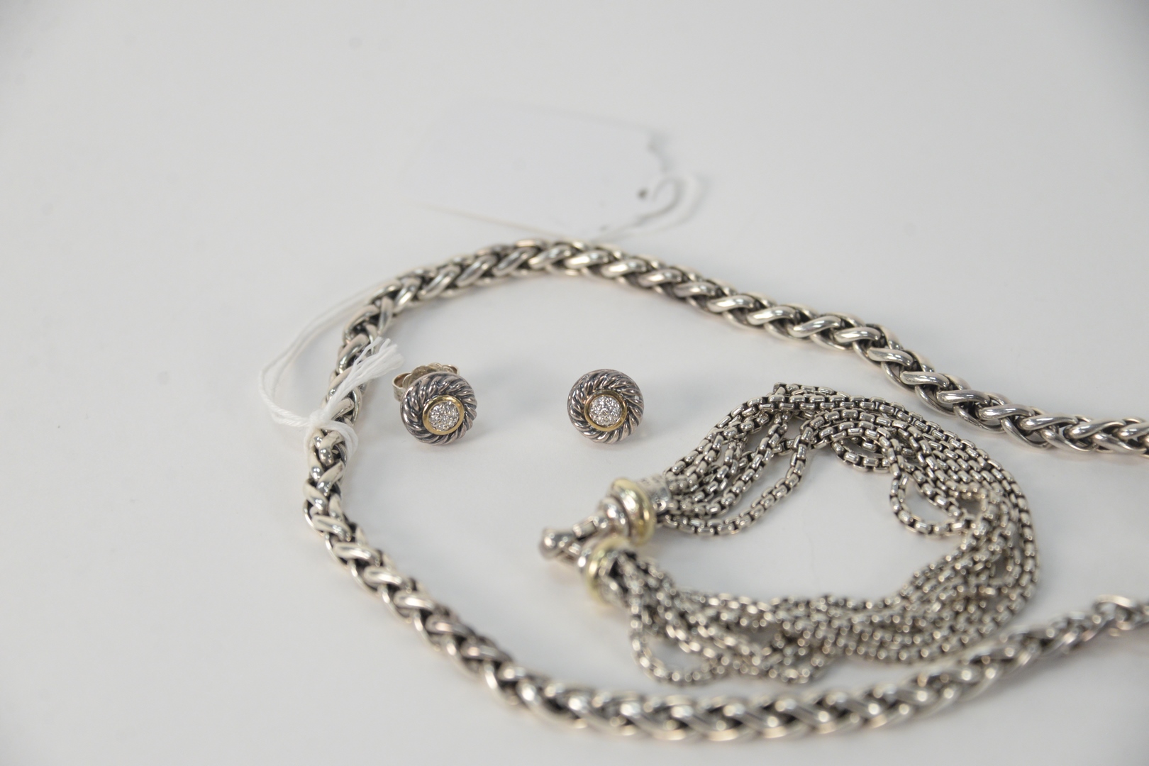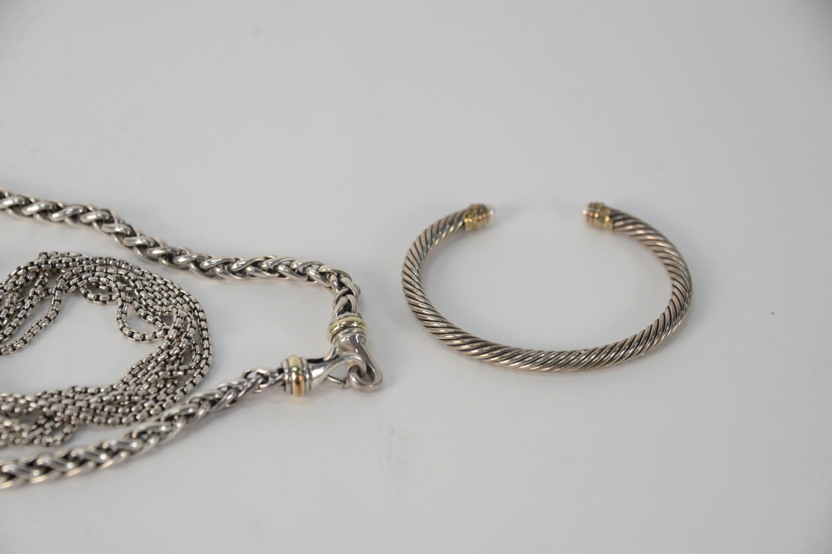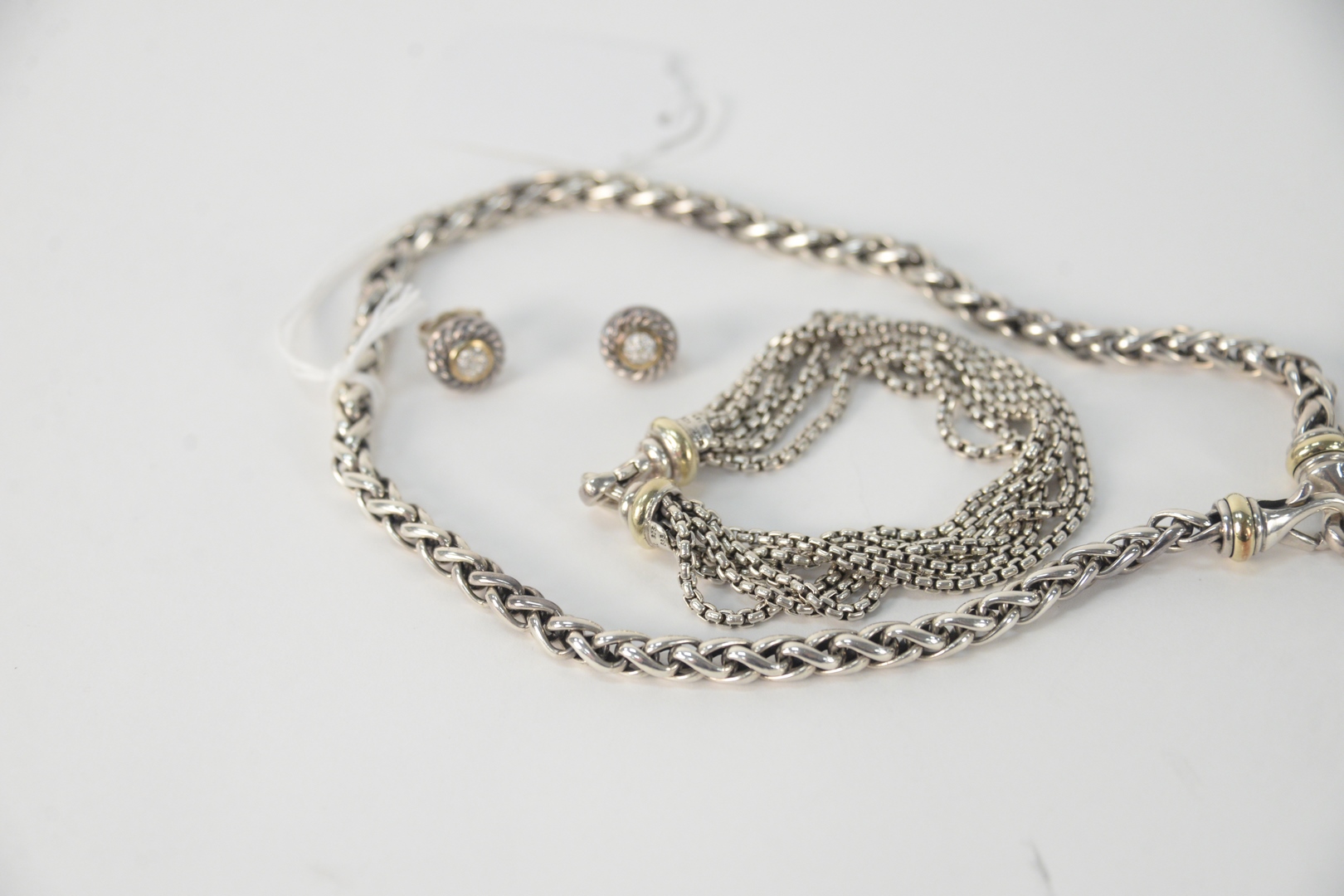 Lot 29: David Yurman Lot, to include two bracelets, one with gold tips, one necklace and pair of earring with small diamonds.