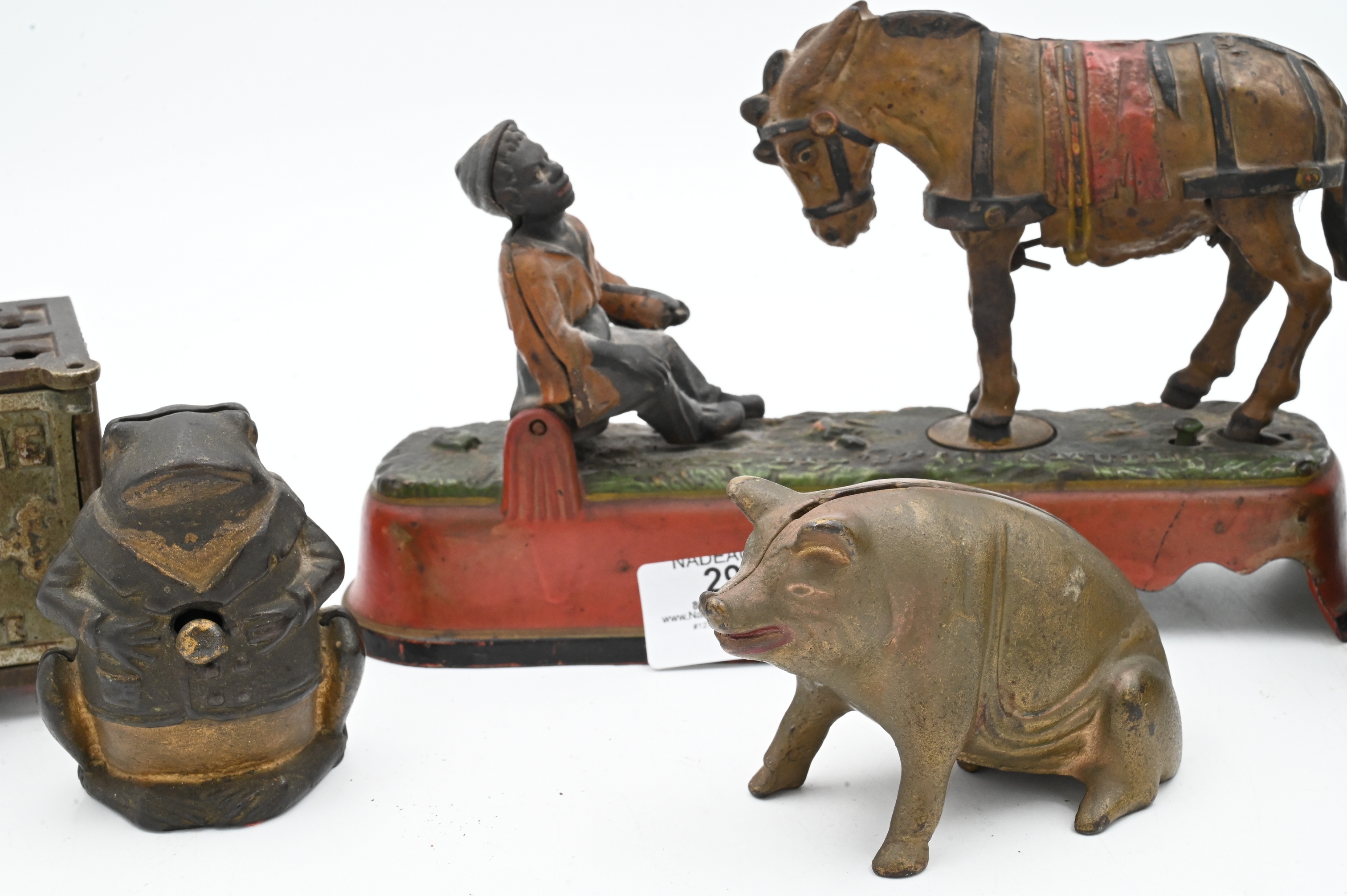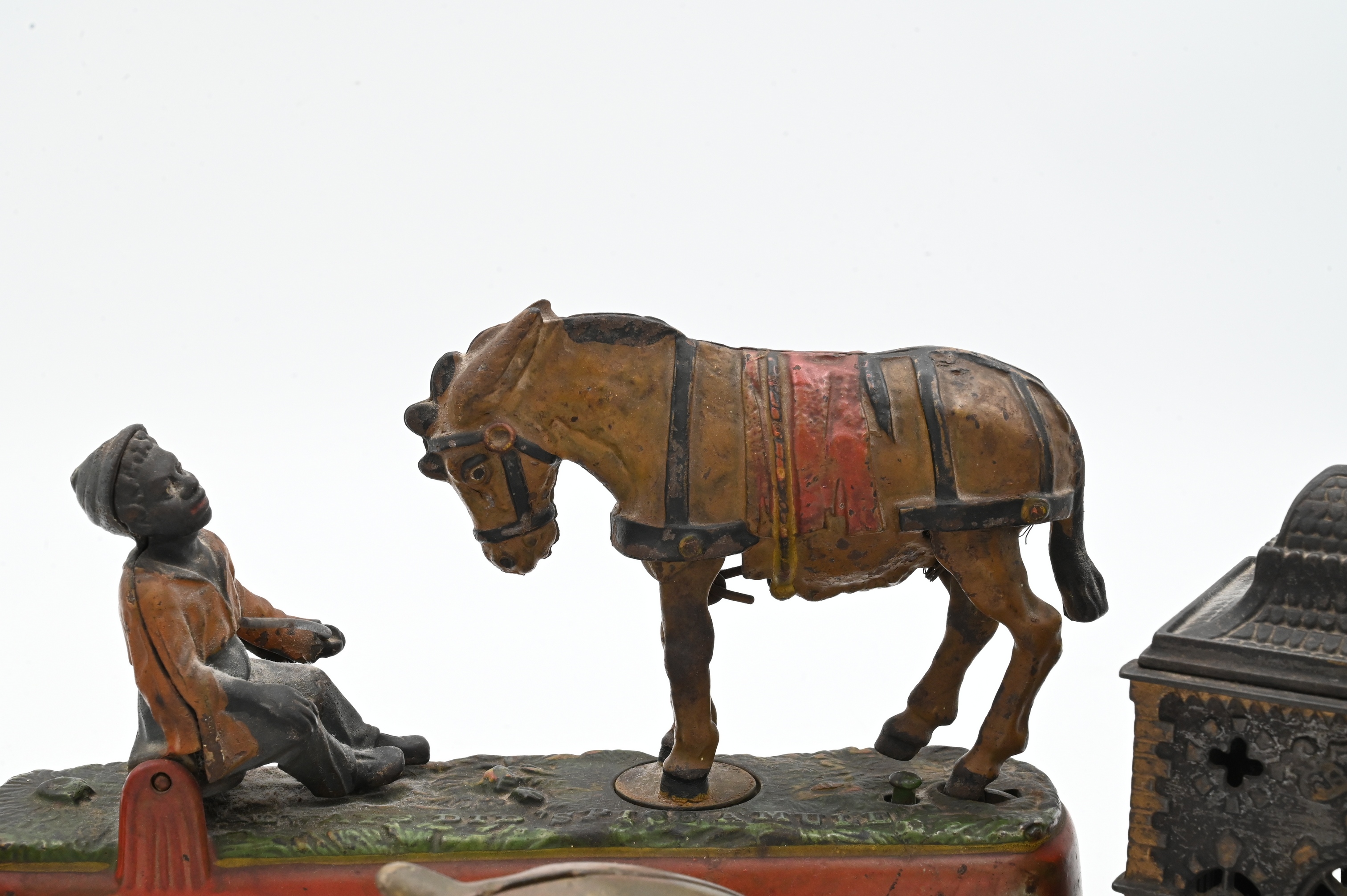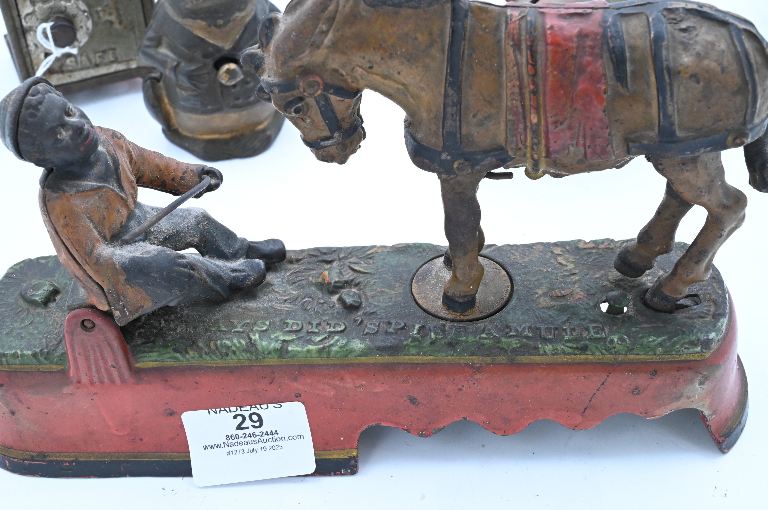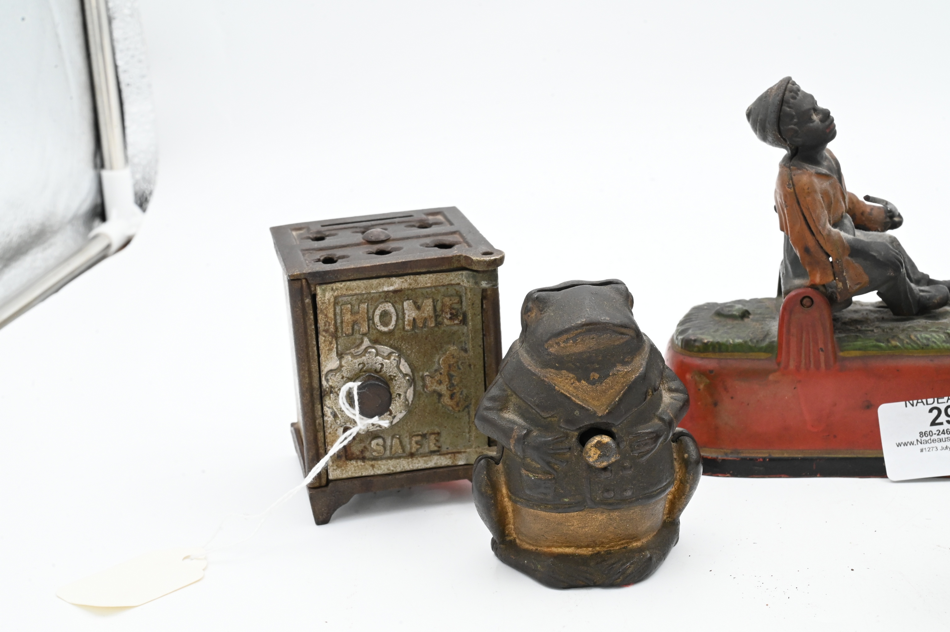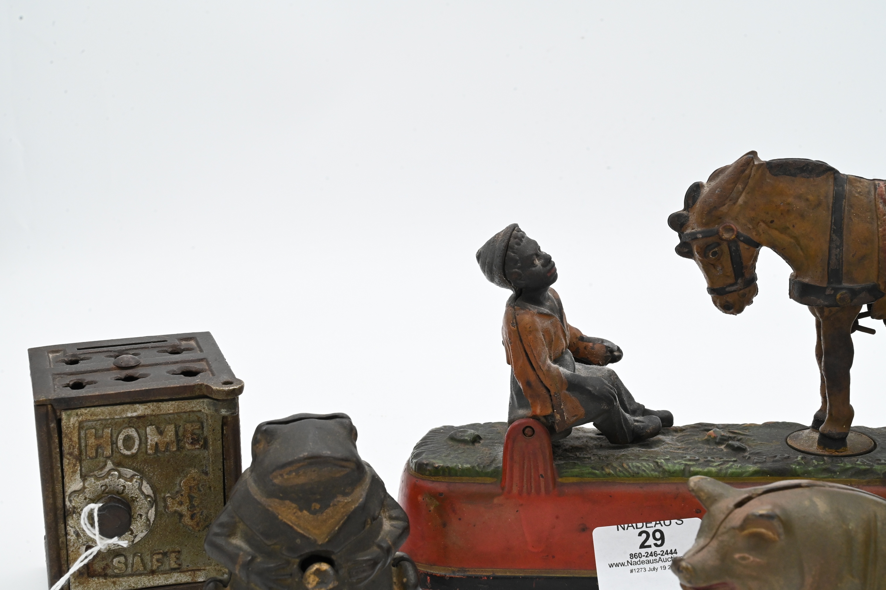 J.E. Stevens Cast “Always Did Spise A Mule” black memorabilia mechanical bank (mule with broken leg), “Professor Pug Frog” A. C. Williams Company Ravenna, Ohio, Circa 1915, “Home Safe” floor safe, J.E. Stevens 1887 cast iron roof bank, along with a seated pig