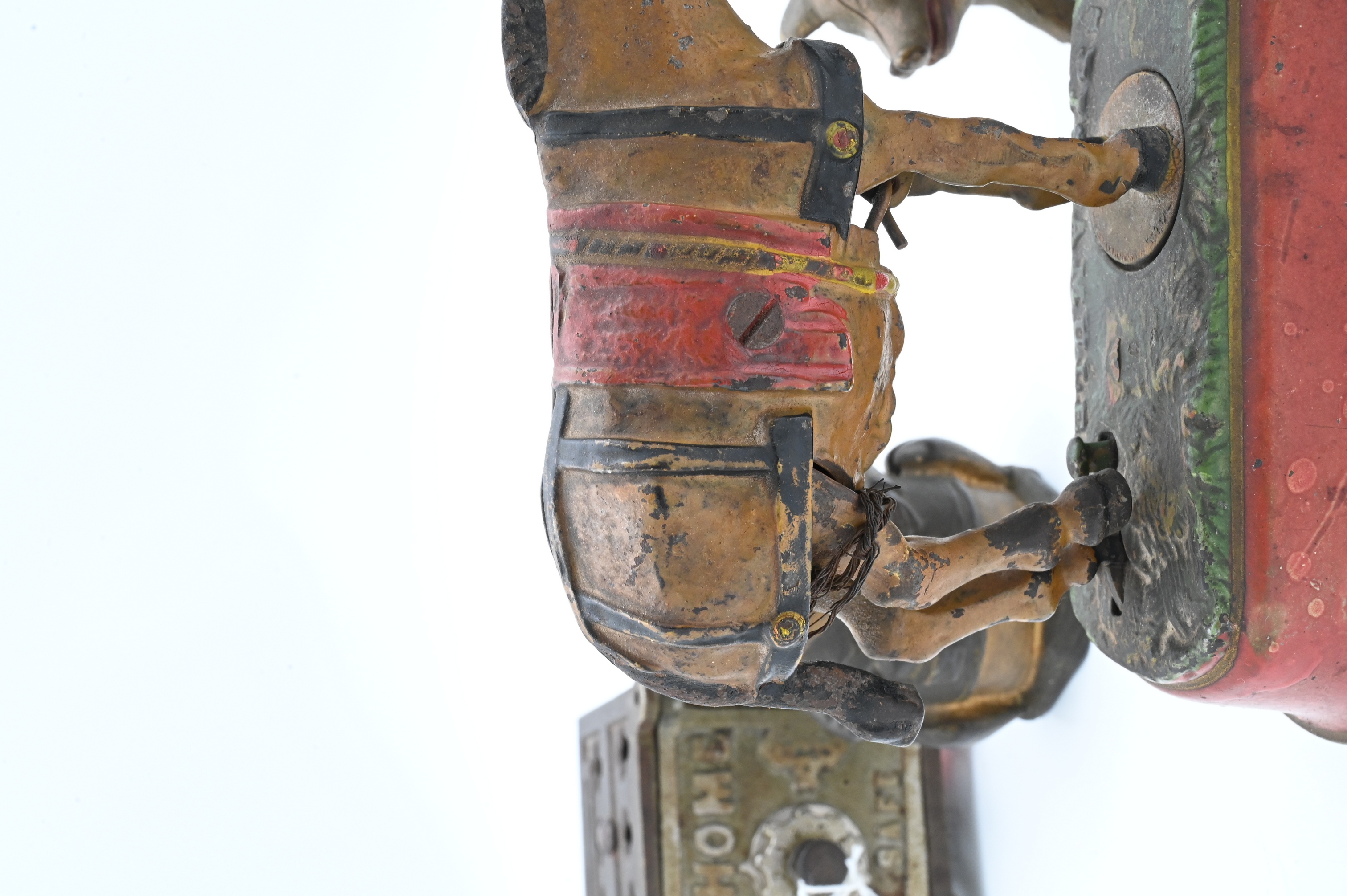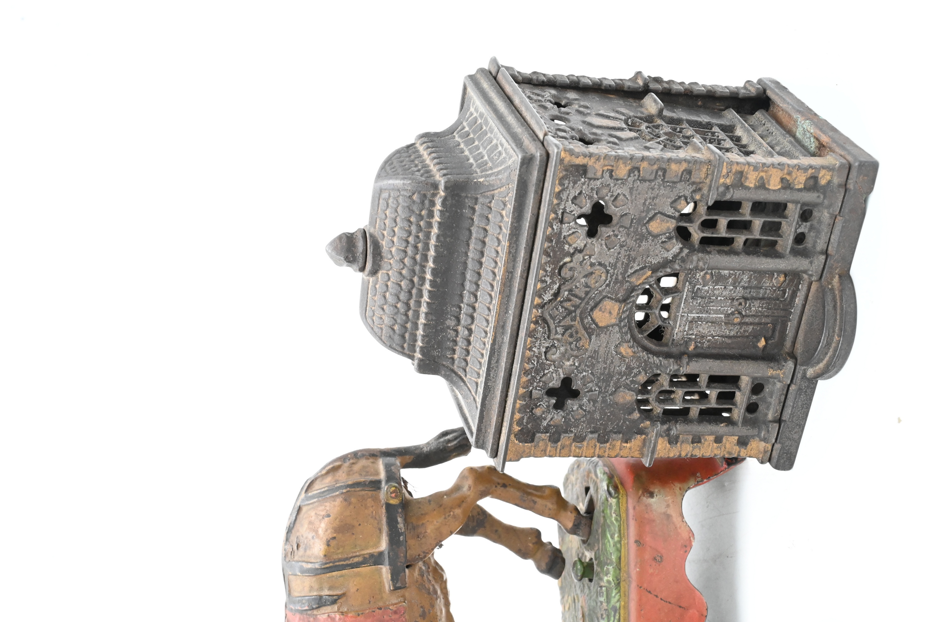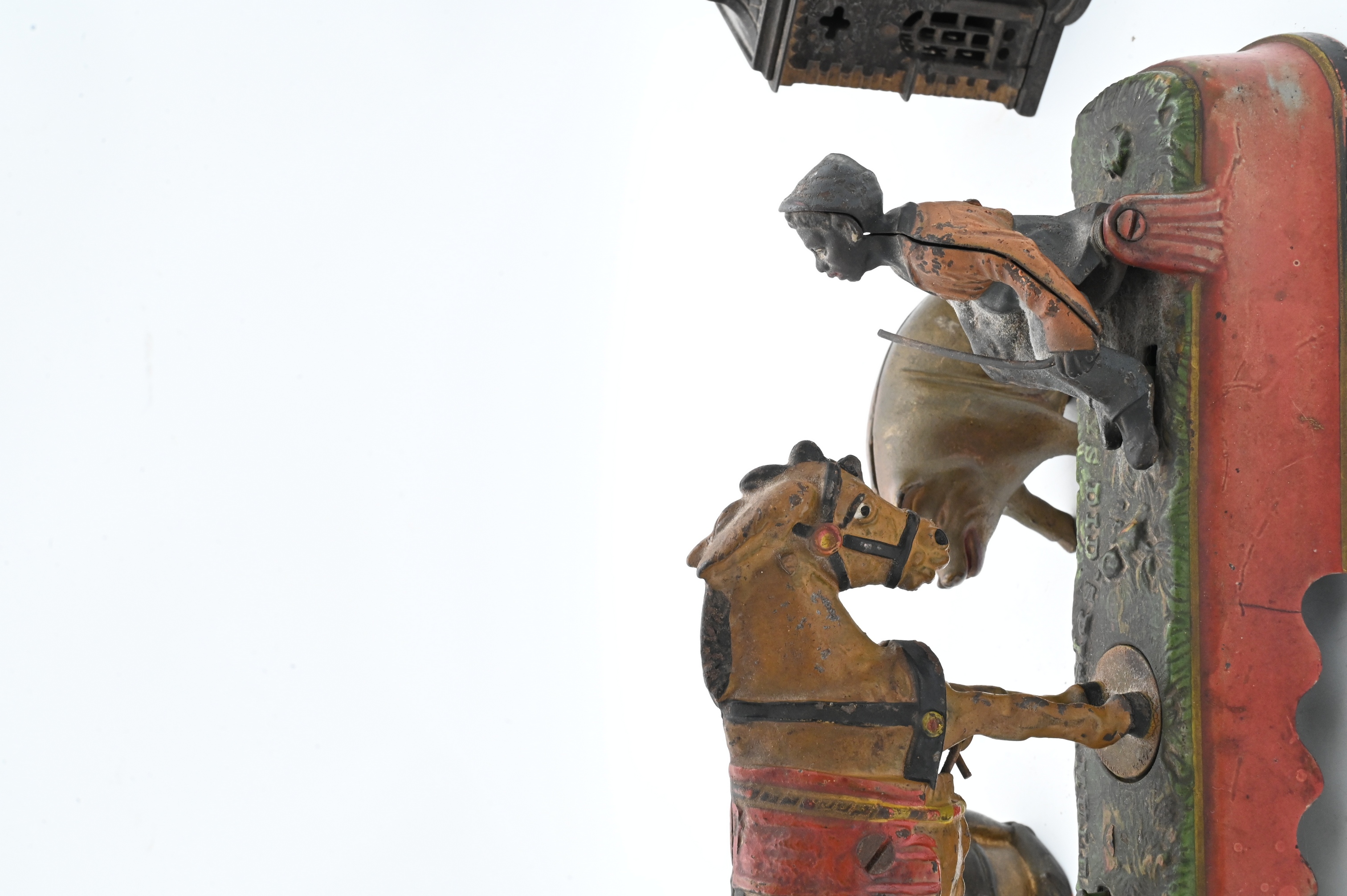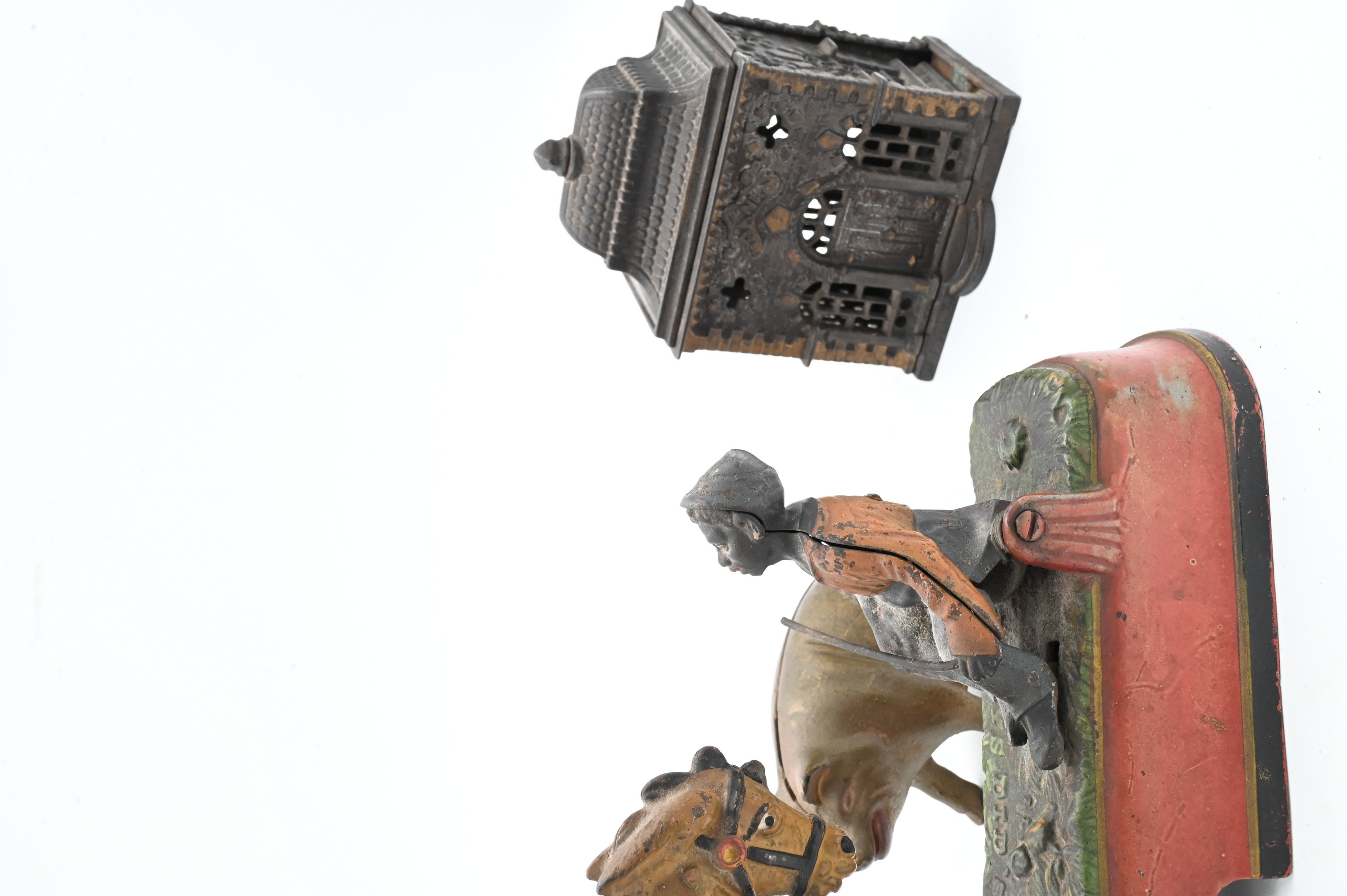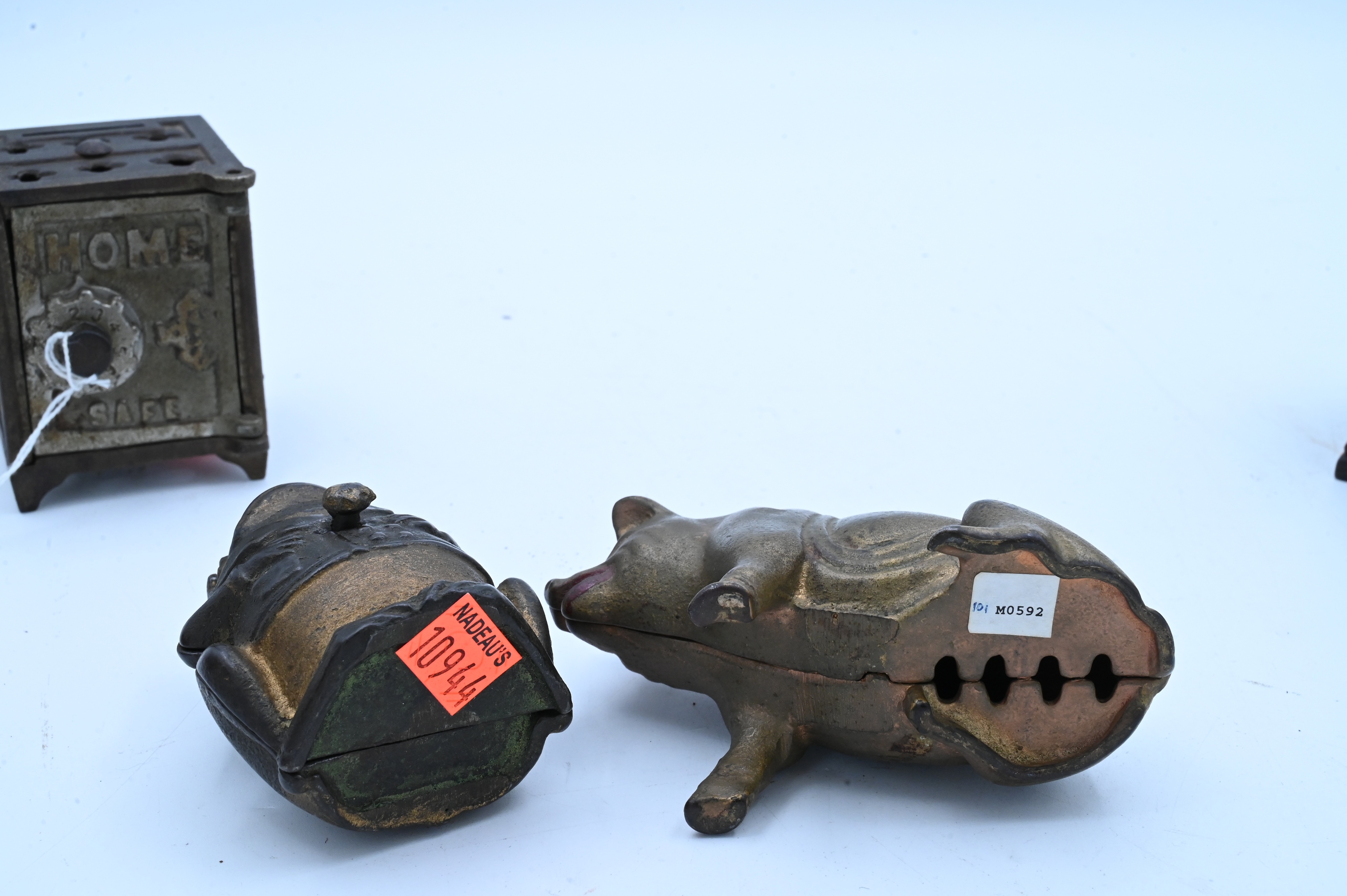 J.E. Stevens Cast “Always Did Spise A Mule” black memorabilia mechanical bank (mule with broken leg), “Professor Pug Frog” A. C. Williams Company Ravenna, Ohio, Circa 1915, “Home Safe” floor safe, J.E. Stevens 1887 cast iron roof bank, along with a seated pig