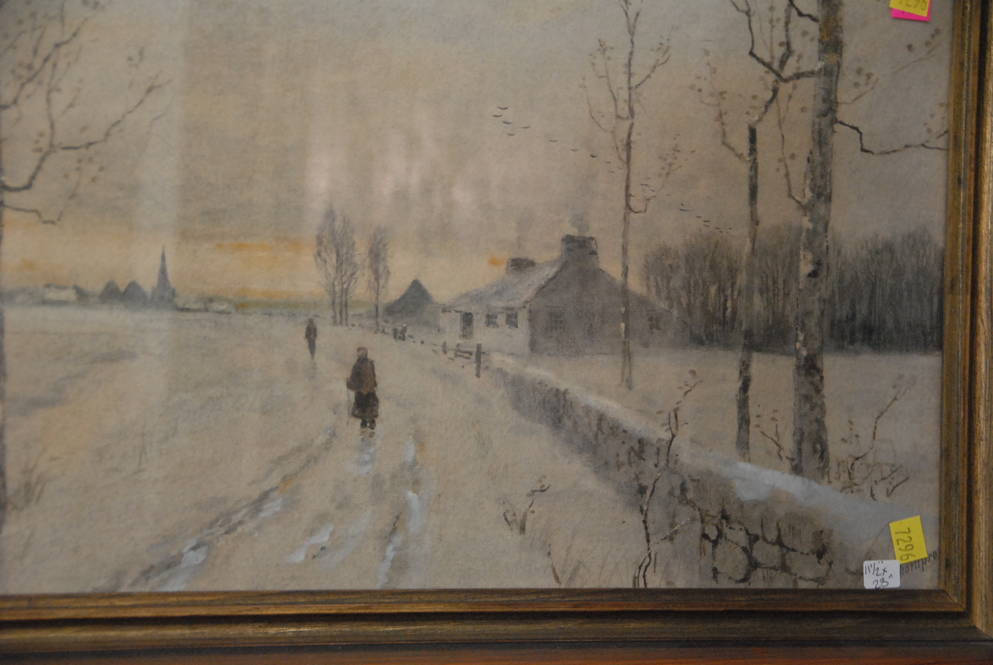 Lot 29: Five piece lot to include G. Thompson watercolor on paper of snowy road signed lower right G. Thompson with James Earle & Son galler…