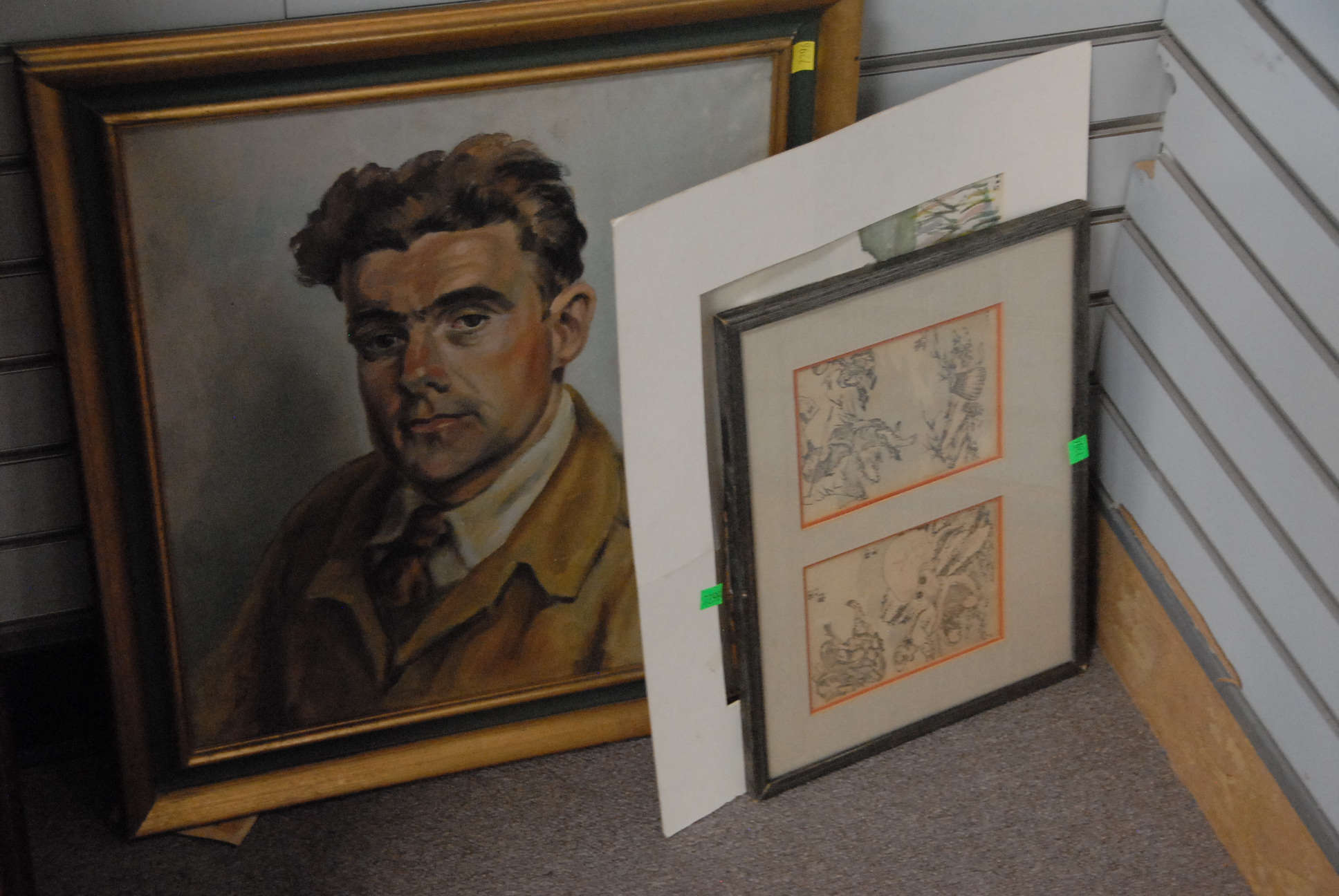 Five piece lot to include G. Thompson watercolor on paper of snowy road signed lower right G. Thompson with James Earle & Son gallery label on reverse, E. Spear watercolor ocean scene, Oriental print, unframed watercolor, and oil on canvas signed Archen.