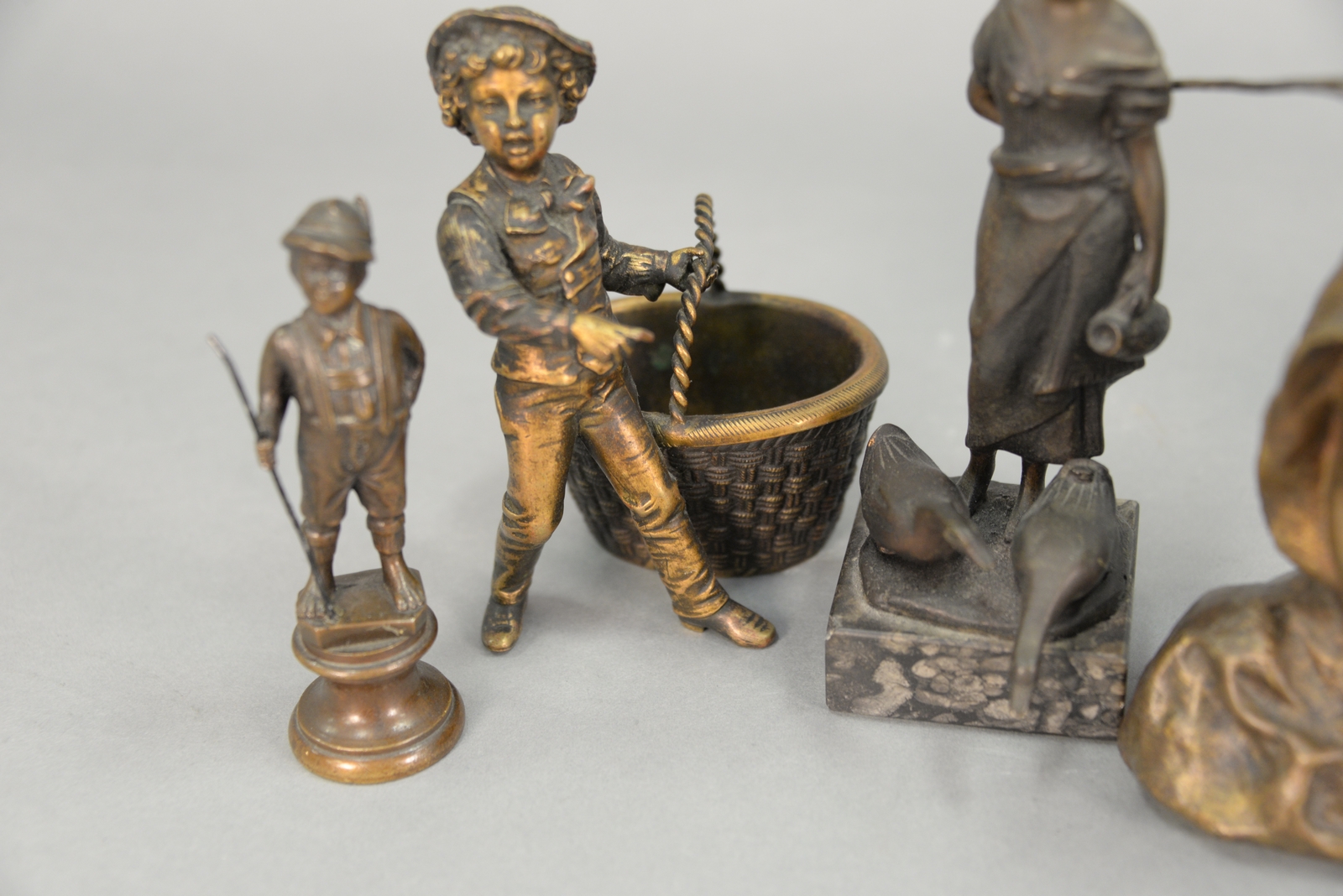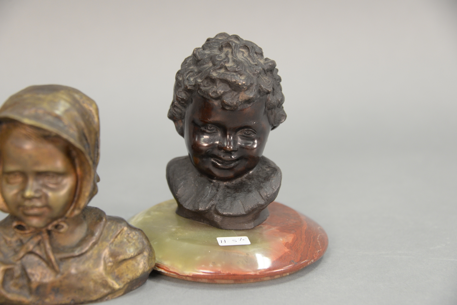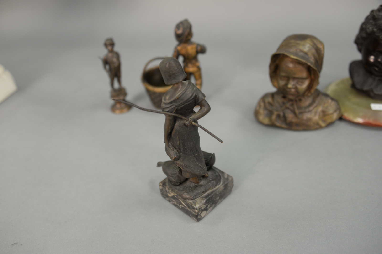 Five small bronzes including two bronze busts, a young hiking boy, boy with a basket, and a peasant girl with two geese. hts. 4 1/4in. to 6 1/2in.