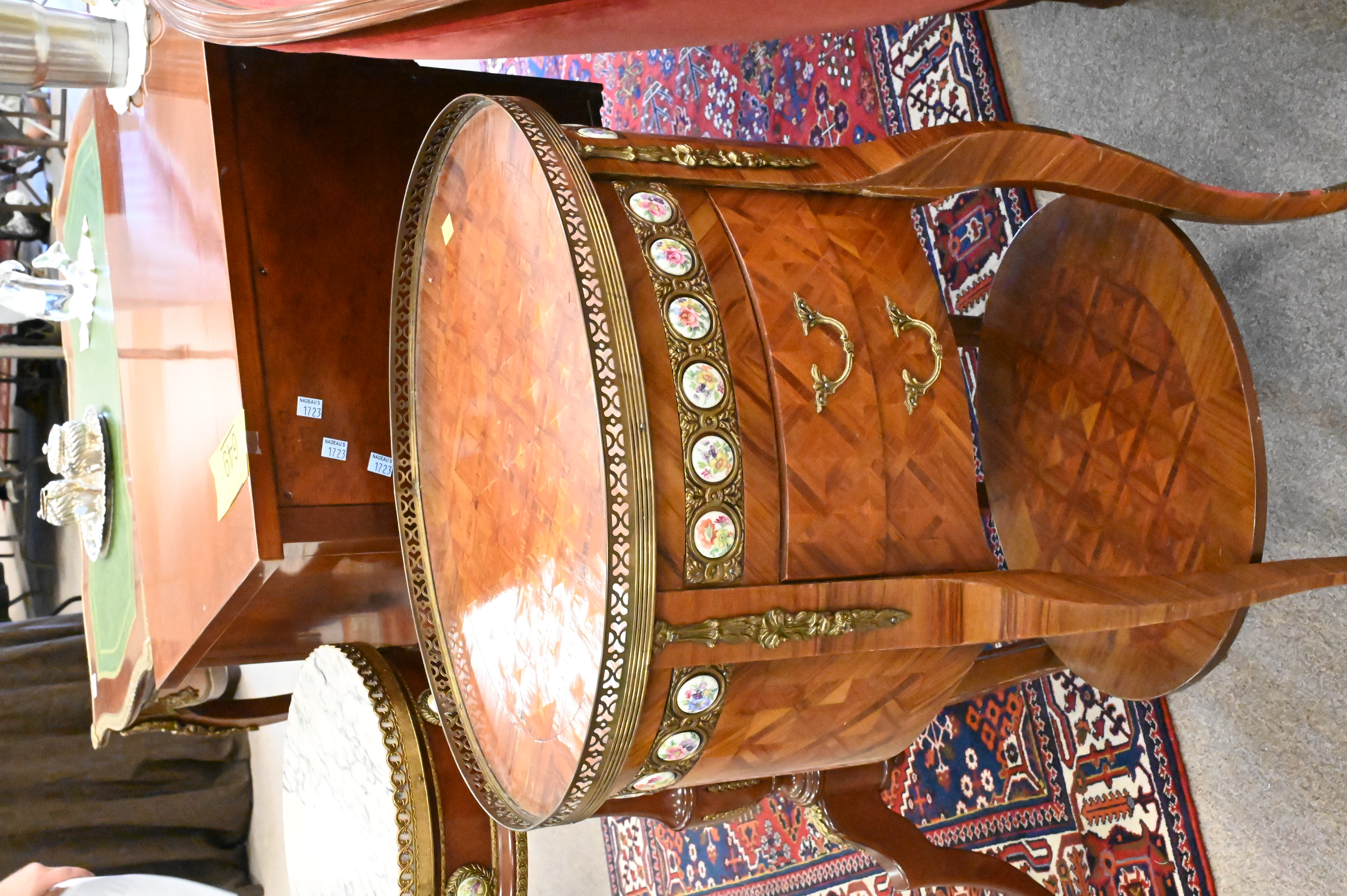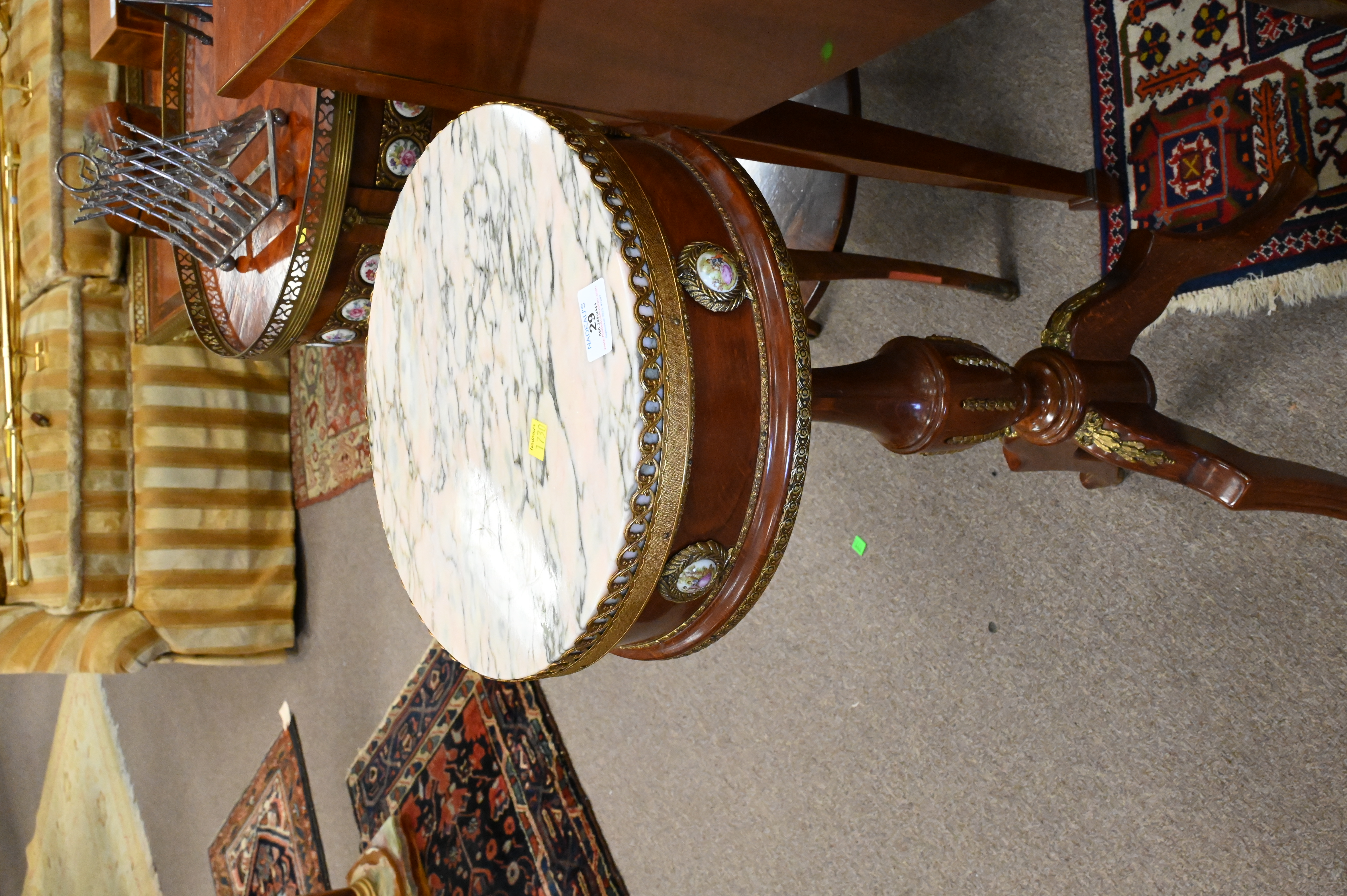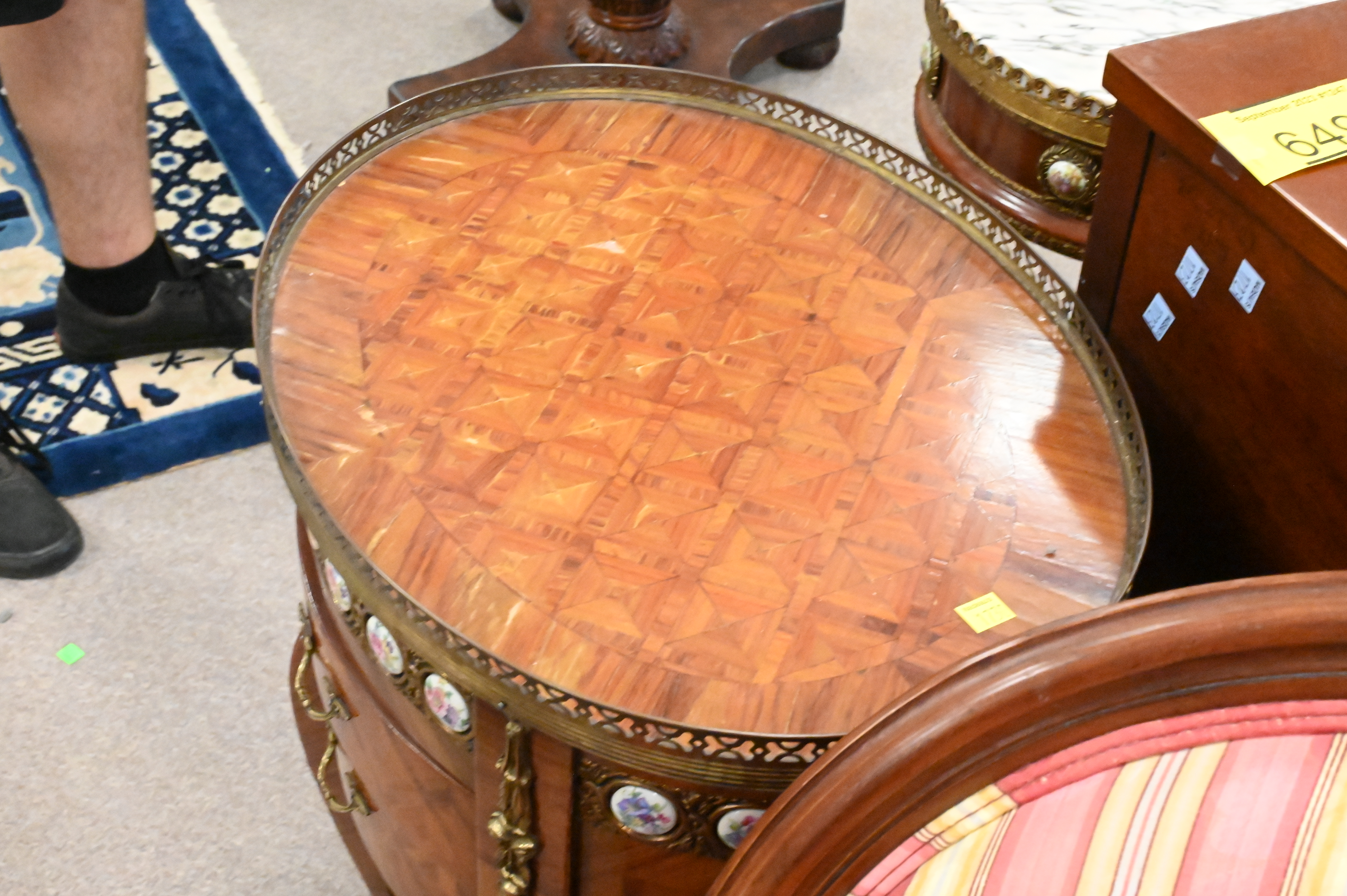Four Piece French Empire Revival Table Lot to Include, a pair of Louis XV style oval stands having two drawers each and brass trim along with porcelain inserts measuring at a height of 31 inches and top of 15″x20″,and a pair of round marble top stands with a height of 31 inches and diameter of 13 inches.