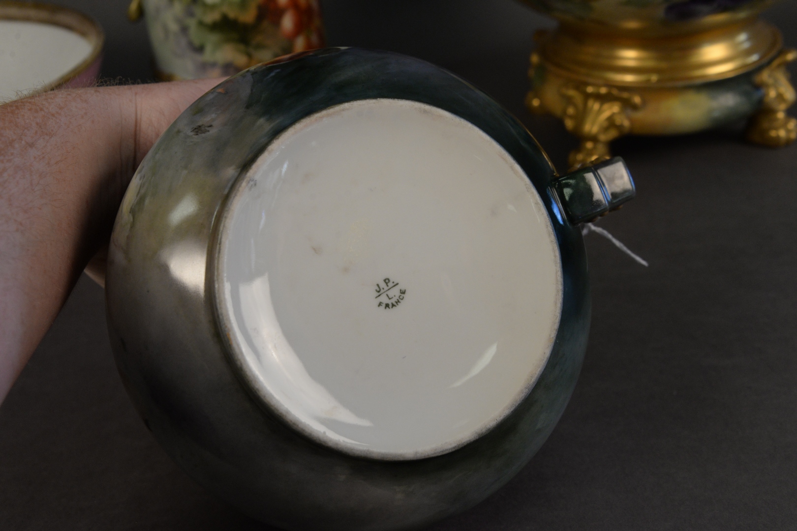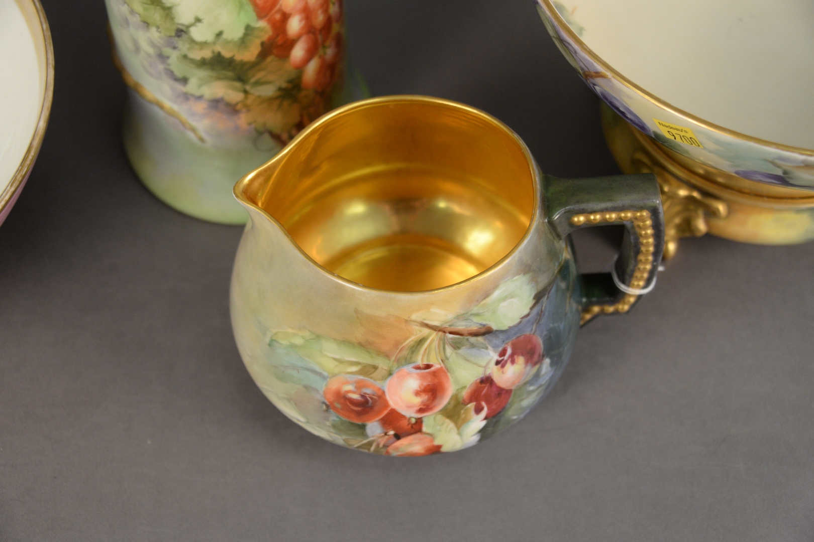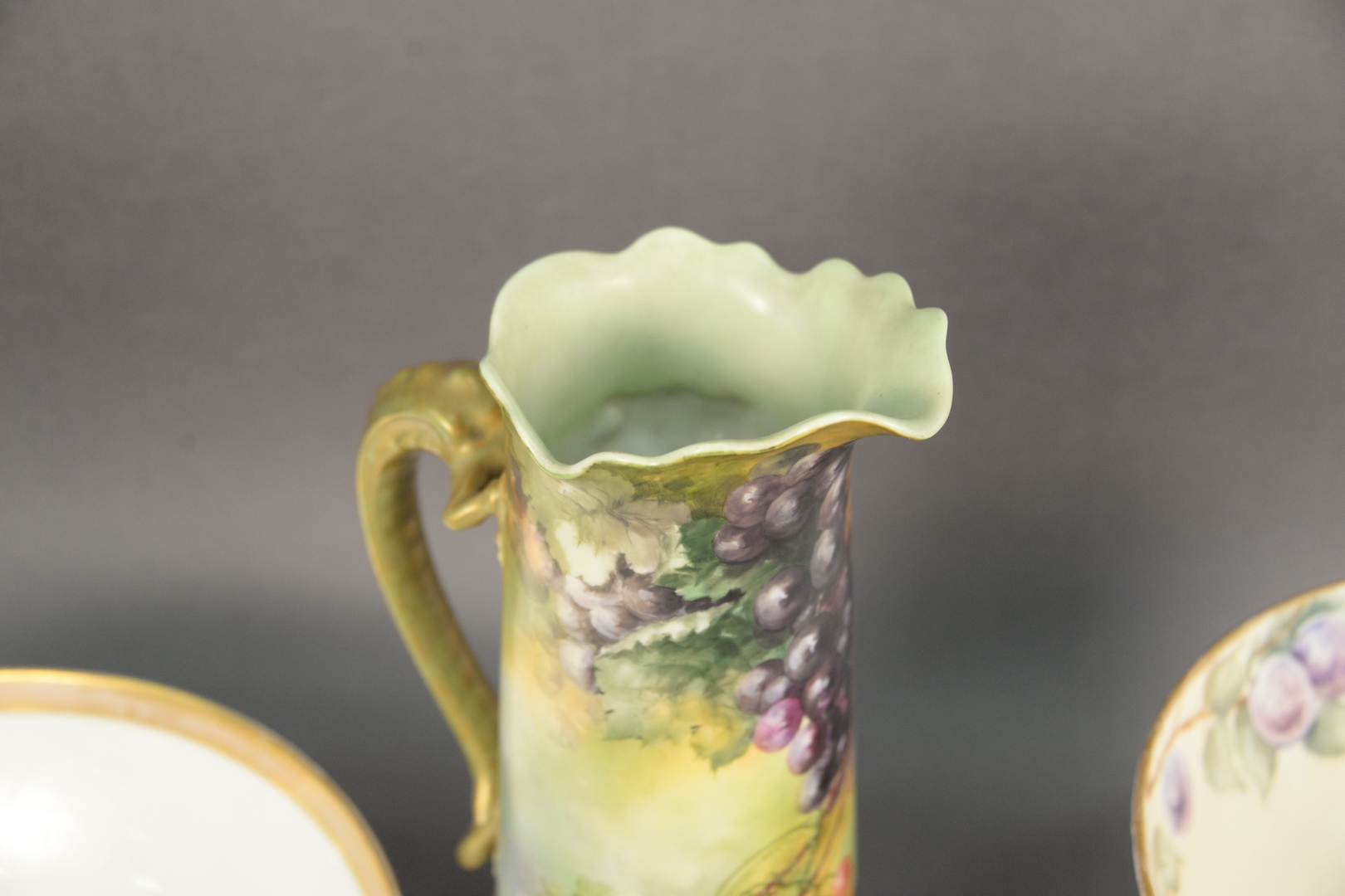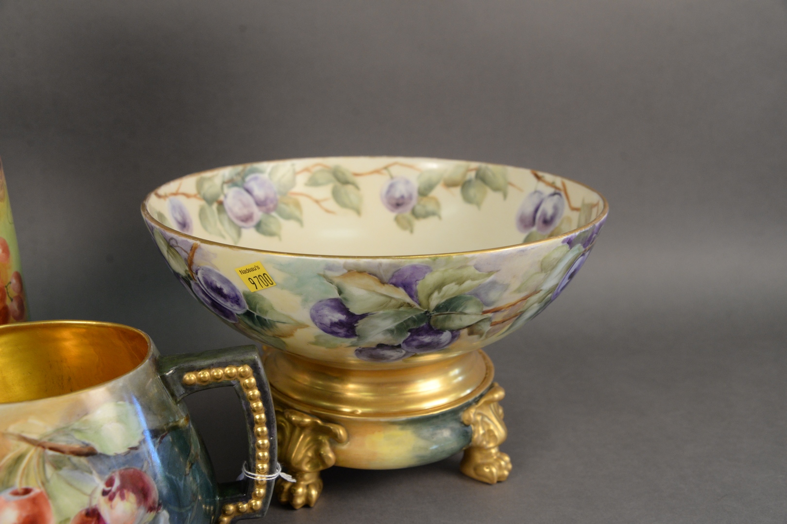 Lot 29: Four Piece Group of Limoge Porcelain, to include a pitcher having a dragon form handle, a bowl resting on a footed base, a large bowl, along with a short pitcher, each having a fruit motif and marked to the underside, height 14 1/2 inches. Provenance: Estate of James Wadhams.