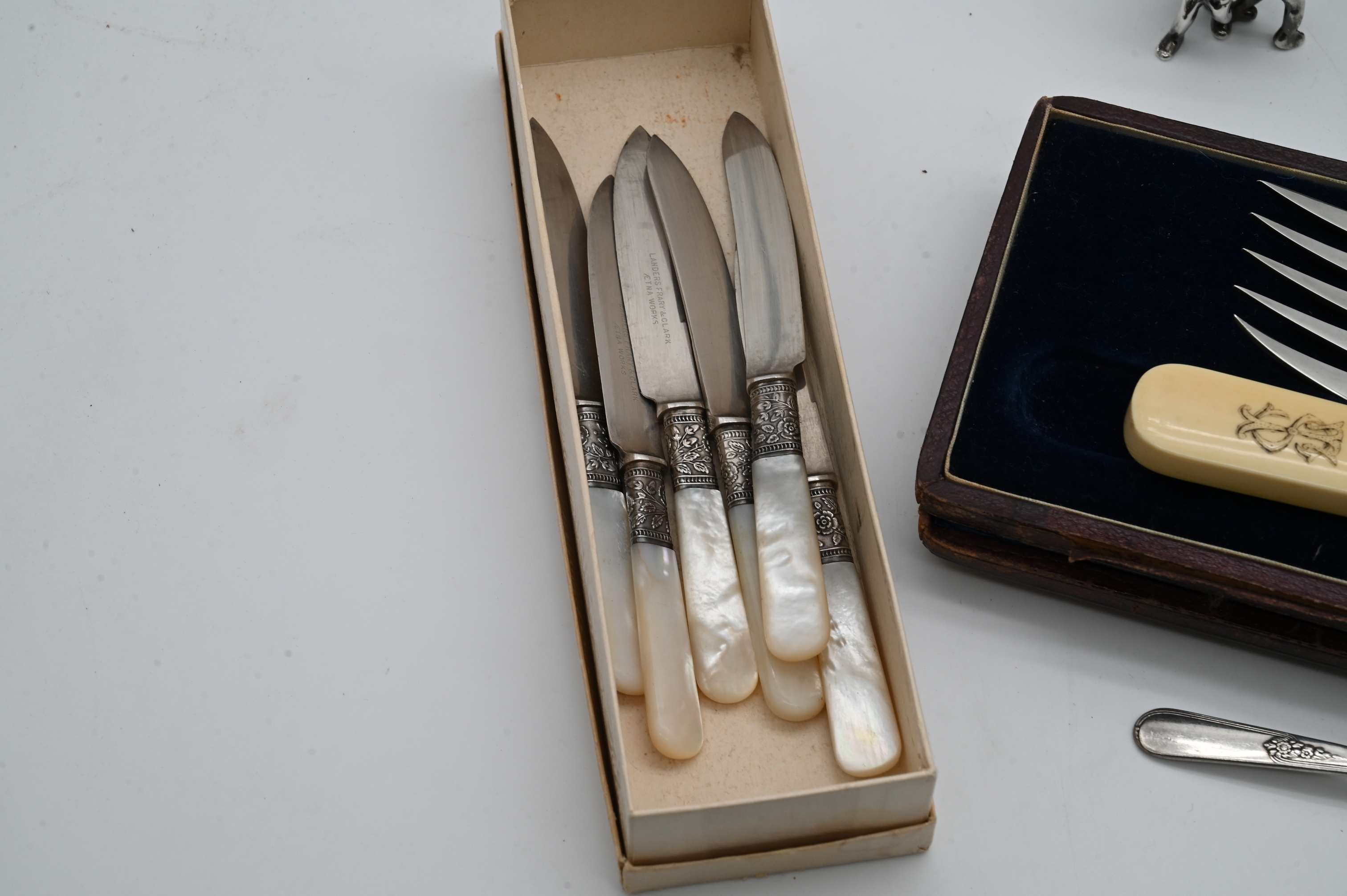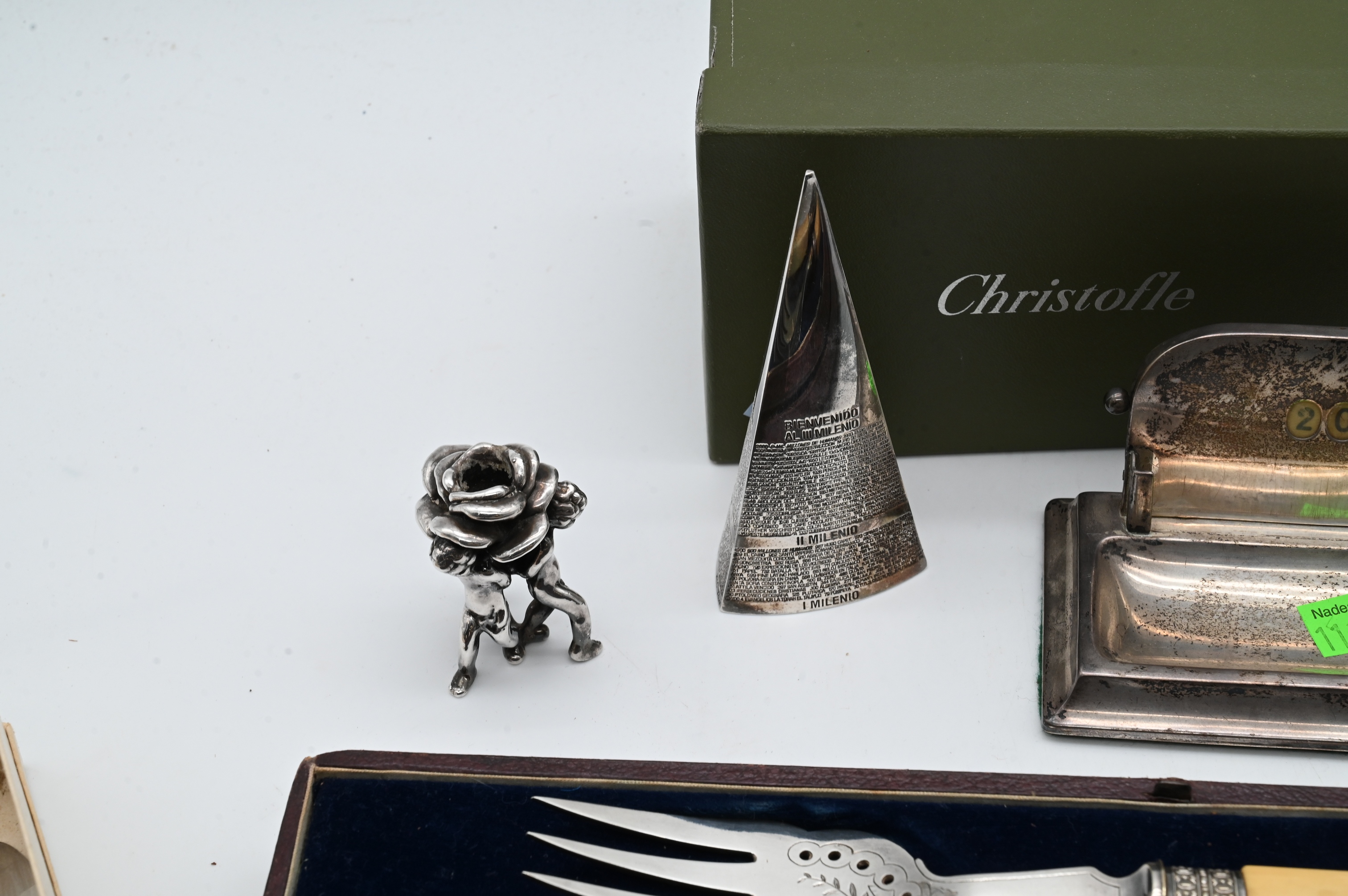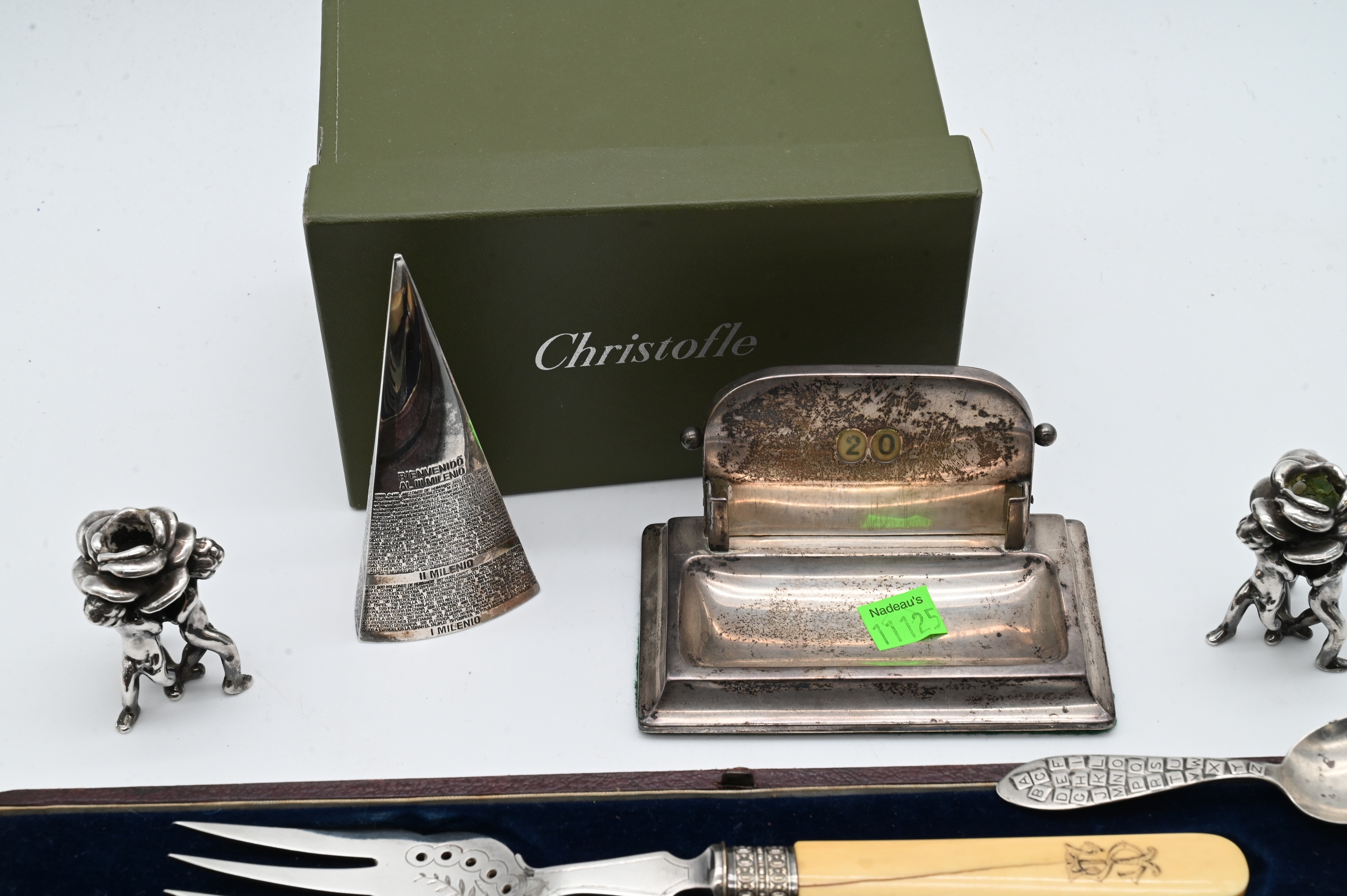 to include Christofle pyramid, pair of sterling silver cherub candlesticks, sterling card holder, and toothbrush, along with silver plate 19th century serving piece, and knives