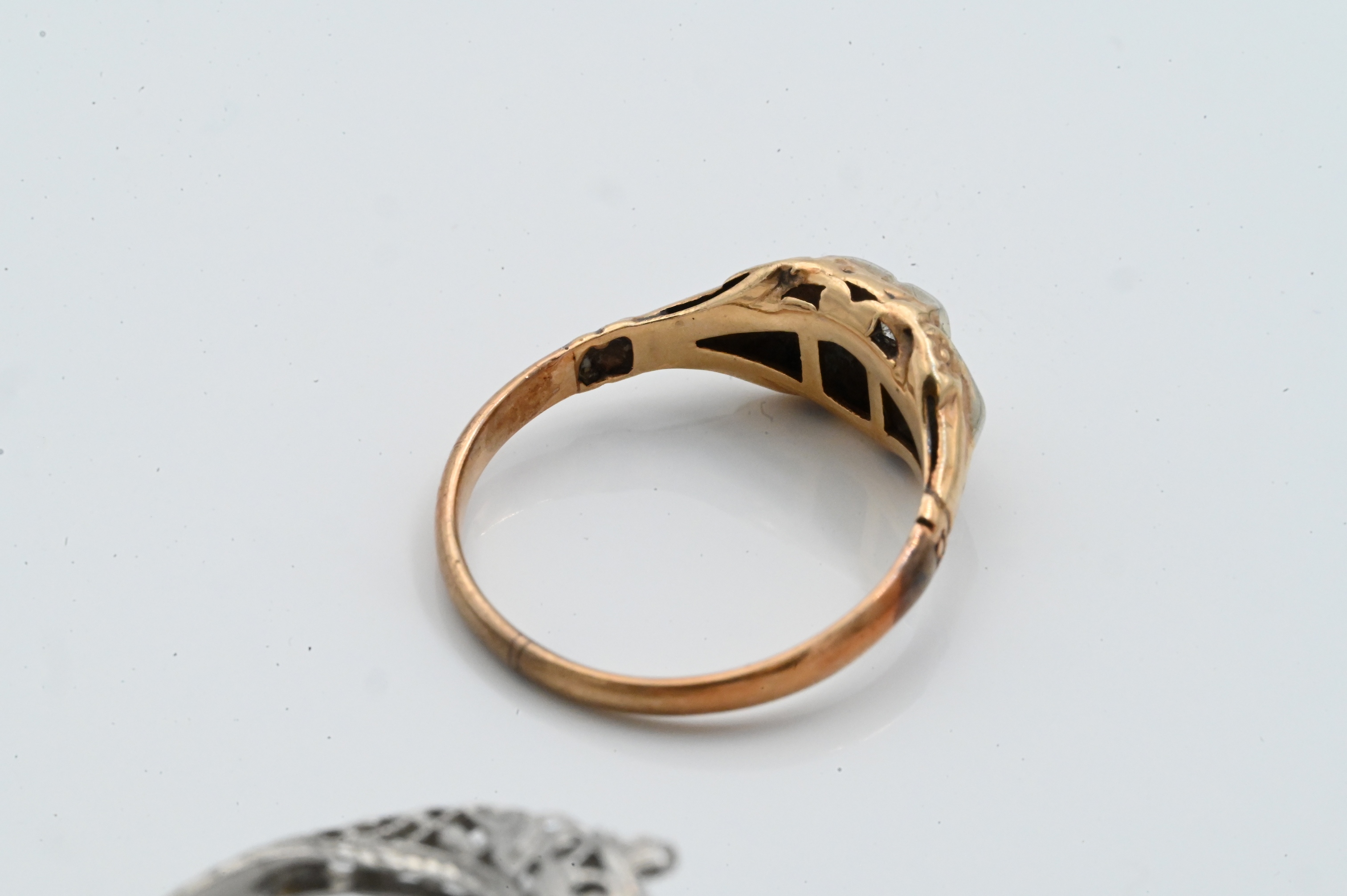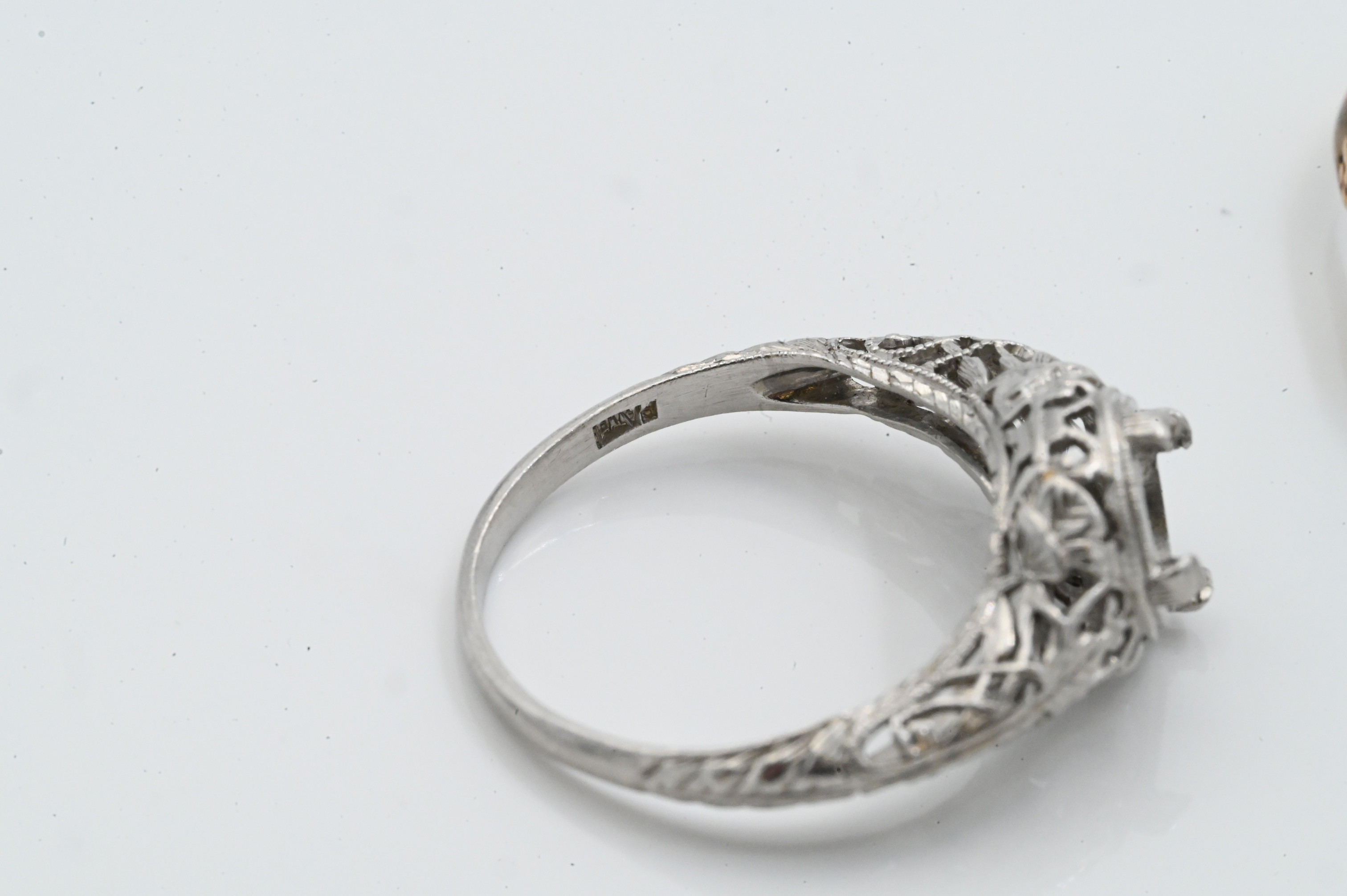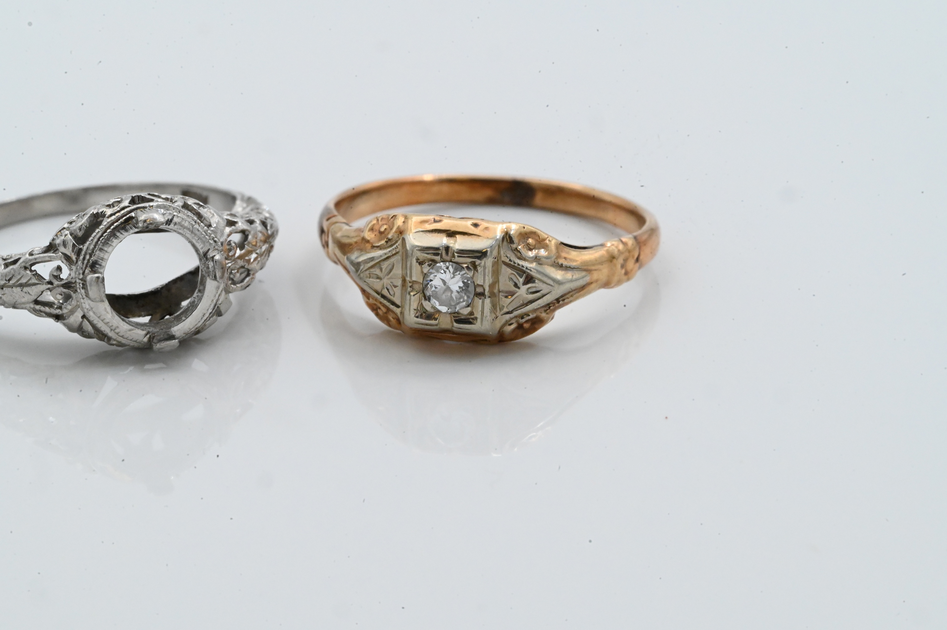one platinum filigree ring mounting (center stone missing) and one 14K yellow gold ring of engraved design centering a round diamond weighing approximately 0.10 Ct.