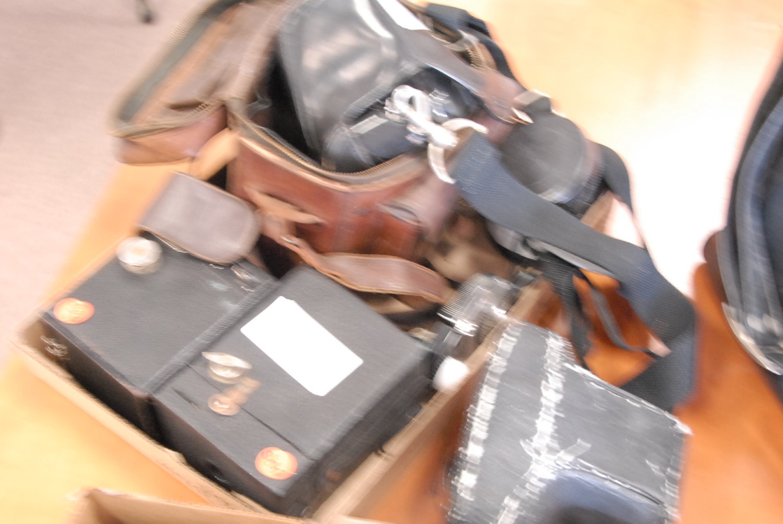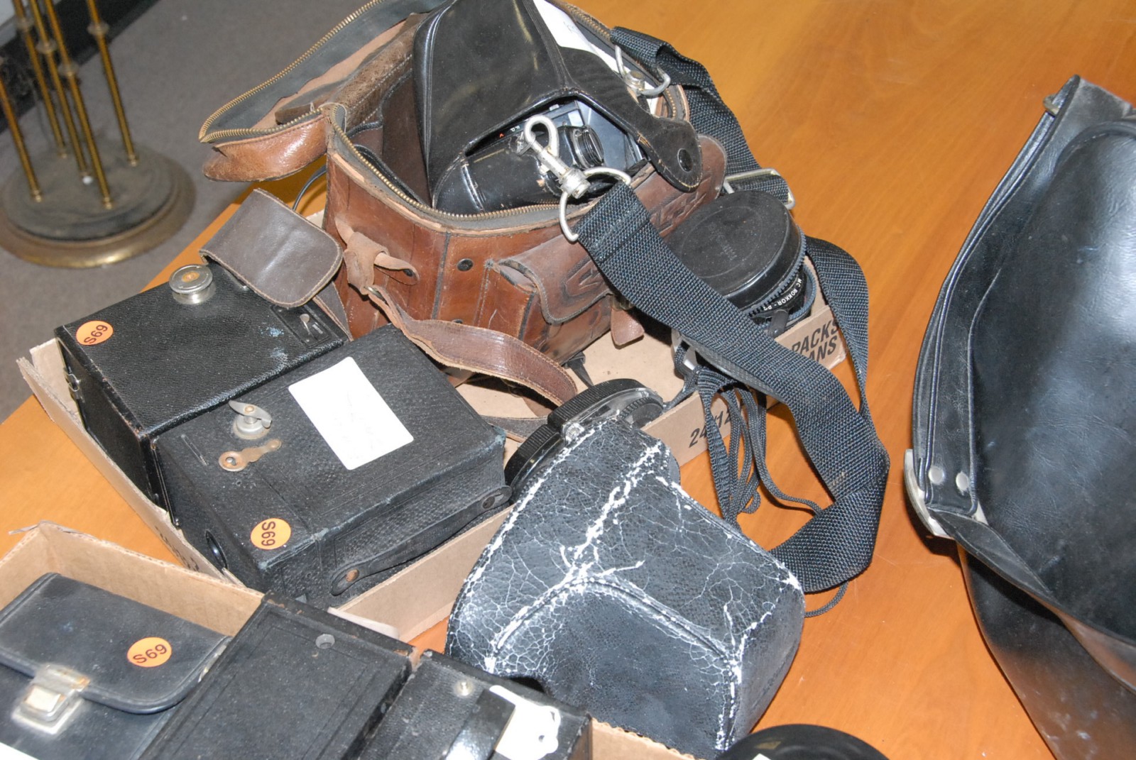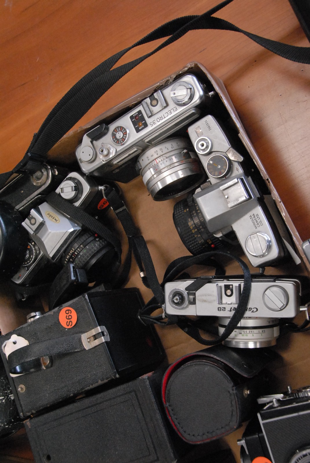 Large grouping of vintage cameras including a Minolta, a Yashica mat 124 box camera, and several others