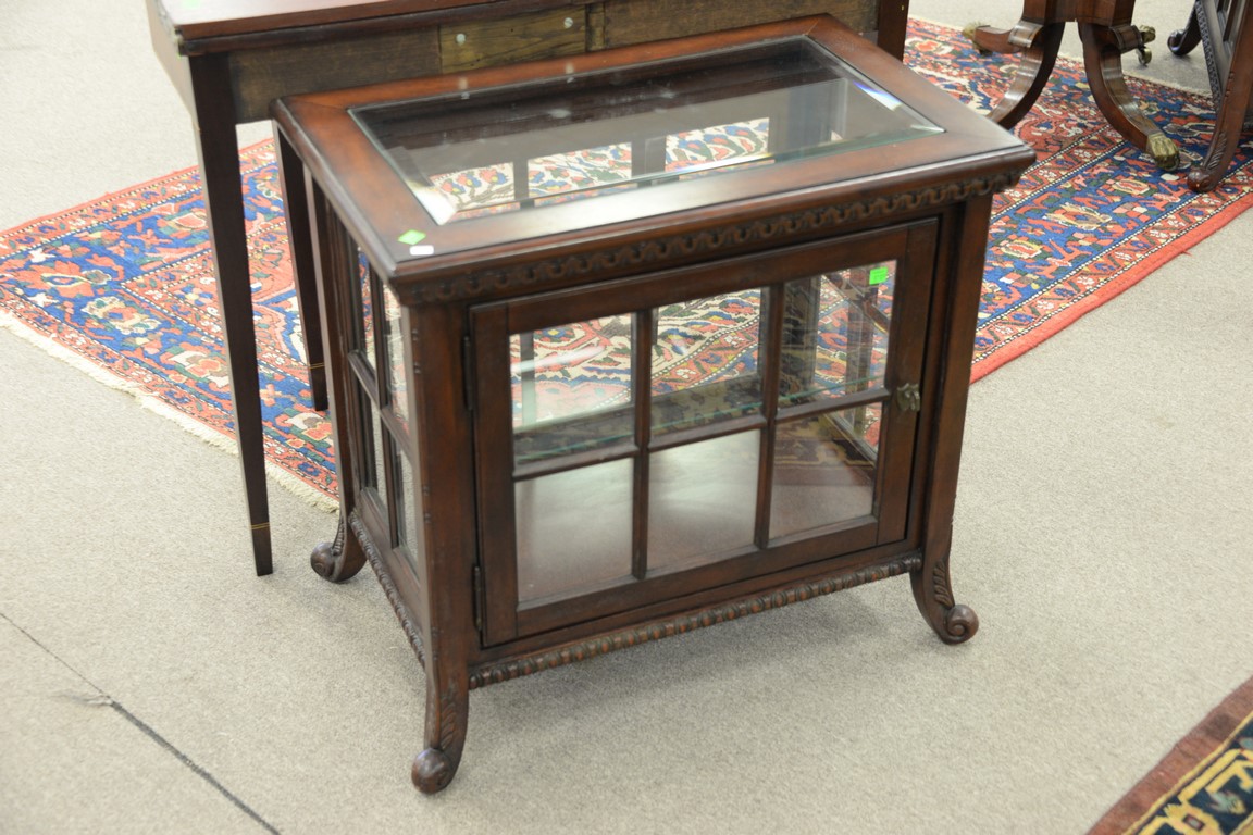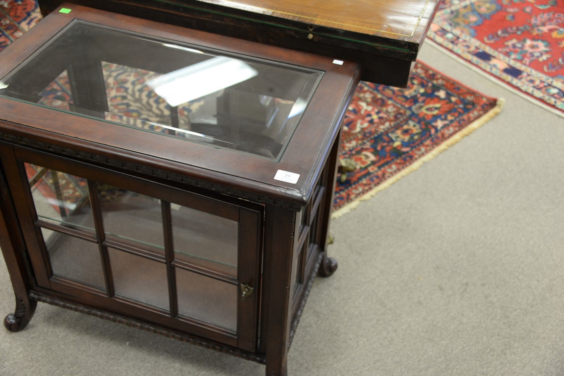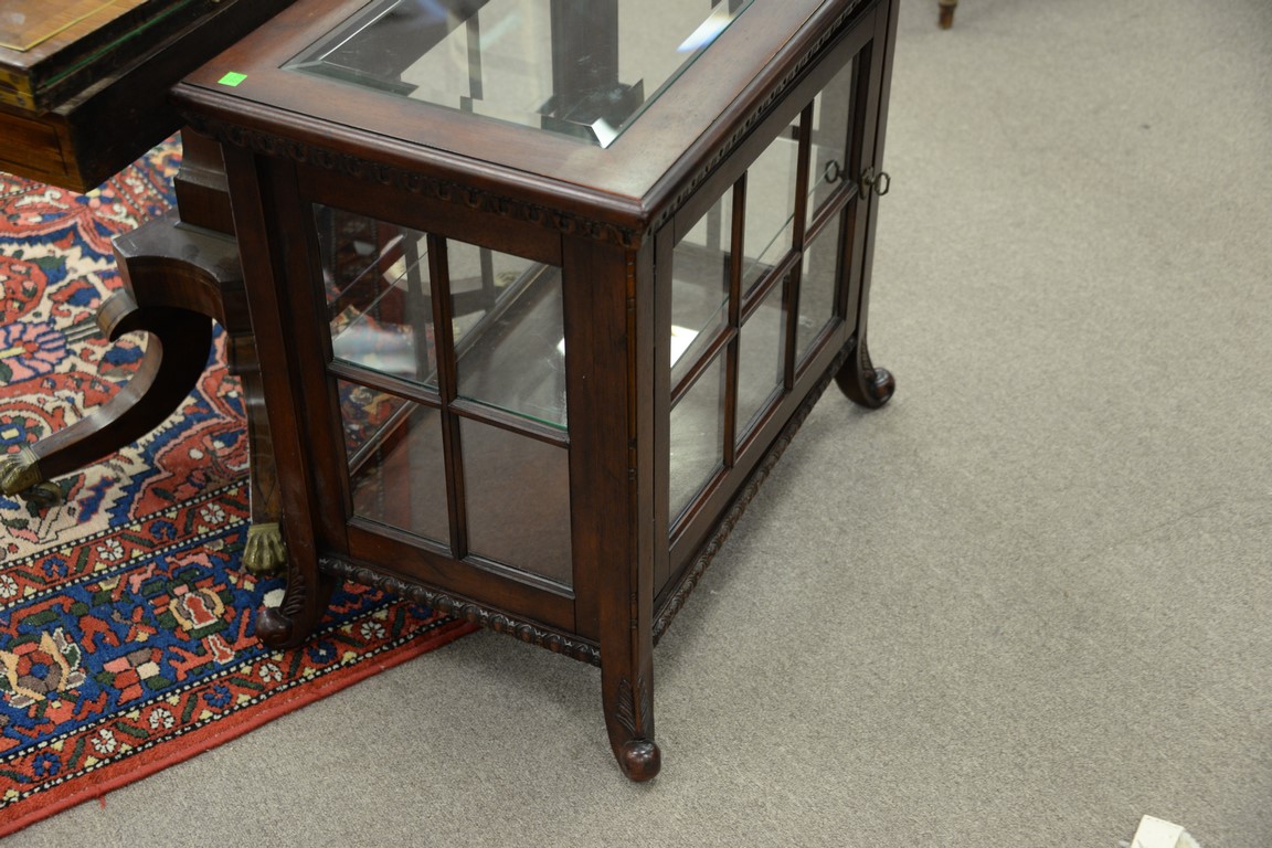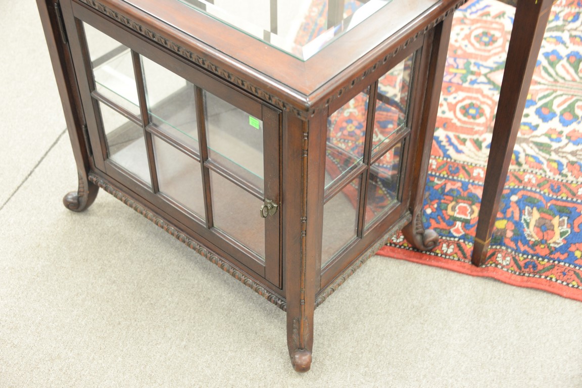Lot 29: Pair of Contemporary glass top curio end tables, each with glass shelf. ht. 26in., top: 18 x 27