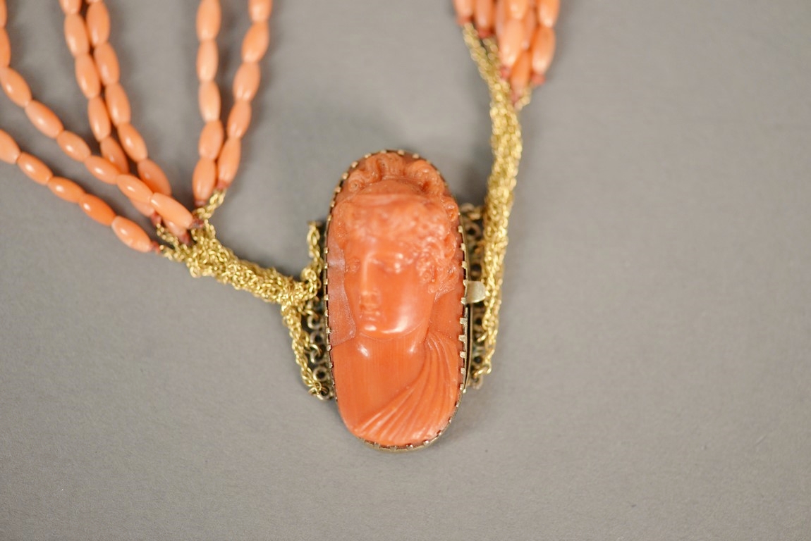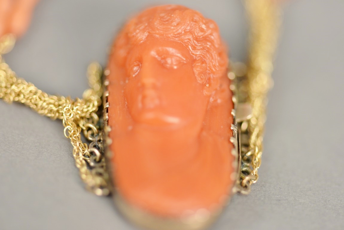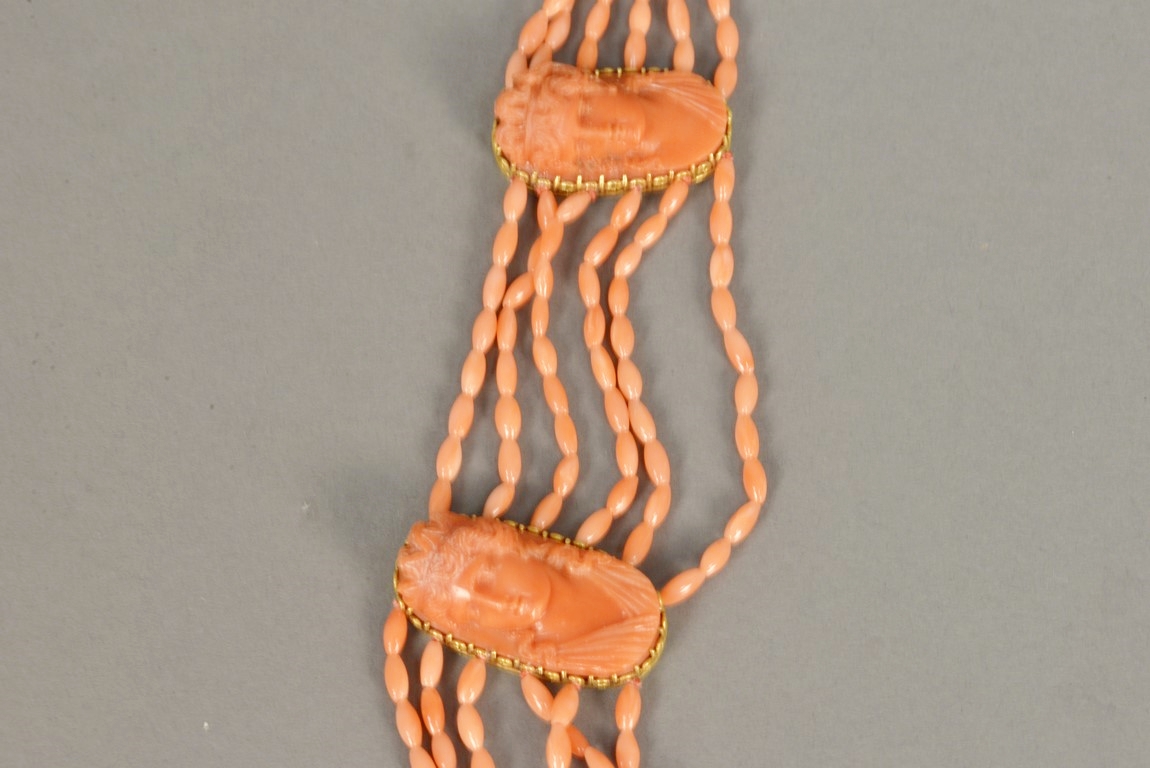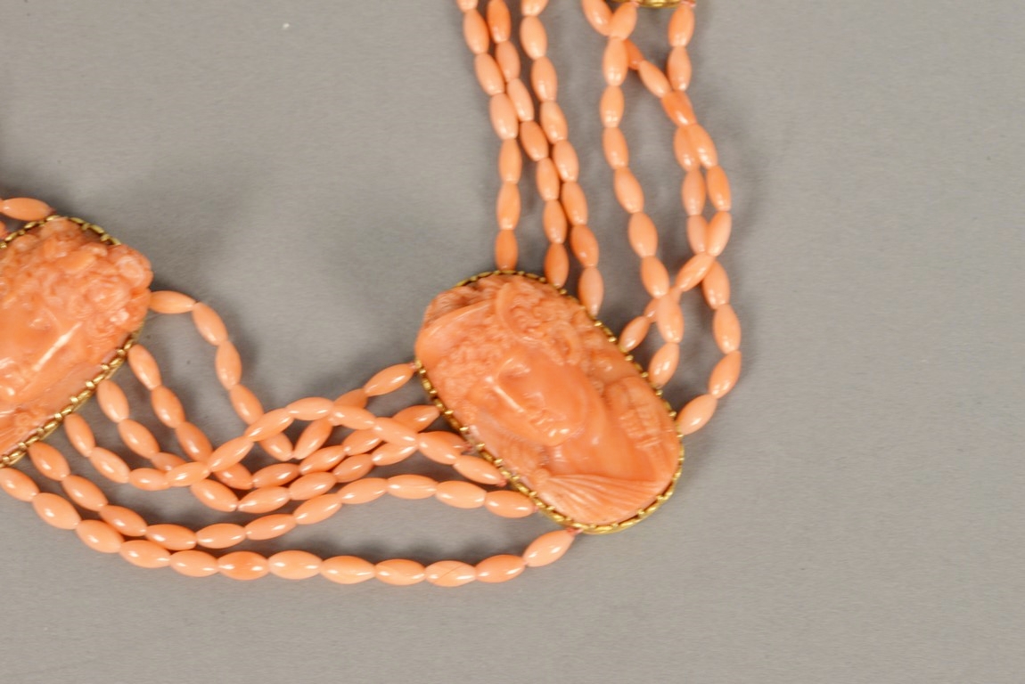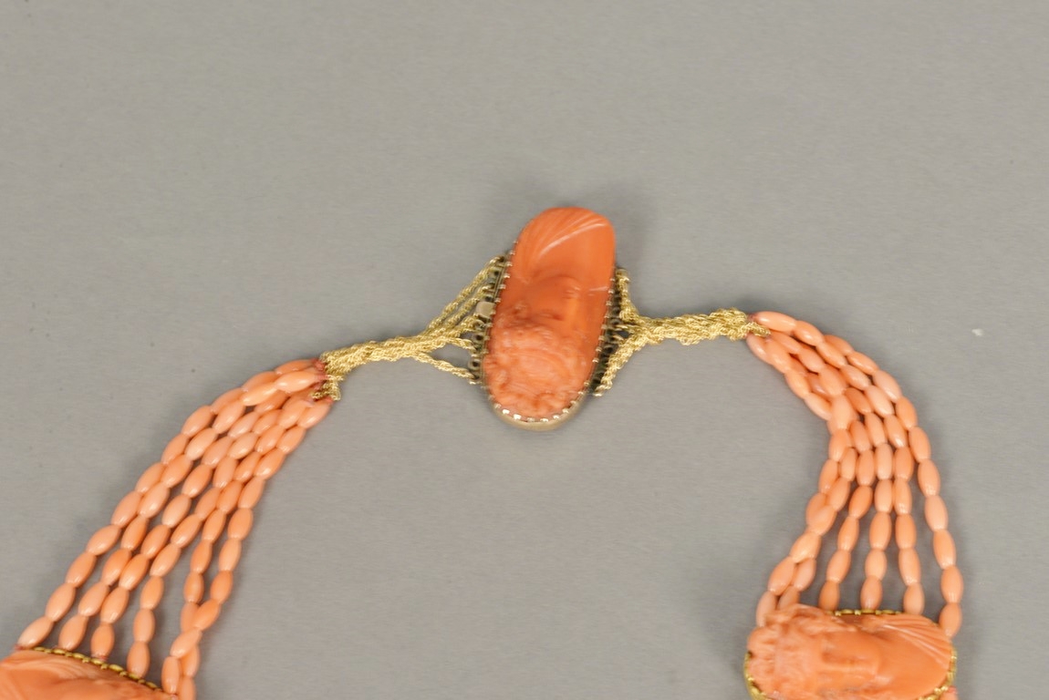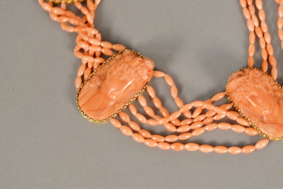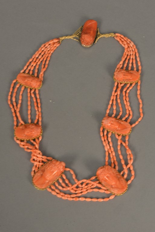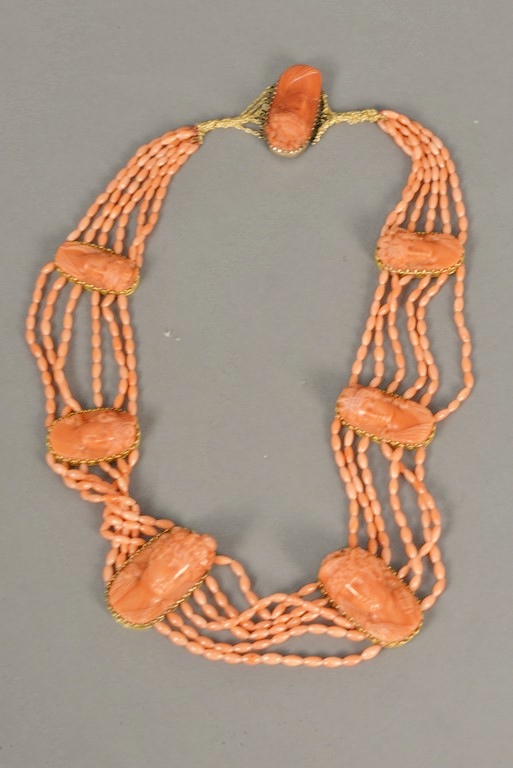 Pink coral necklace made up of seven carved cameo type women mounted in gold connected by six strands of coral oval beads. lg. 21 in. Provenance: Property from the Estate of Sylvia Leven of Bloomfield, Connecticut.