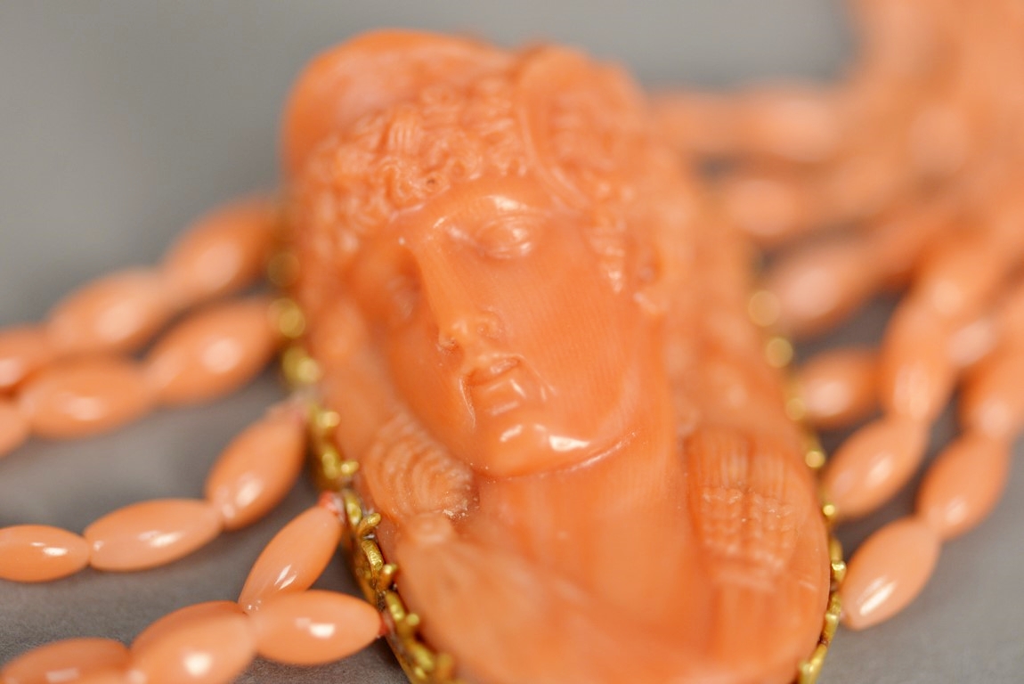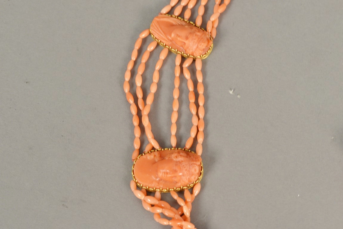 Lot 29: Pink coral necklace made up of seven carved cameo type women mounted in gold connected by six strands of coral oval beads. lg. 21…