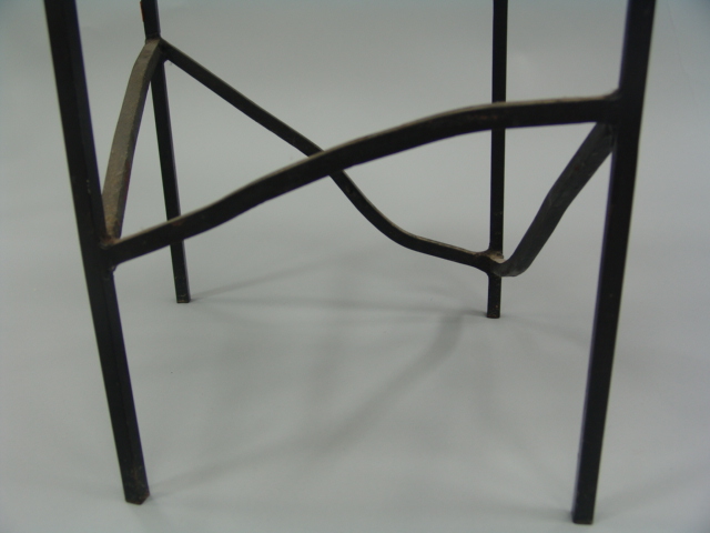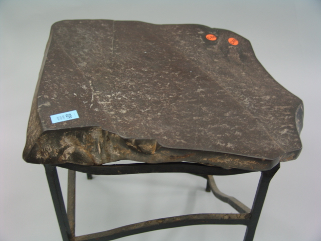 Polished stone table with an iron base