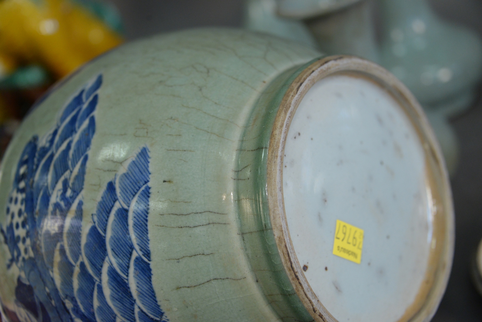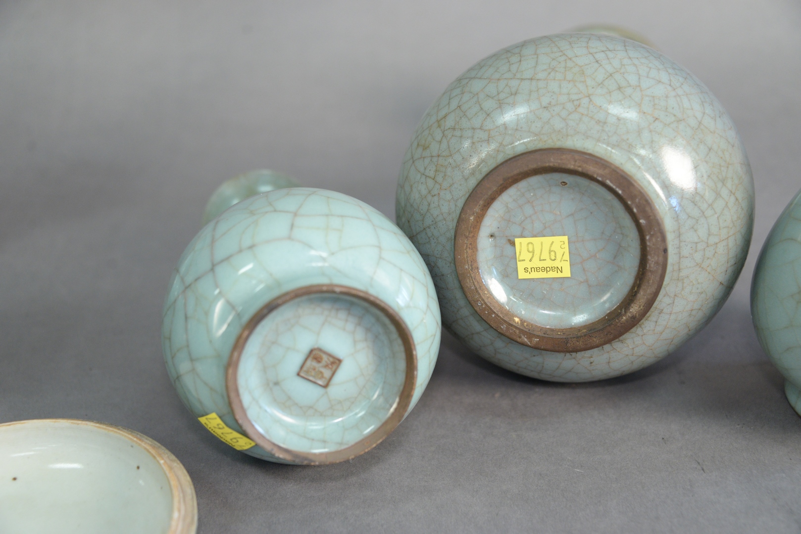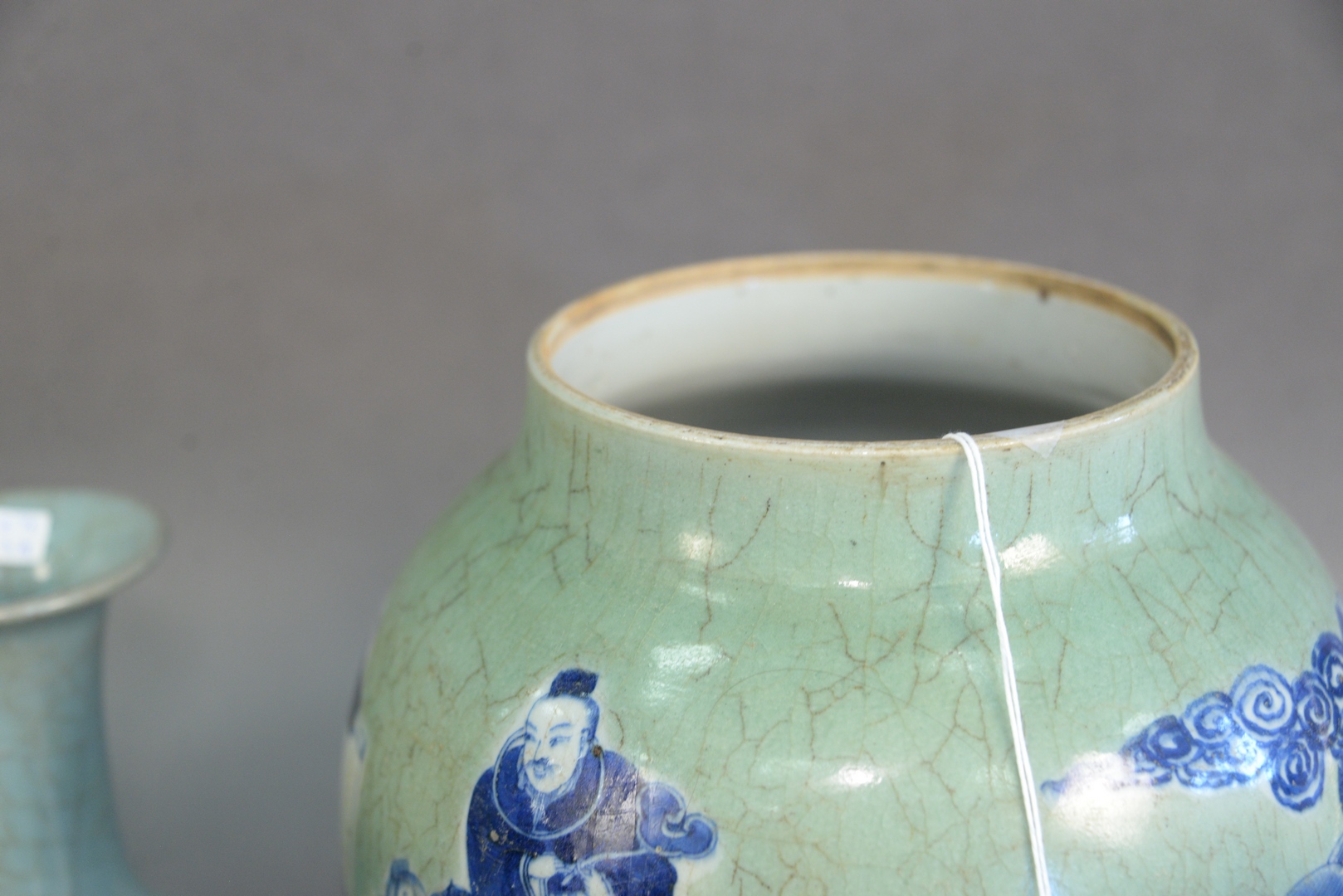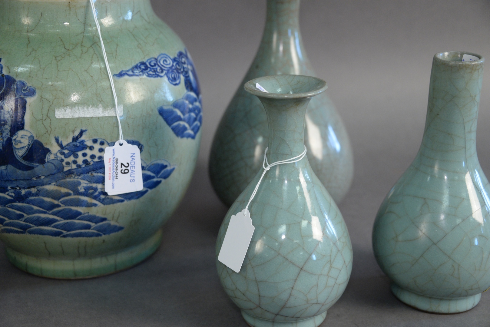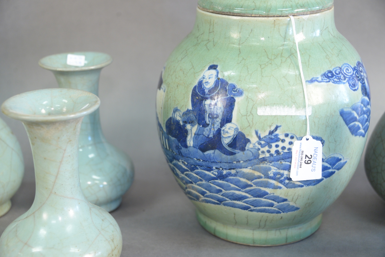 Lot 29: Seven Piece Group to include a Chinese celadon crackle glaze lidded jar having blue figures in a landscape, unmarked; along with six Chinese celadon crackle glaze vases, each stamped to the underside, height of tallest 10 1/4 inches.
