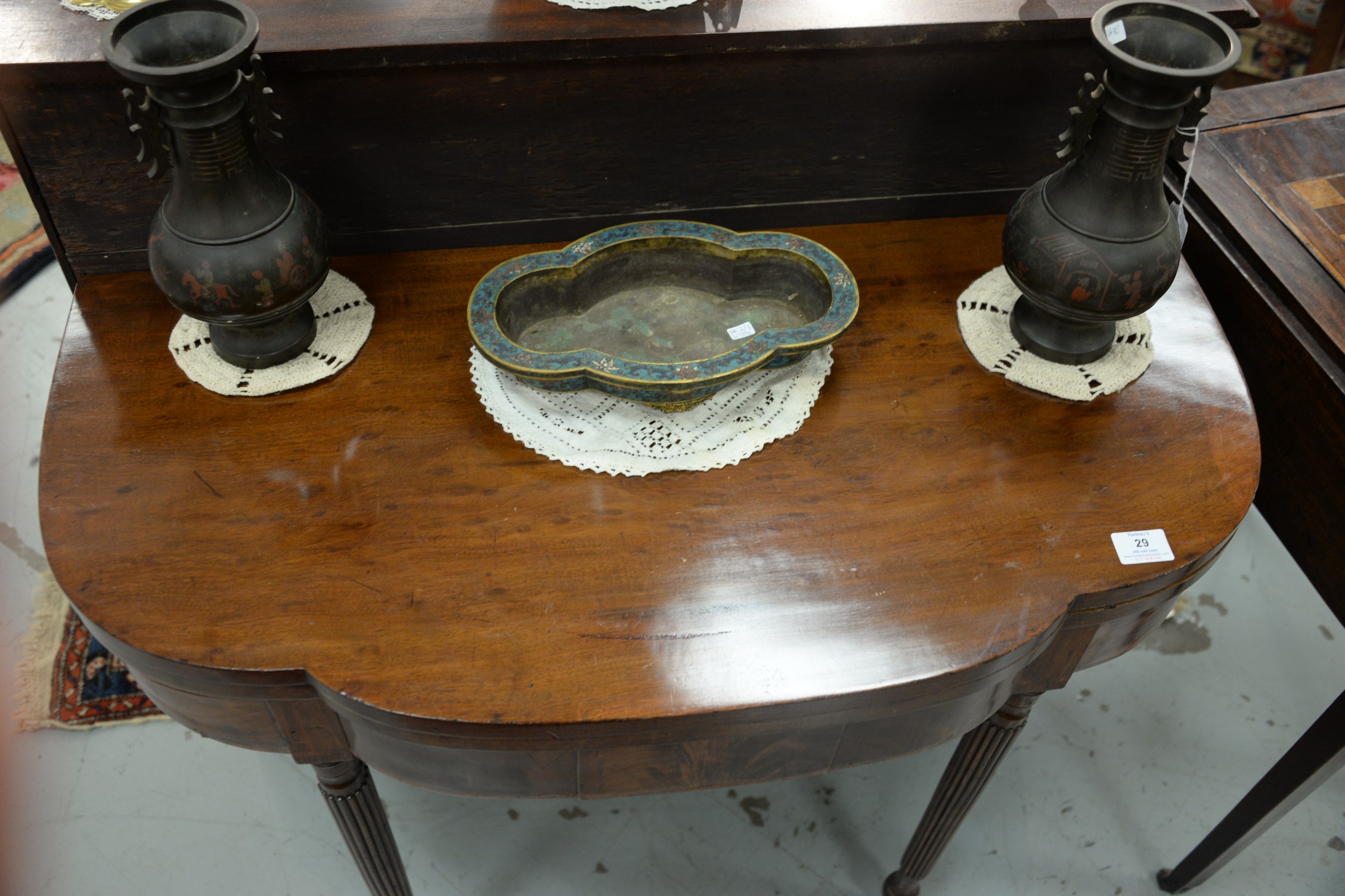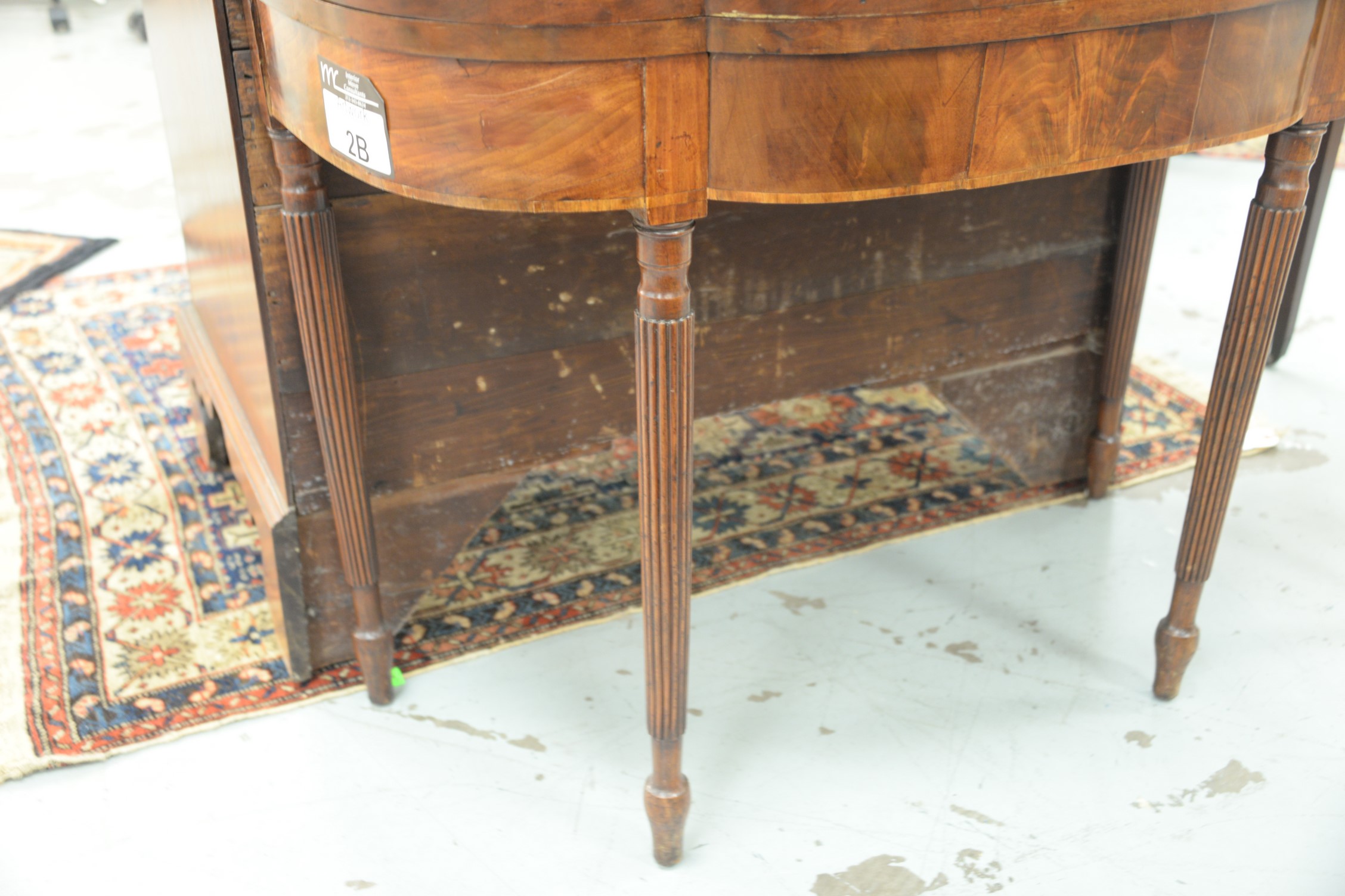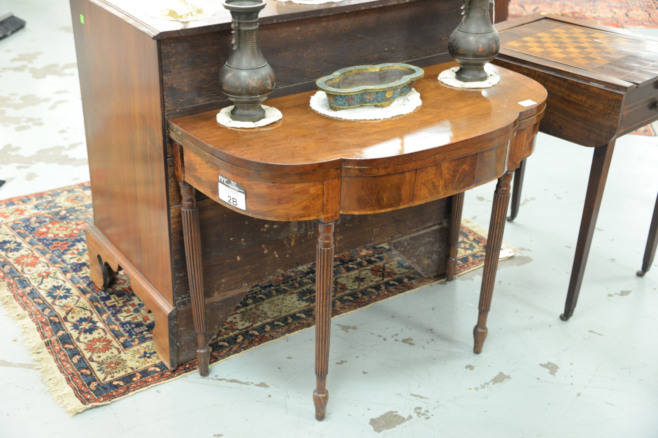 Lot 29: Sheraton mahogany game table having D form with conforming frieze set on turned and fluted legs, circa 1830. ht. 28 in. wd. 36 i…