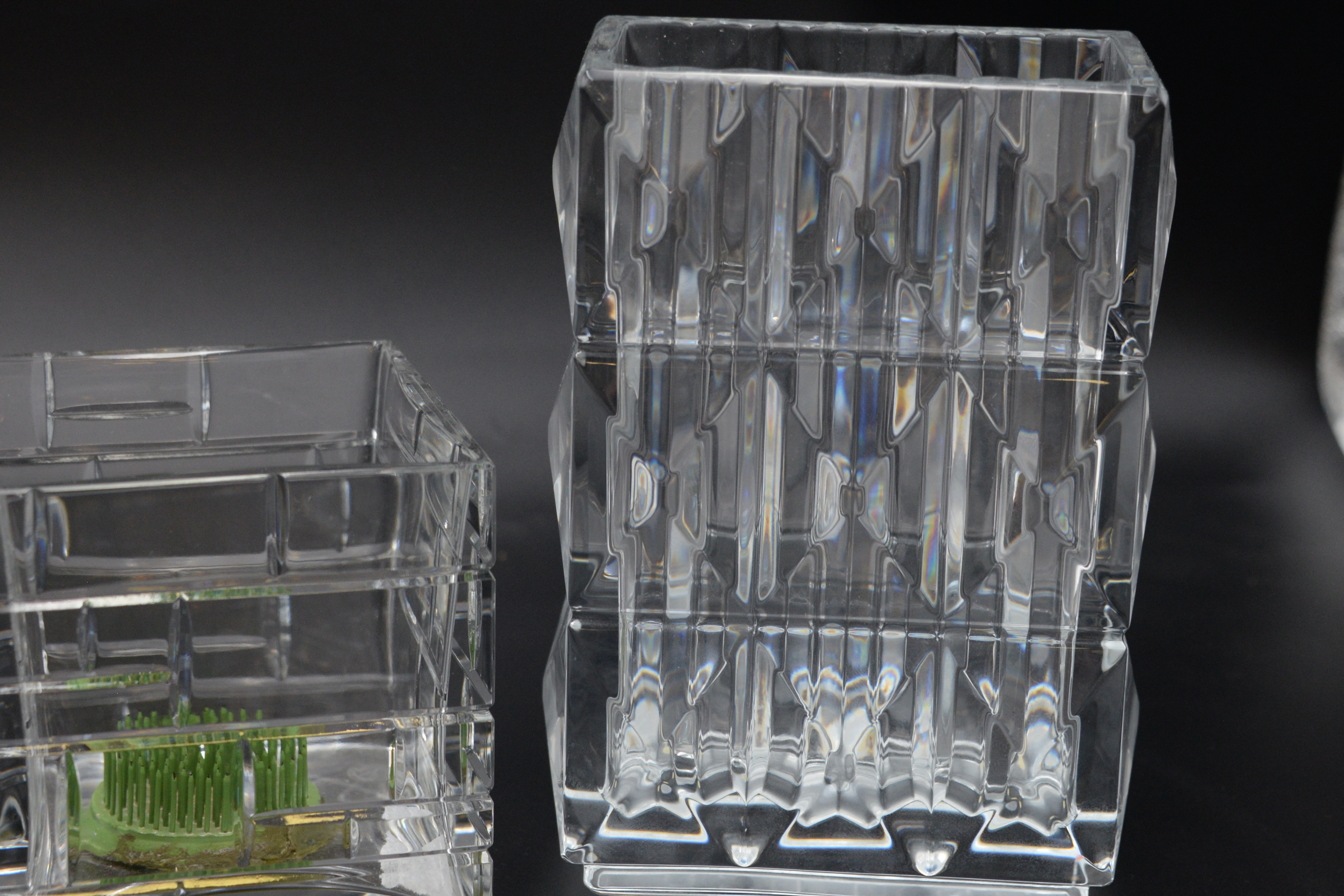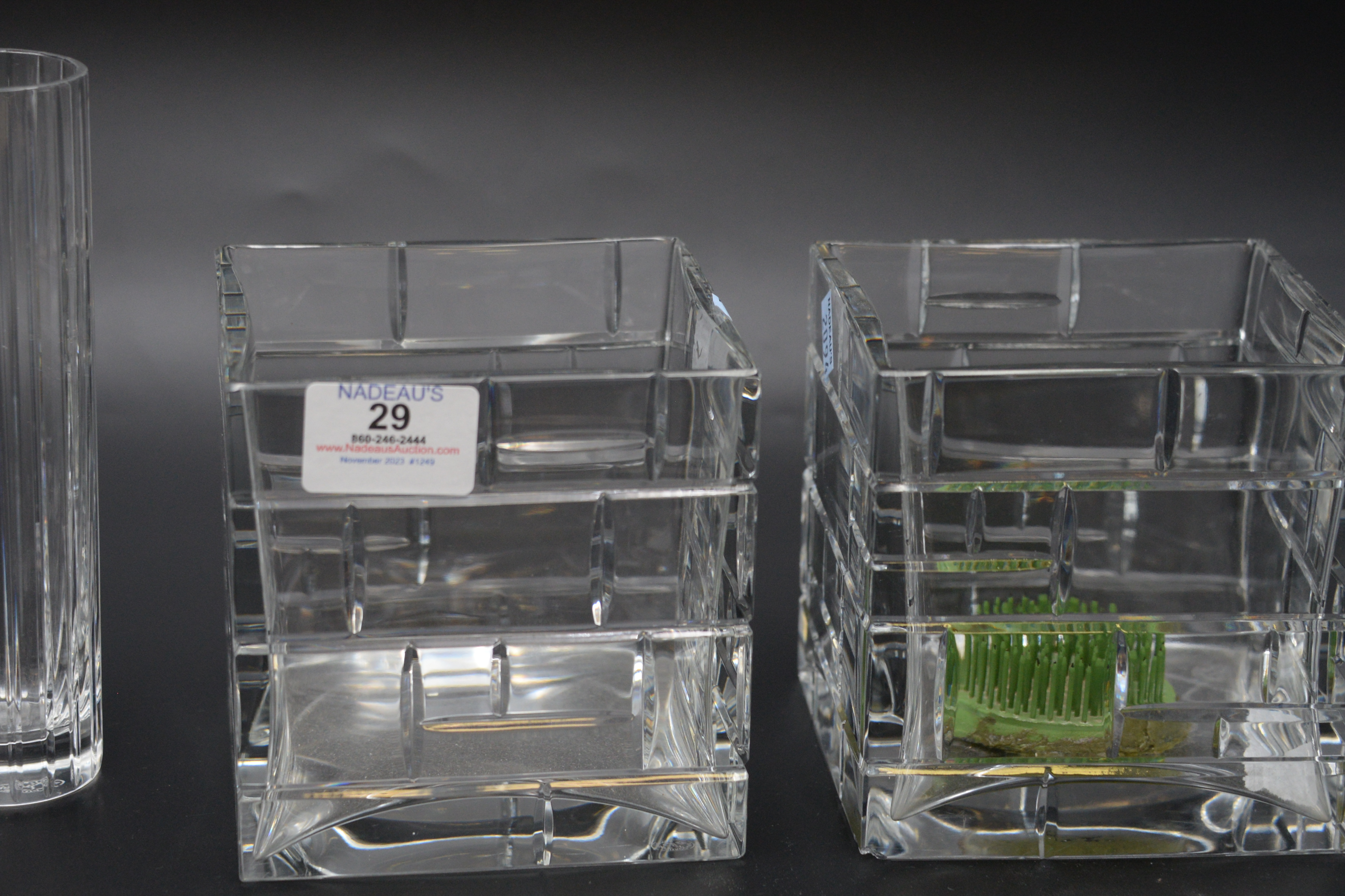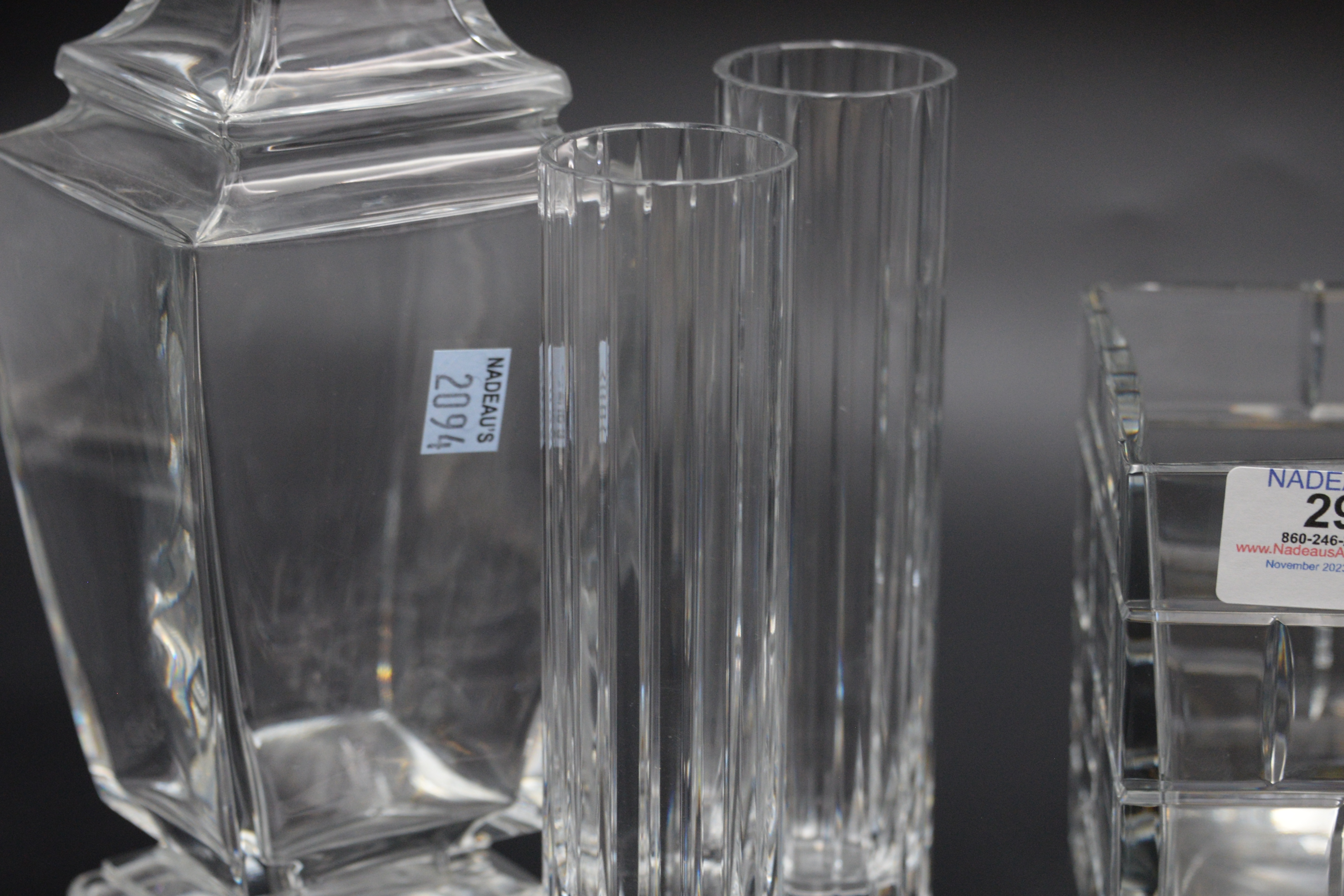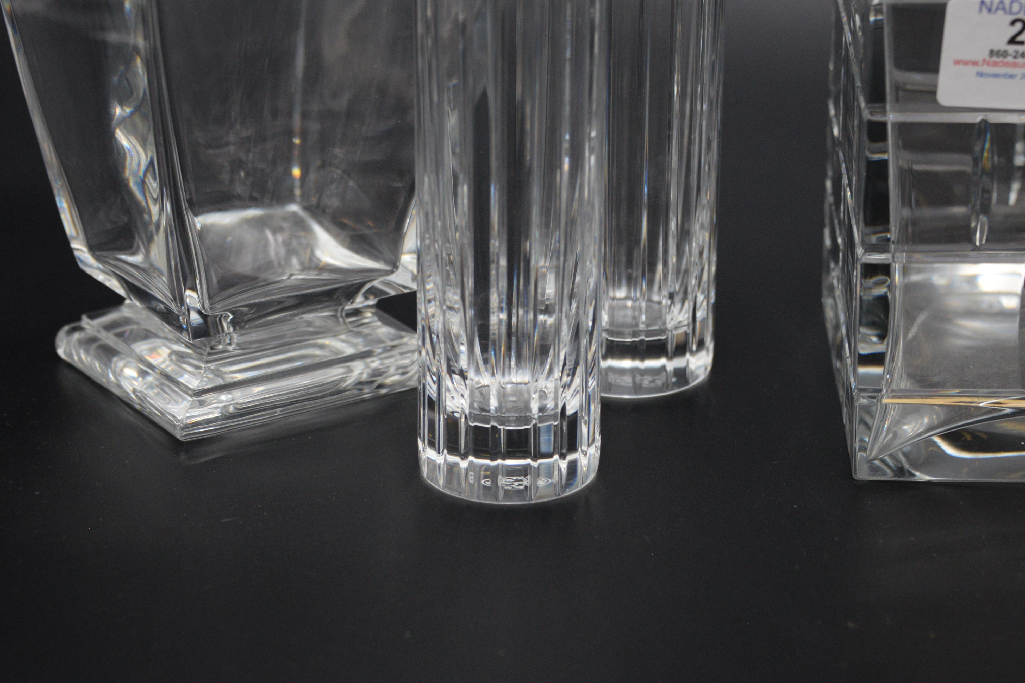 Six Piece Baccarat Crystal Group, two Baccarat harmonie bud vases, Baccarat “Pearl” flower vase, Baccarat “Louxor” vase, two Baccarat cube vases, having chips to base, each signed on base, tallest height 8 1/4 inches