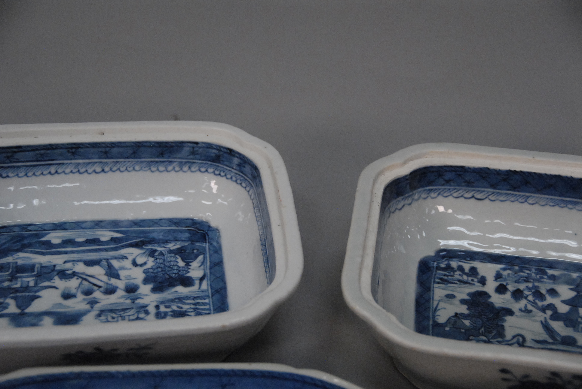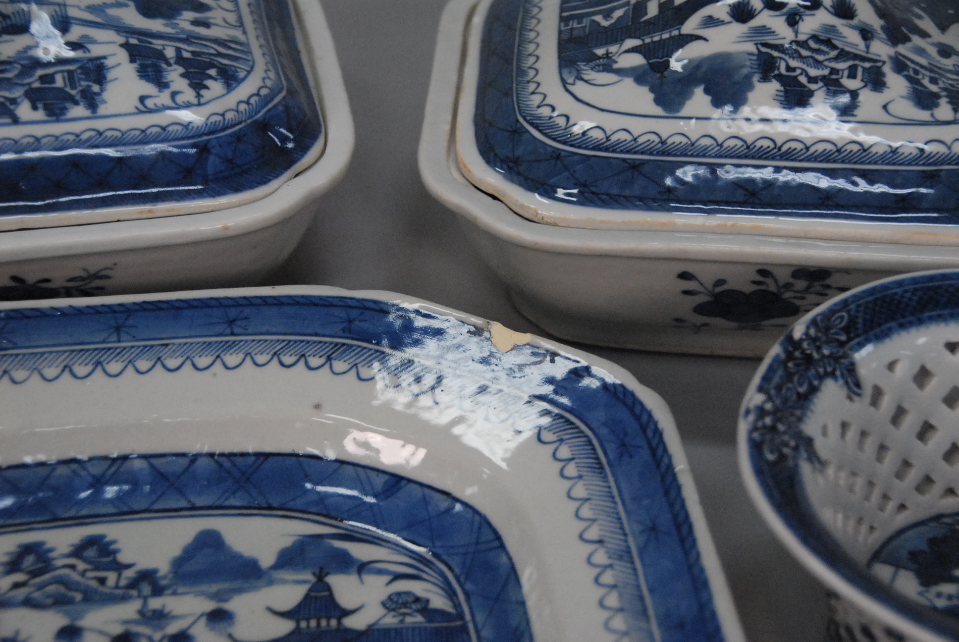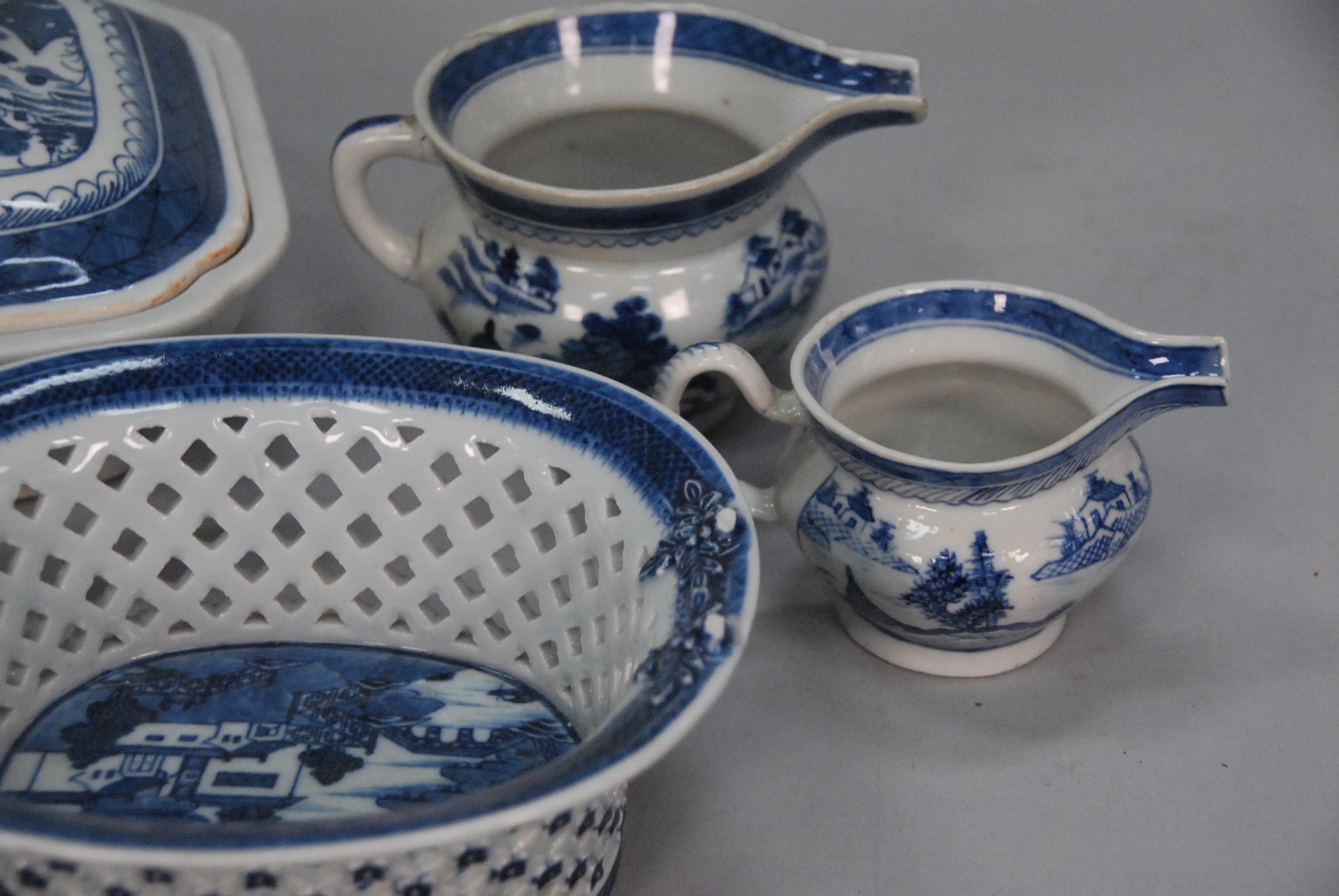 Six piece Canton lot to include platter, two creamers, two covered vegetable dishes, and basket basket handles missing, platter with chip.