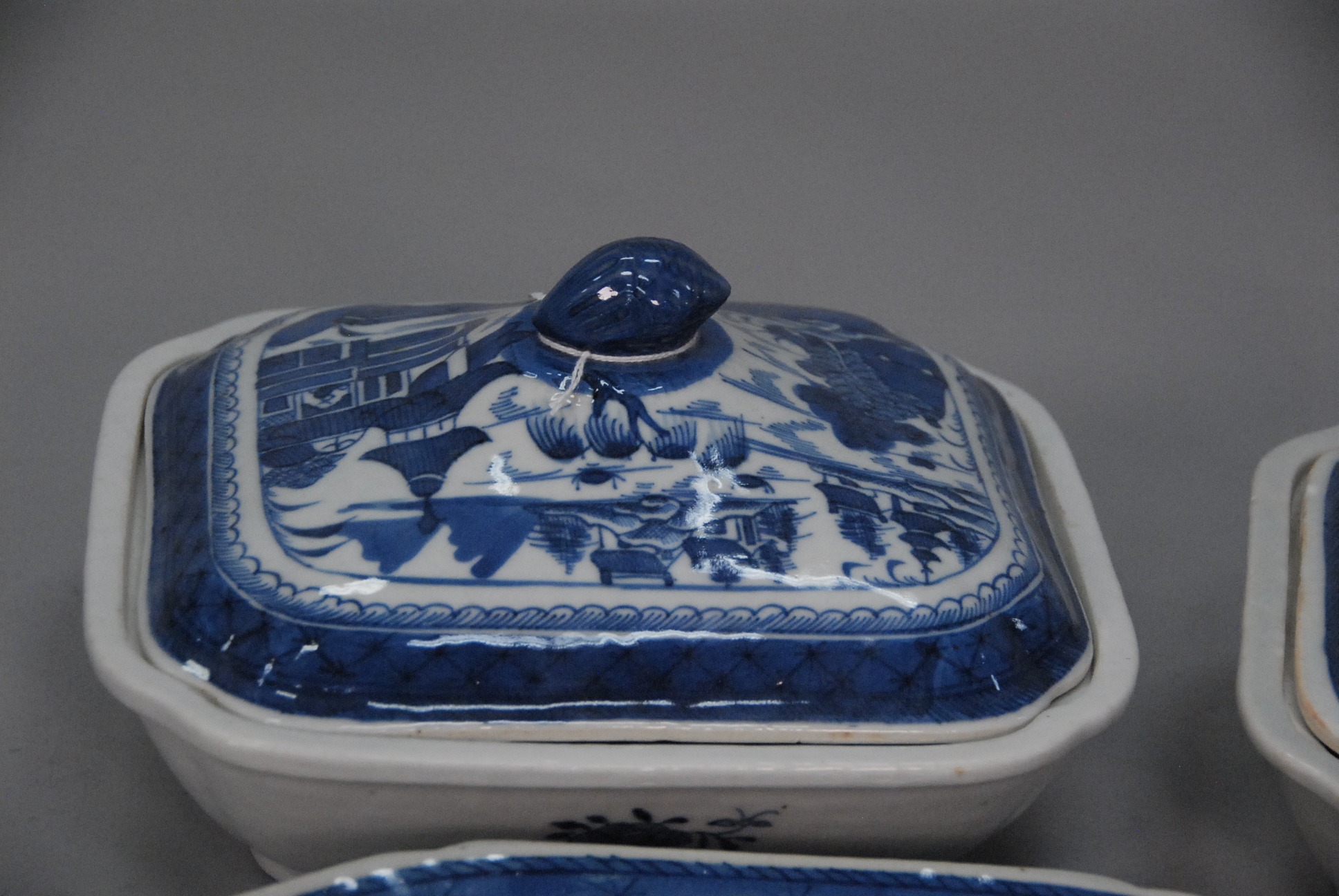 Lot 29: Six piece Canton lot to include platter, two creamers, two covered vegetable dishes, and basket basket handles missing, platter with chip.
