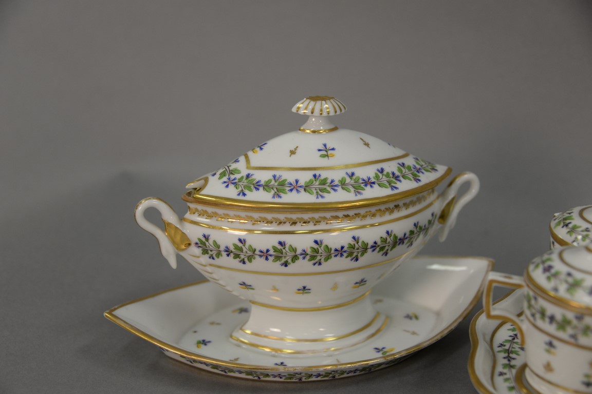 Ten piece Paris Porcelain condiment set including covered sauce boat, condiment tray with seven covered containers, and one covered gravy boat with swan handles. gravy boat: ht. 6 1/4in., lg. 10in. Provenance: Property from the Francis Du Pont Collection drawn from a home in Farmington, CT