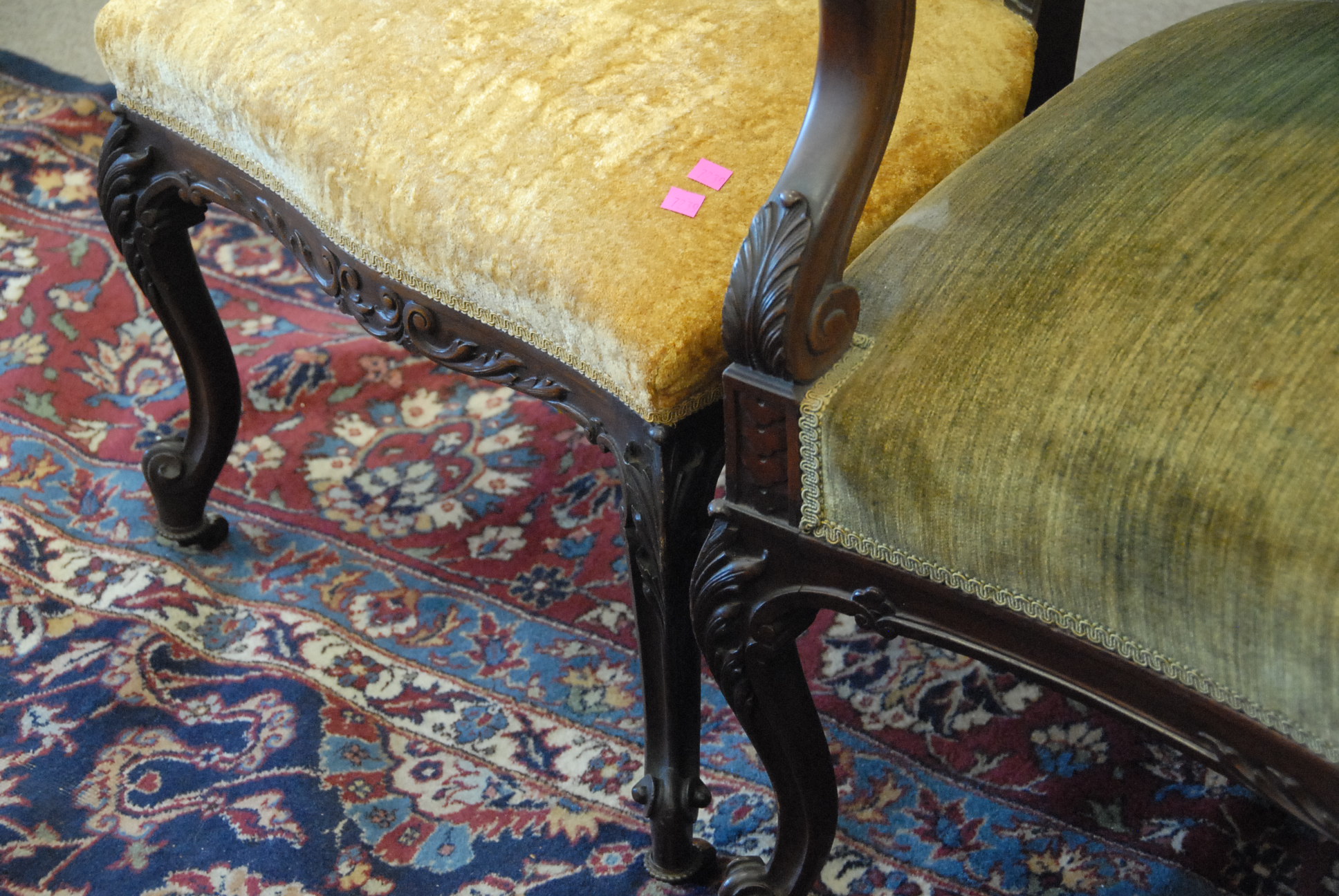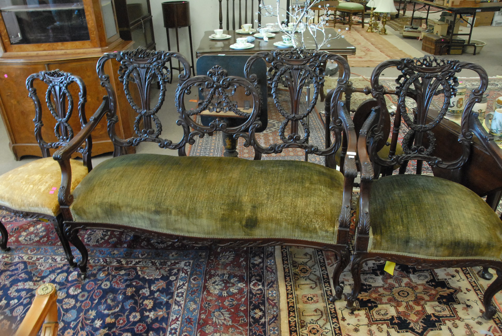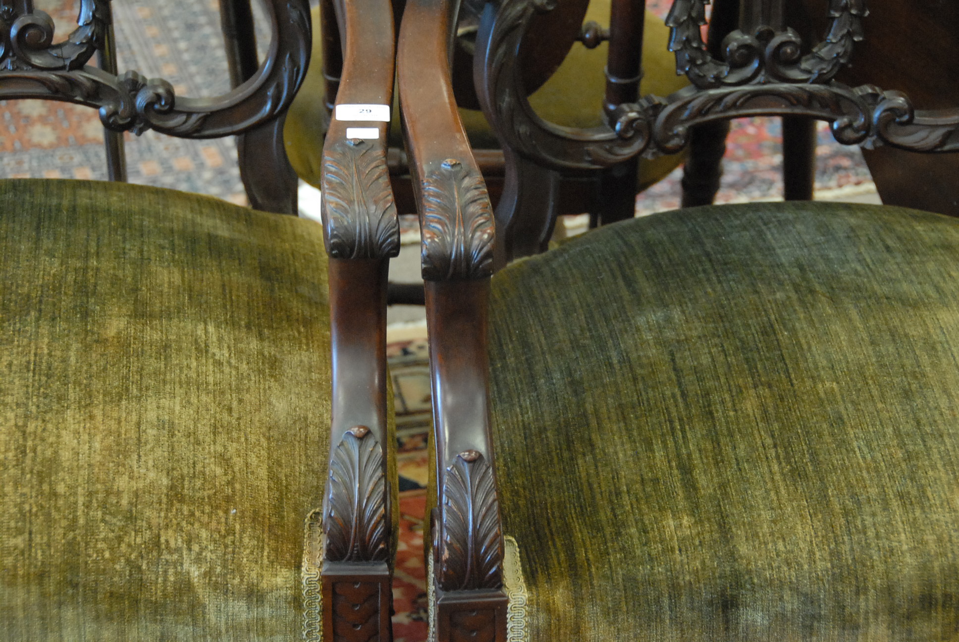 Lot 29: Three piece set to include mahogany settee, armchair, and side chair, all with upholstered seats, settee: lg. 53in.