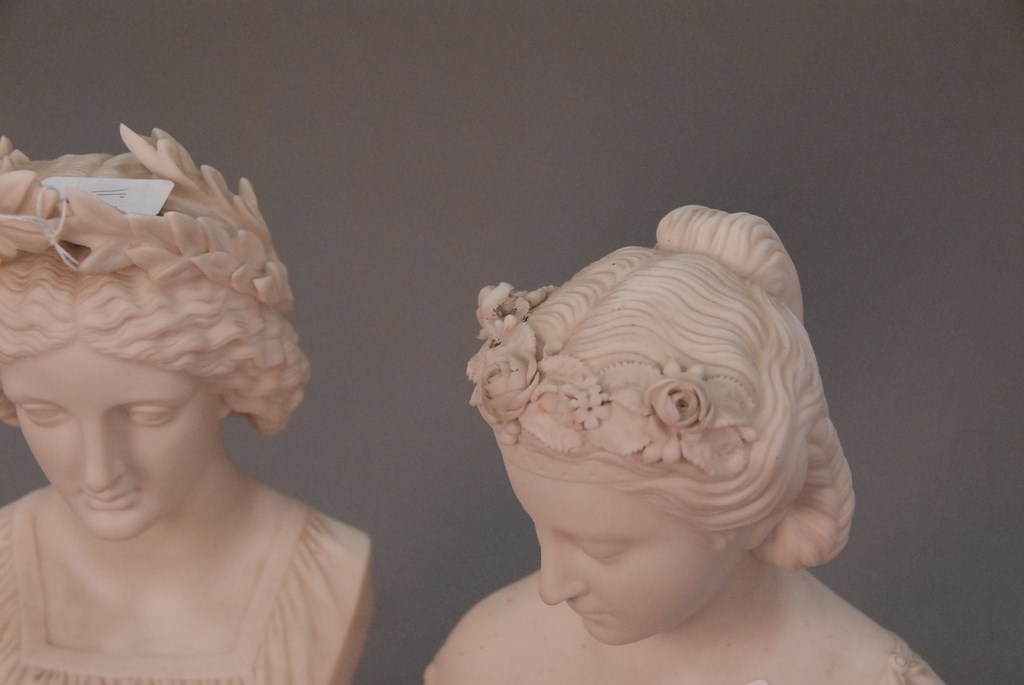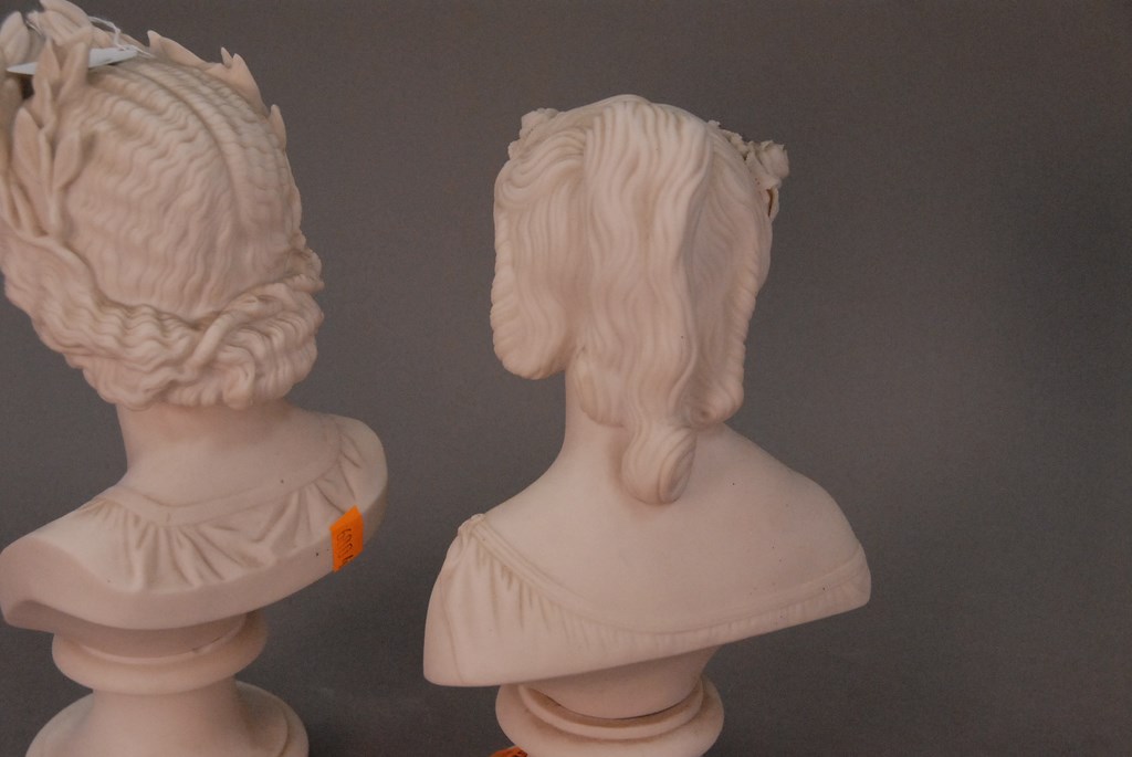Two Bisque figures, busts of women on pedestals. ht. 10in. and ht. 11in.