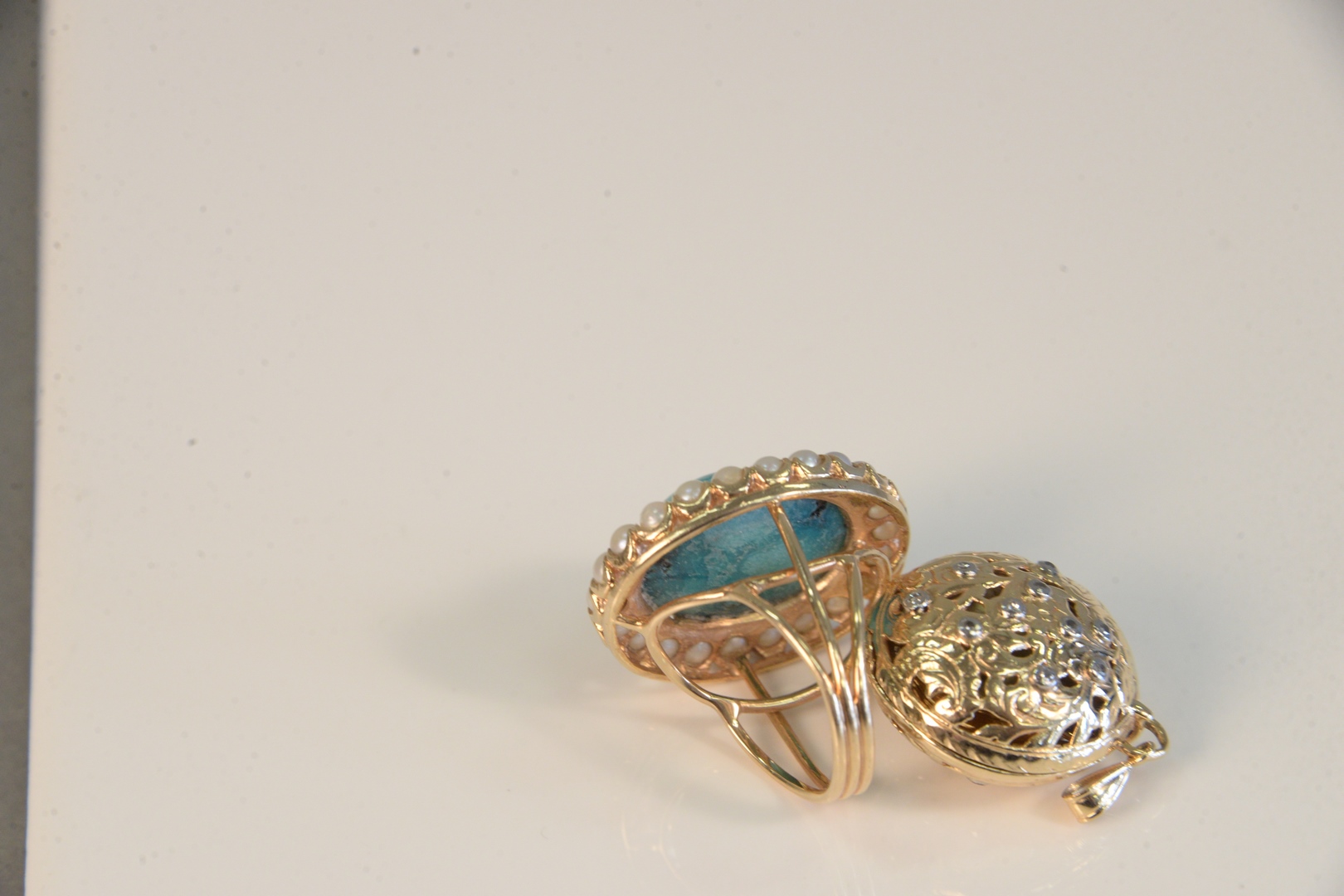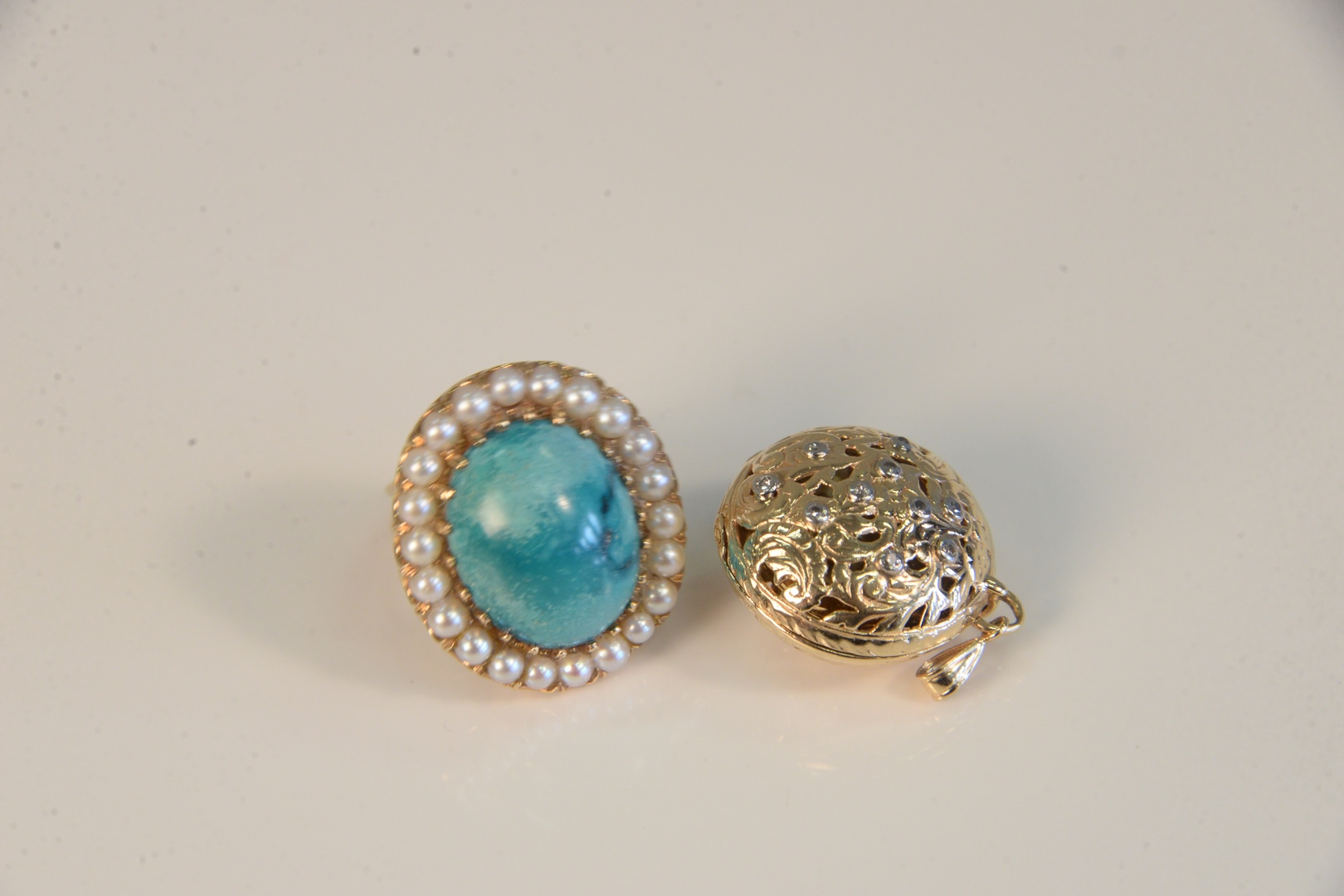 Two piece lot to include one 14 Karat Gold Ring set with cabochon cut turquoise, surrounded by pearls, 13 grams total weight, along with one herb locket with silver repousse case.