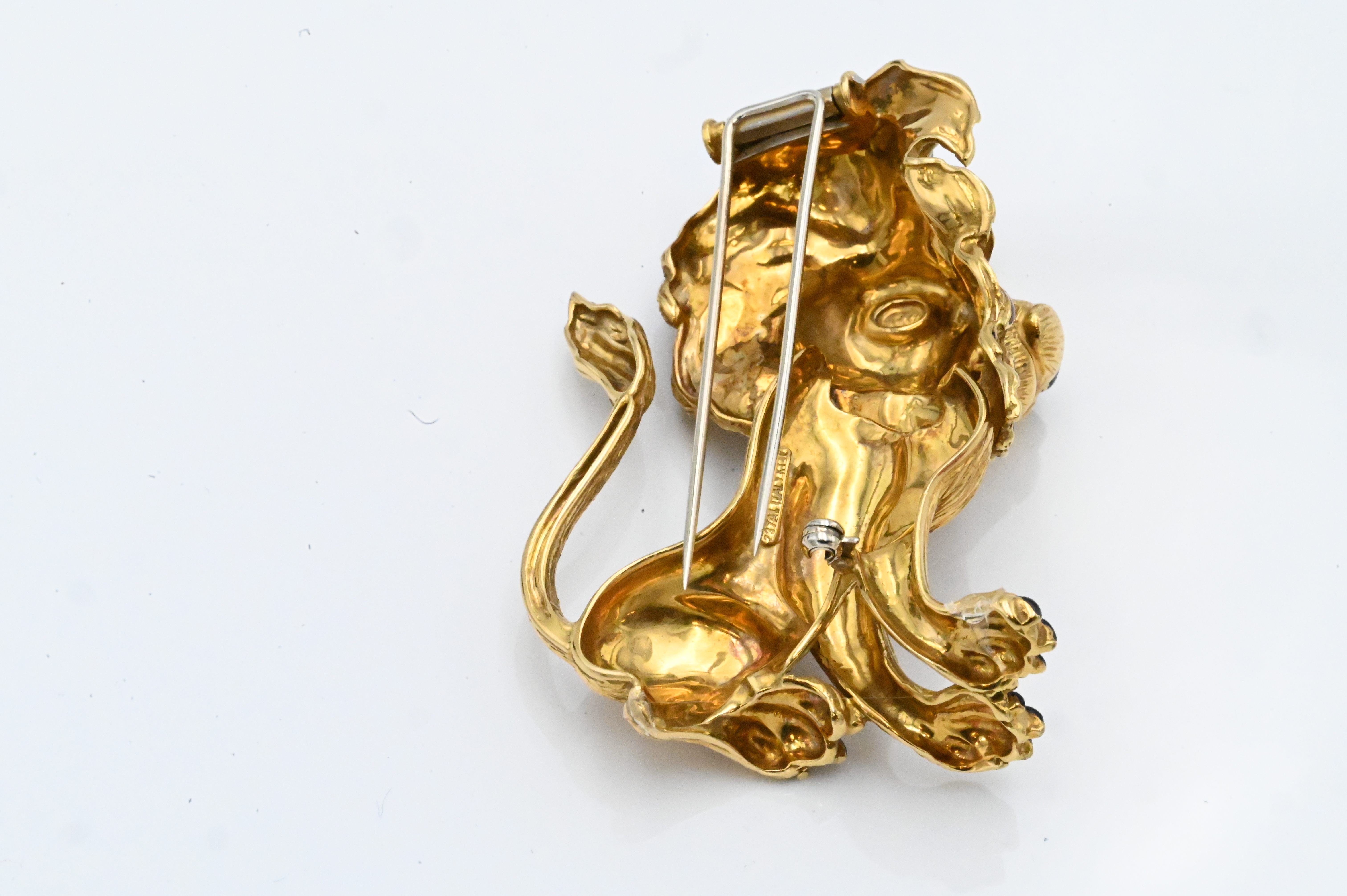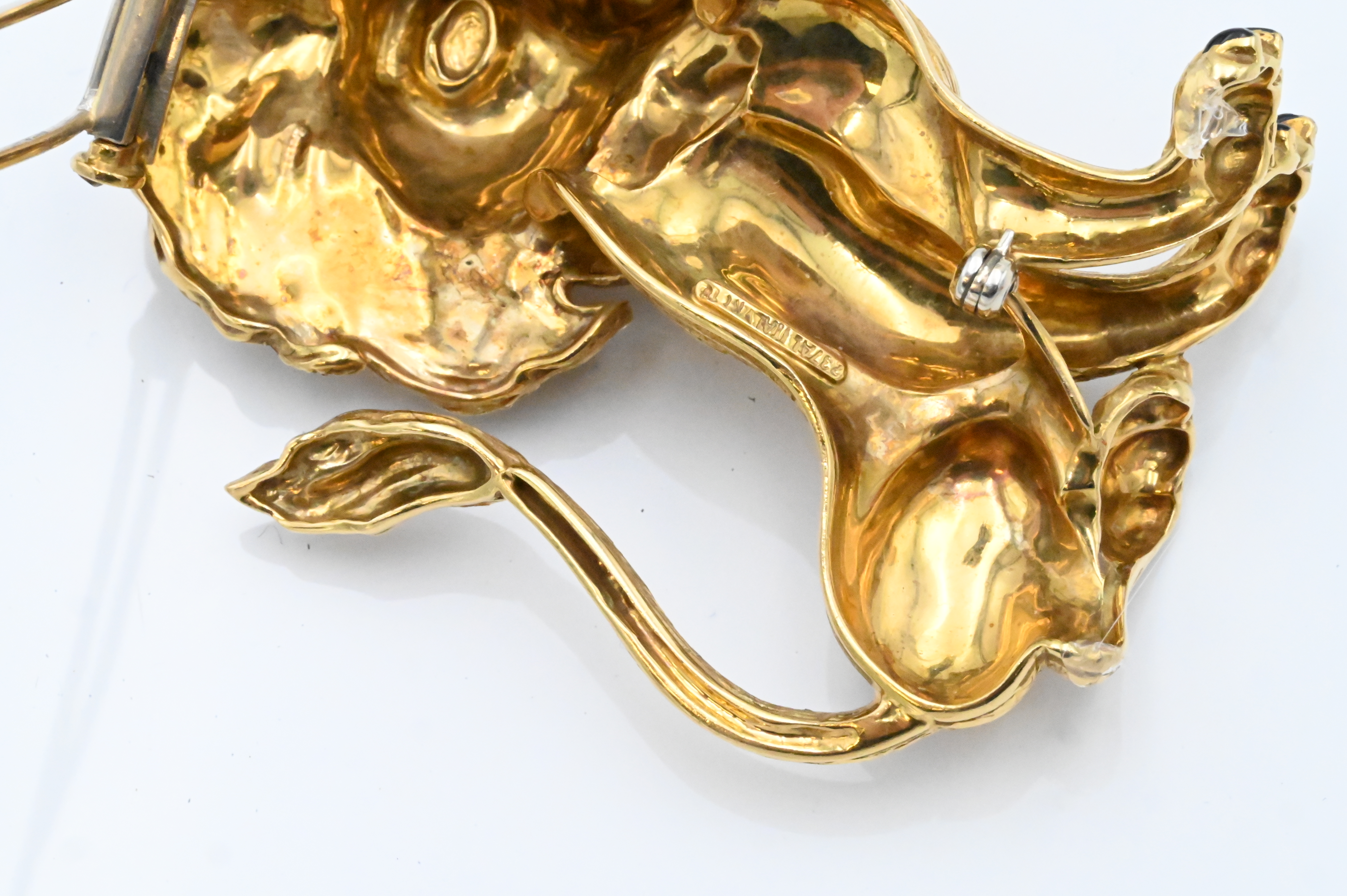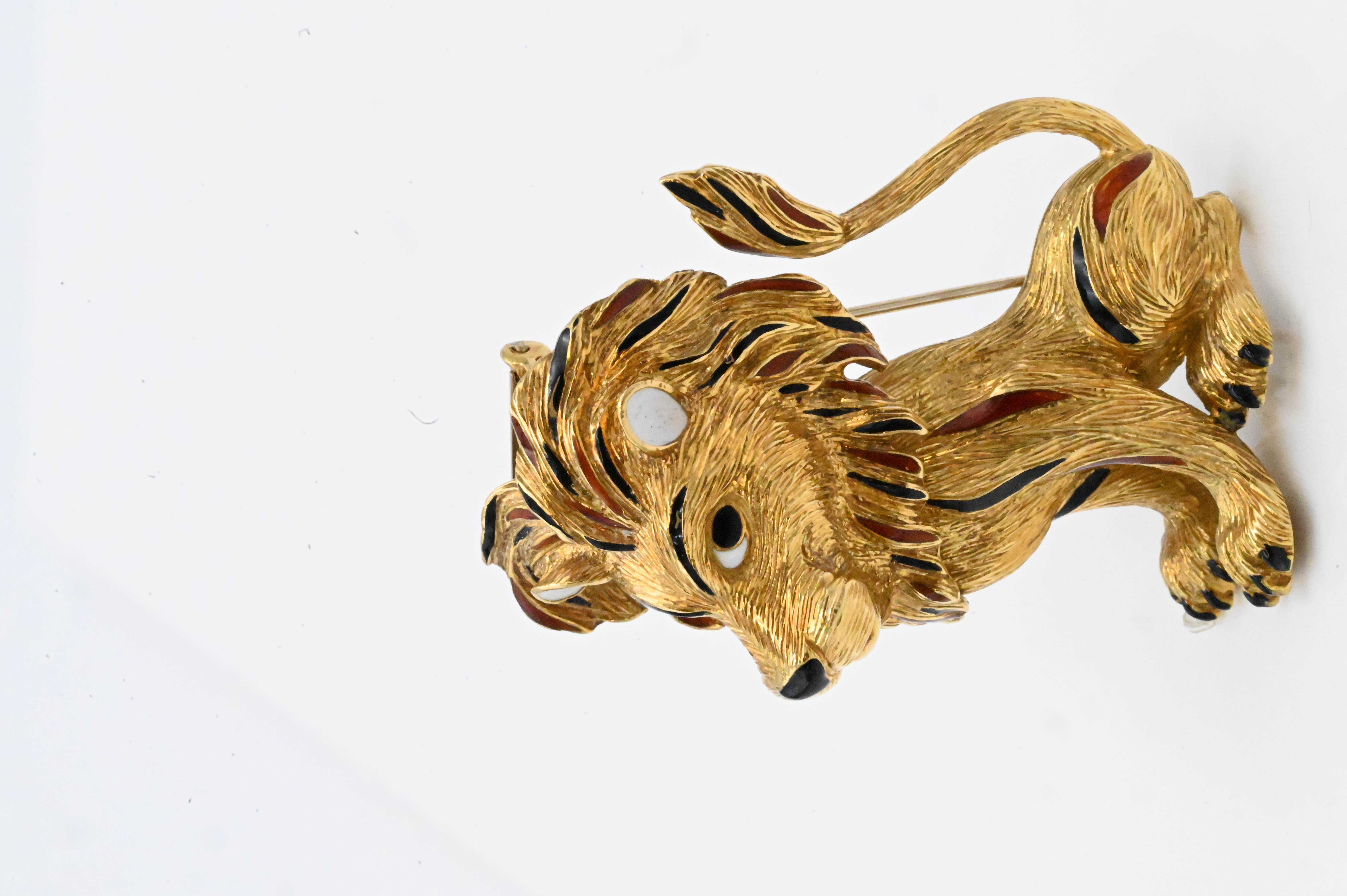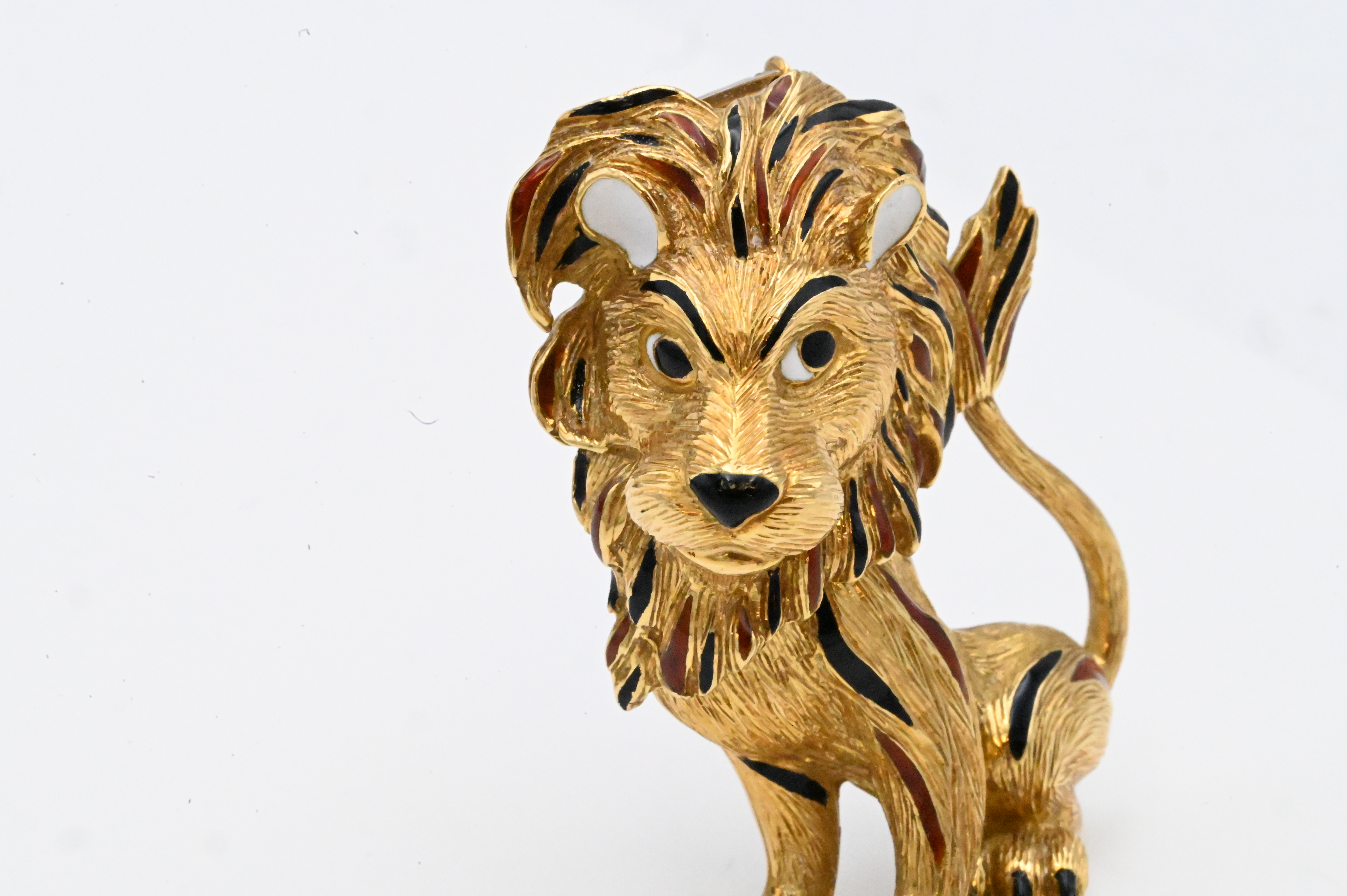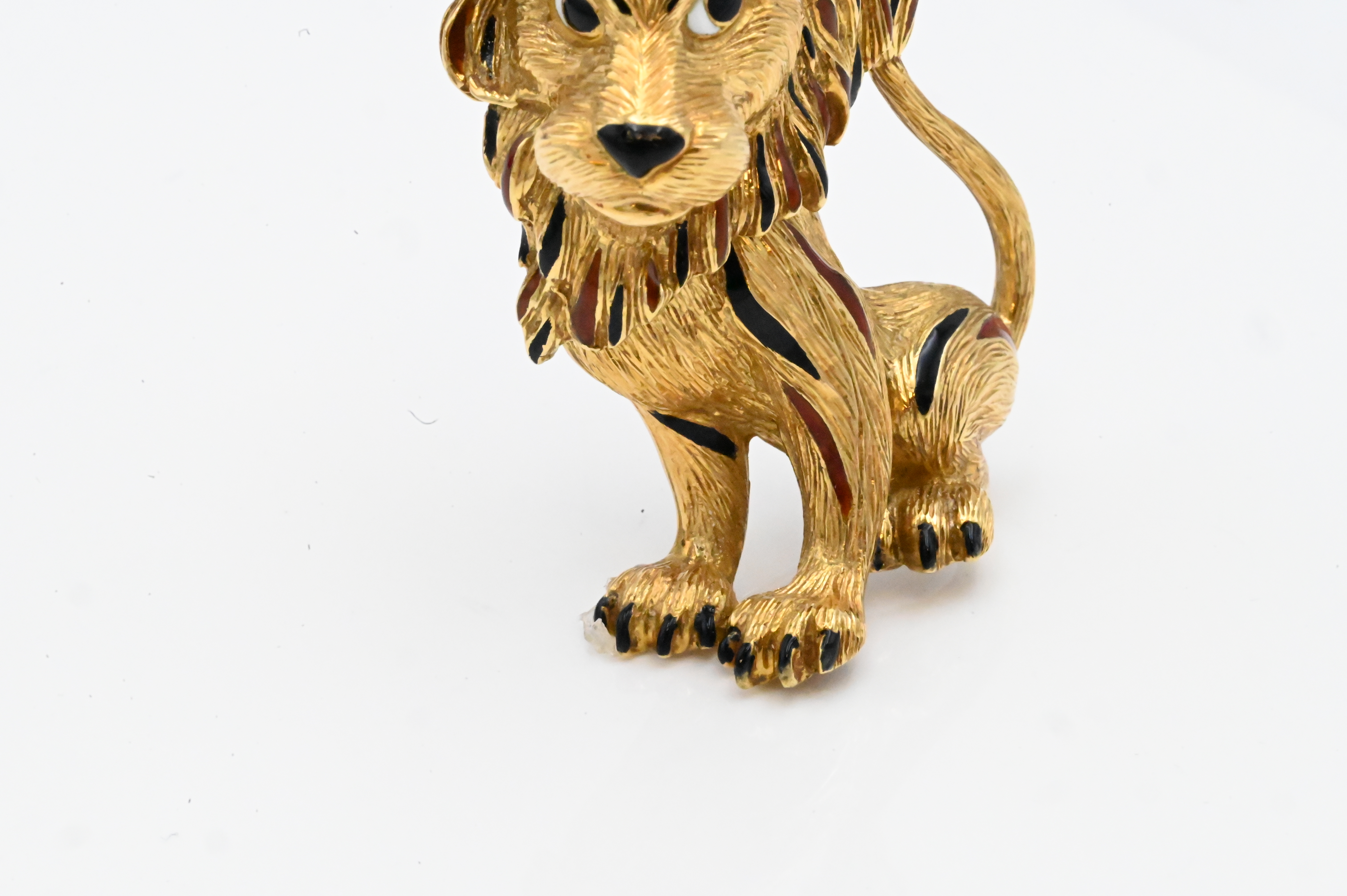 18 Karat Yellow Gold Brooch in the form of a lion, having enameled eyes, ears and accented mane, toes and body height 2 1/4 inches, width 1 1/2 inches, 42.6 grams